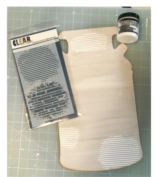 Next I took one of the many new stencils from Clear Scraps ( I'm using the Grunge/Brick mixer stencil) Click Here and taped it down onto my wood shape securely. I love that these stencils have 2 different stencil designs in one. I took my palette knife and spread some Ranger texture paste crackle over the top of my stencil. Let it dry overnight to achieve more cracks.