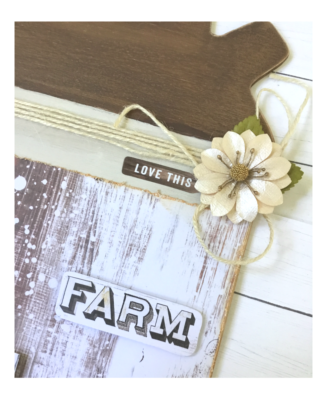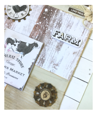 Now you can arrange your embellishments and create the design you want. I took one of the cute journaling cards with the cow, added foam tape to the back, then adhered towards the bottom left side of my wood shape. I glued my chipboard gears in place using Beacon glue. I decorated the top of one gear with a Rooster ephermera piece, adding foam dots to the back before adhering in the center.