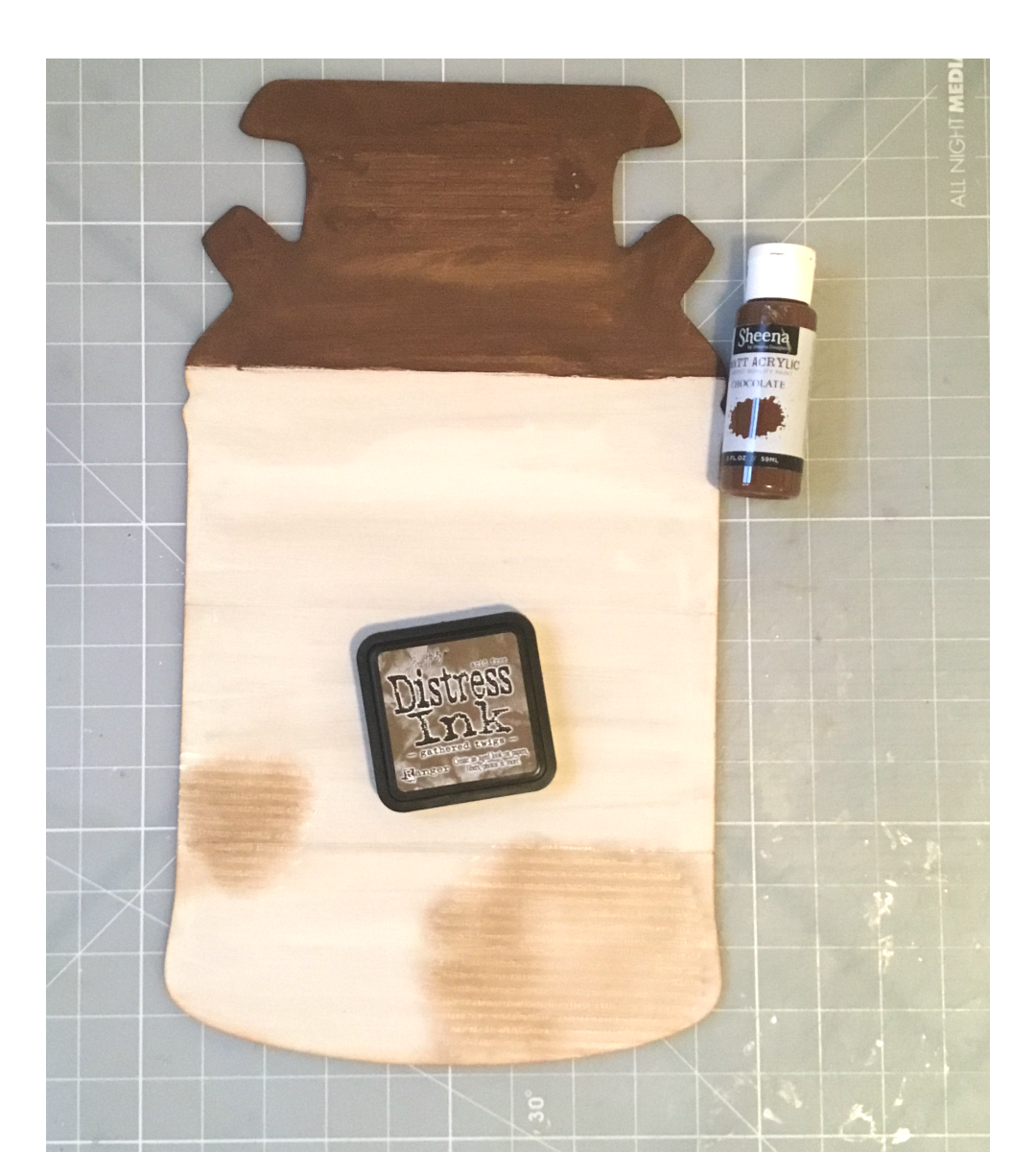 Take some Distress ink Gathered Twigs and with your sponge dabber lightly rub the ink over your stenciled surface. I rub off some of the ink on my dabber before applying. I still want some of the paint to show through. Then I painted the top of my Milkjug with some brown acrylic paint.