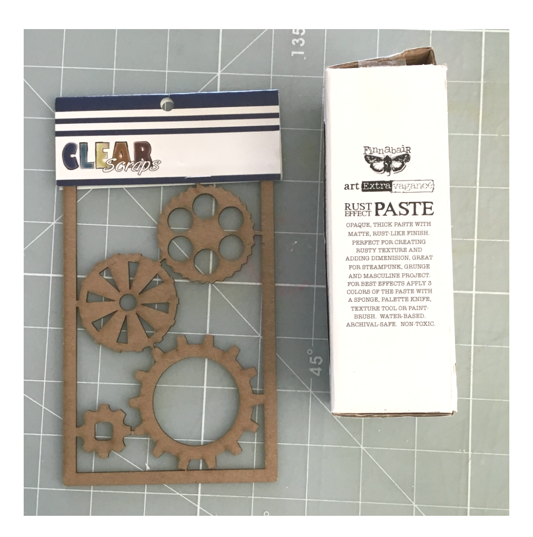 You can save the others for a future project. Using a stiff brush, I applied 3 different Rust pastes (gold, red and brown)onto each gear chipboard piece, using a punching motion. Keep layering the rust pastes until you achieve the desired look you like.