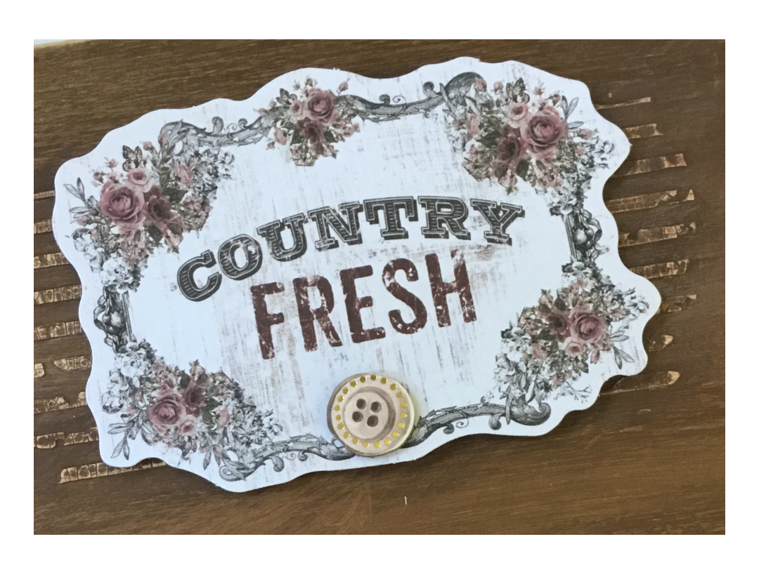 At the top I added foam dots to the back of my ephermera piece "Country Fresh" and adhered a chipboard sticker button below.