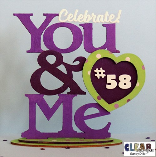 I cut out the word Celebrate using fun foam and attached it to a piece of acetate leaving a longer piece in front of the word to attach to the Y in You. (I like to use glue dots for these kinds of things because it is neat and holds well). I also cut the #58 from the same white foam and attached it to the heart.