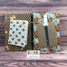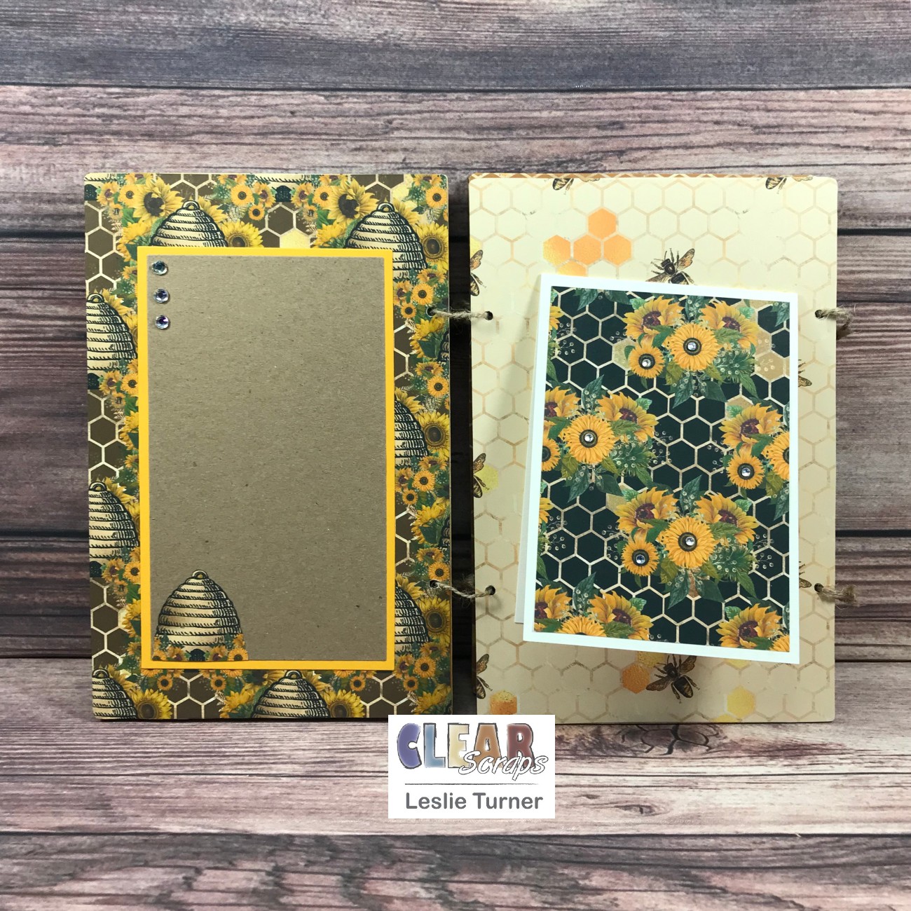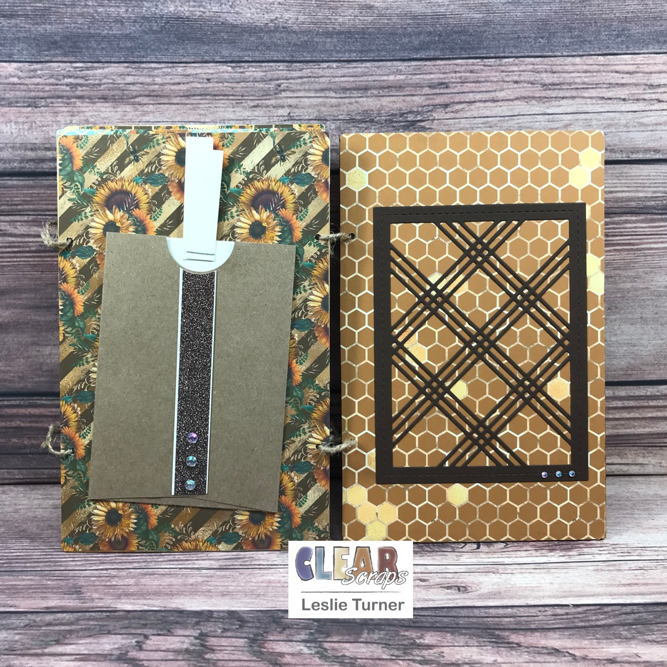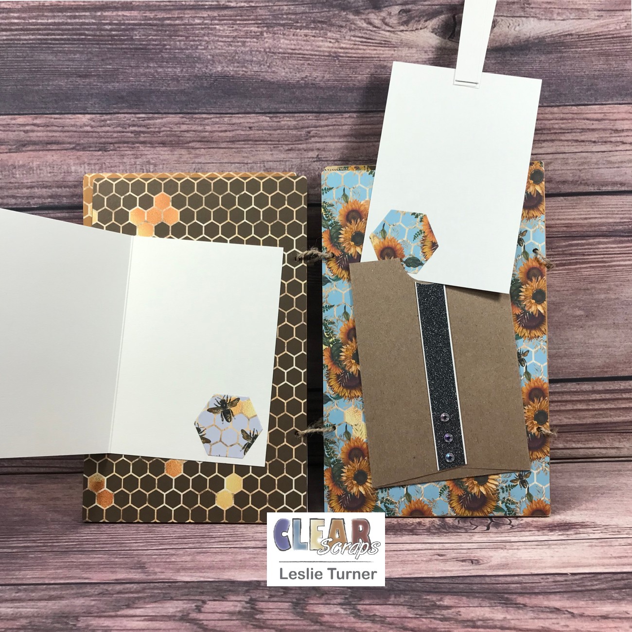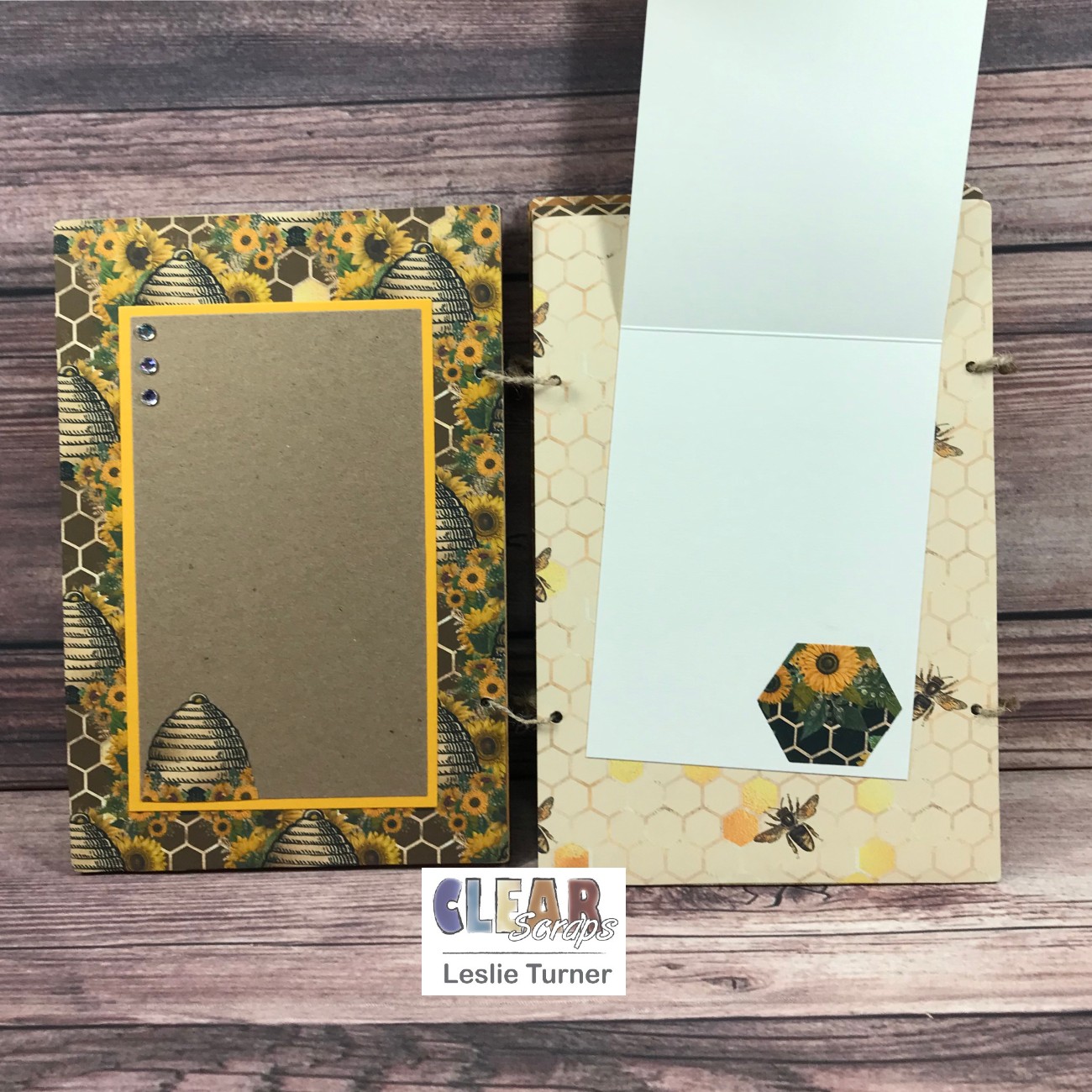 I had some digital papers in my stash with bees and sunflowers (my favorite flower) so I printed several of them to cover the album pages. I added space for photos and/or journaling on each page, with a flip-up, a couple tags and a side-flip, all embellished with cut-outs, die cuts, glitter washi tape and/or gemstones. I connected the pages with jute rope.