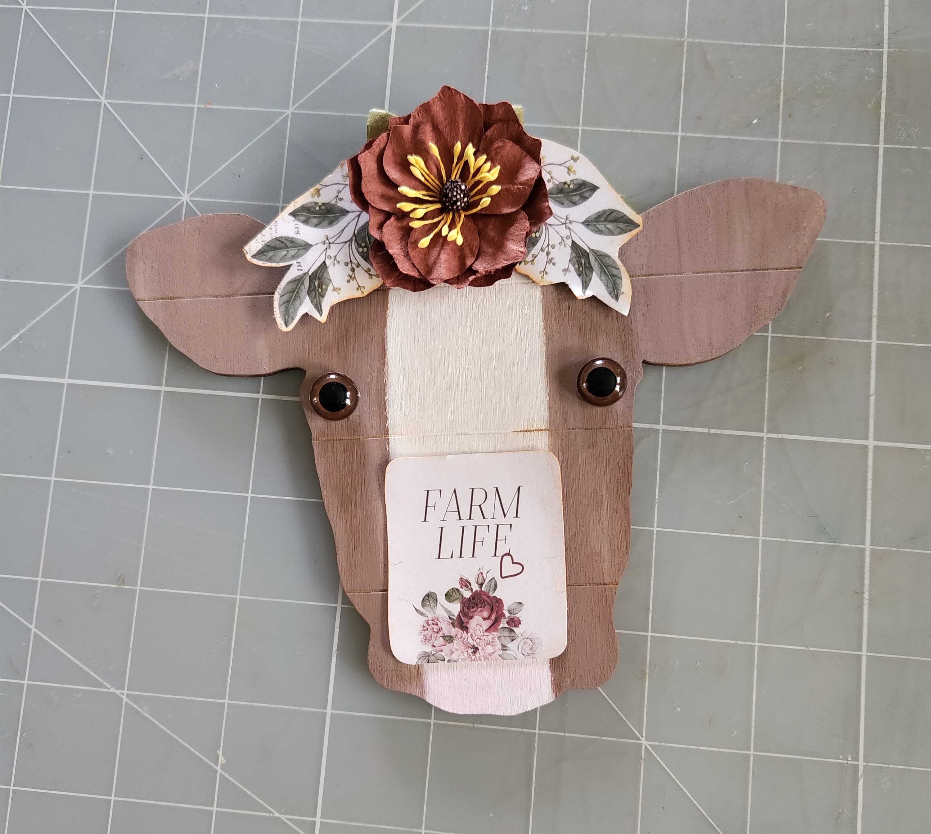 Next I chose a paper flower and acouple ephemera pieces to decorate my cow's face. I applied foam dots on the back of my floral ephemera piece and adhered on the top of my cow's head. Then I adhered my paper flower on top! I adhered an ephemera sentiment towards the bottom of my cow's mouth. Then using hot glue, I adhered a piece of magnet onto the back of my wood shape.