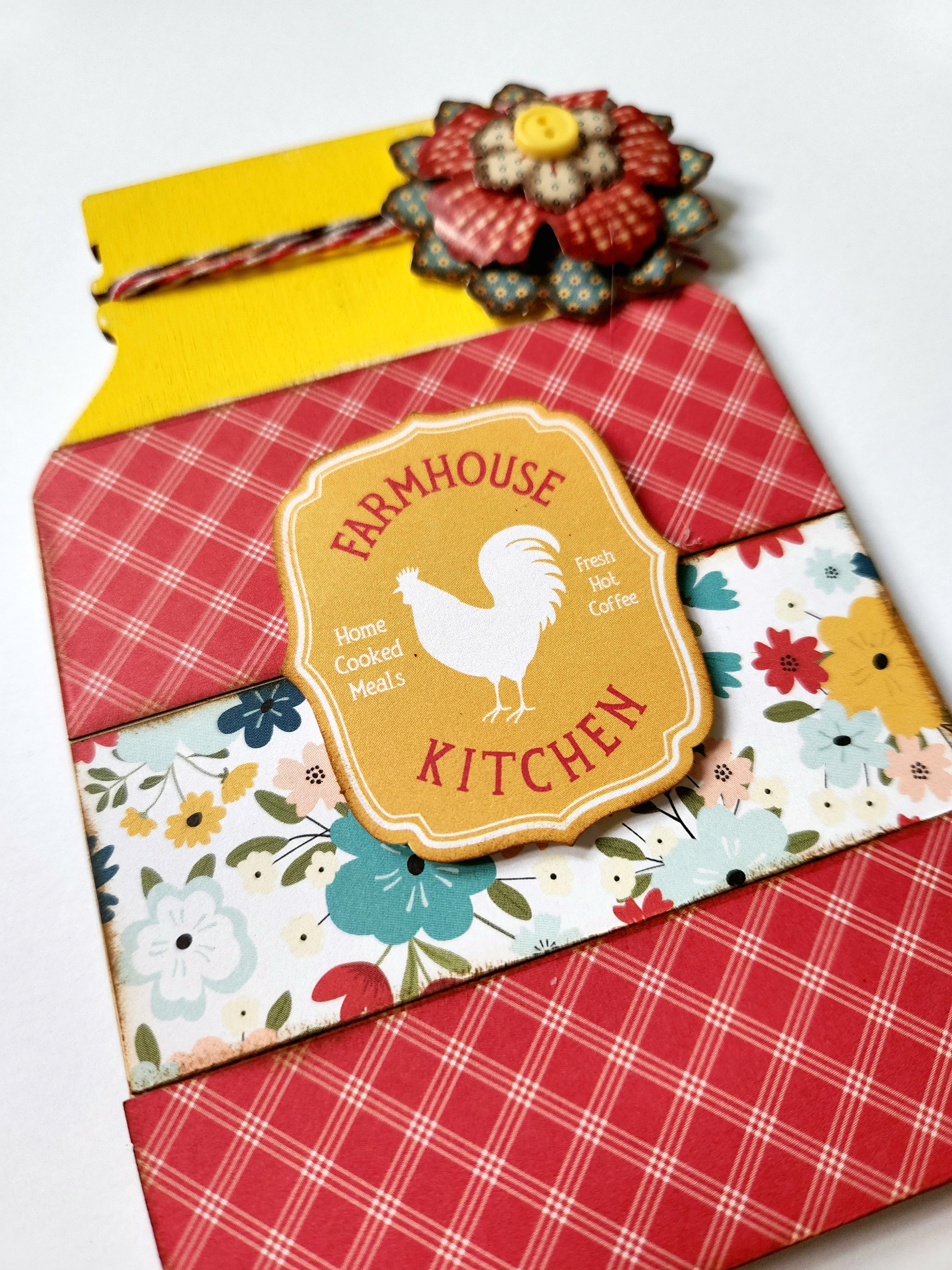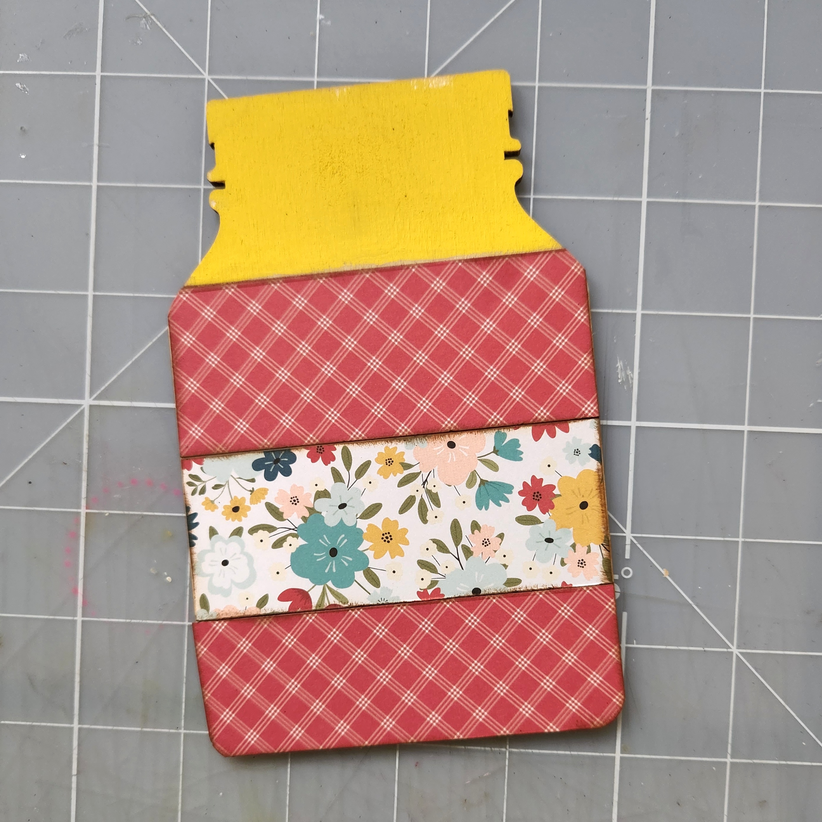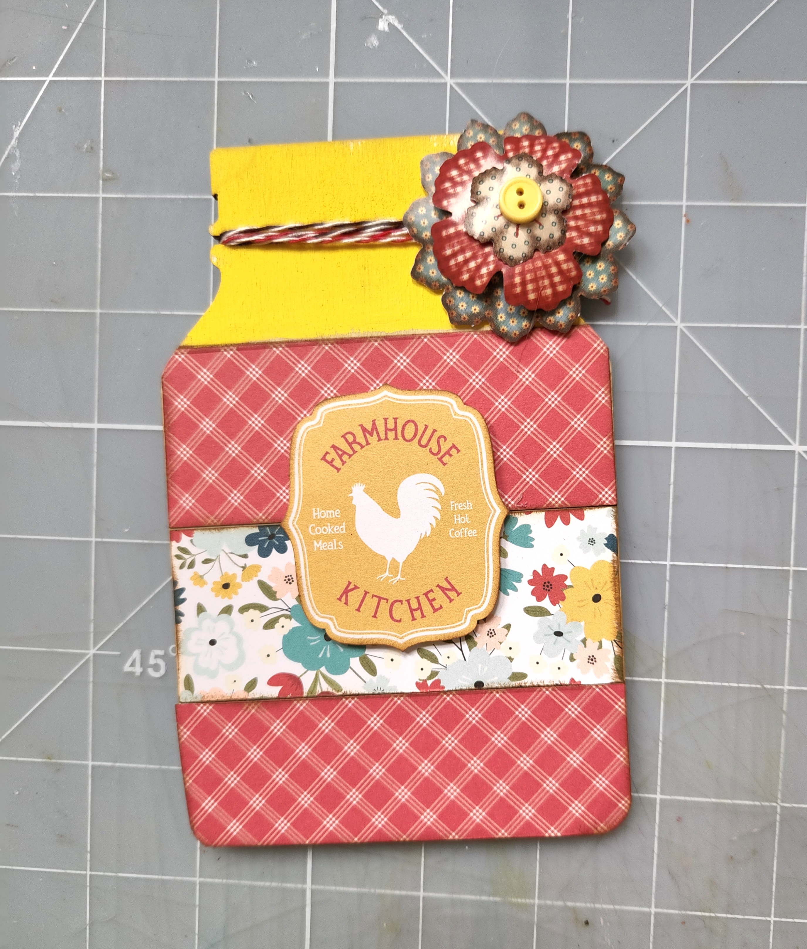 Now I chose 2 coordinating papers from Echo Park's Farmhouse Kitchen collection. I cut 2 papers measuring 3 & 3/4 x 1 & 1/2 inches from the red plaid patterned paper. Inked my edges with Distress Ink and adhered to the top and bottom spaces on my Mason jar shape. The other floral paper measures 3 & 3/4 inches x 1 & 1/4 inches. Ink around the edges and adhere to the middle section of your Mason jar.
