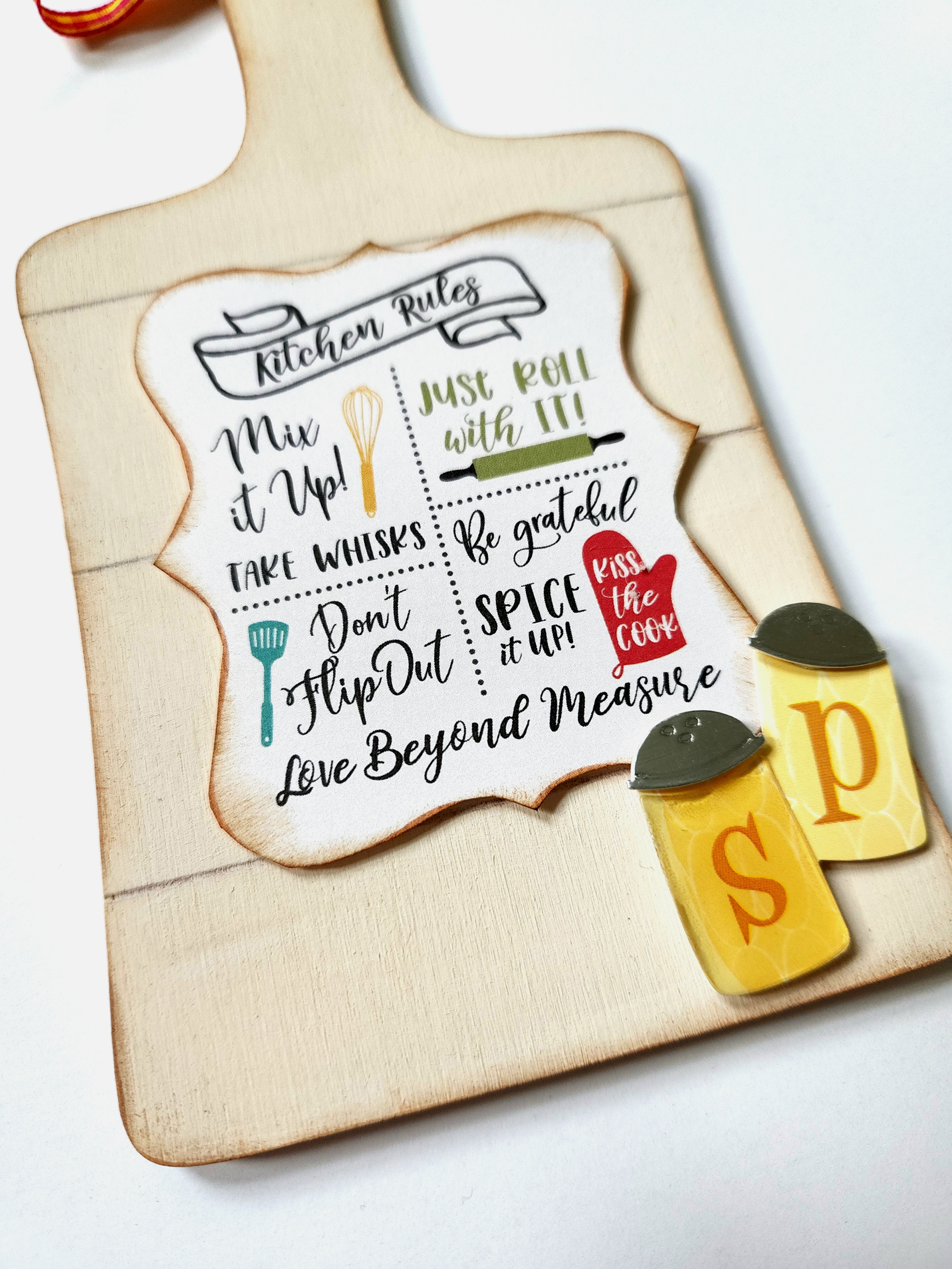 I chose another ephemera sentiment, inked the edges of both my ephemera piece and around the wood cutting board. Then applied foam dots to the back of my sentiment and adhered to the center of my cutting board shape. Then I tied a ribbon through the hole at the top of my cutting board and tied into a bow. I adhered a cute 3D salt/pepper sticker towards the bottom right corner of my wood shape. To finish I glued a magnet onto the back of my wood shape.
