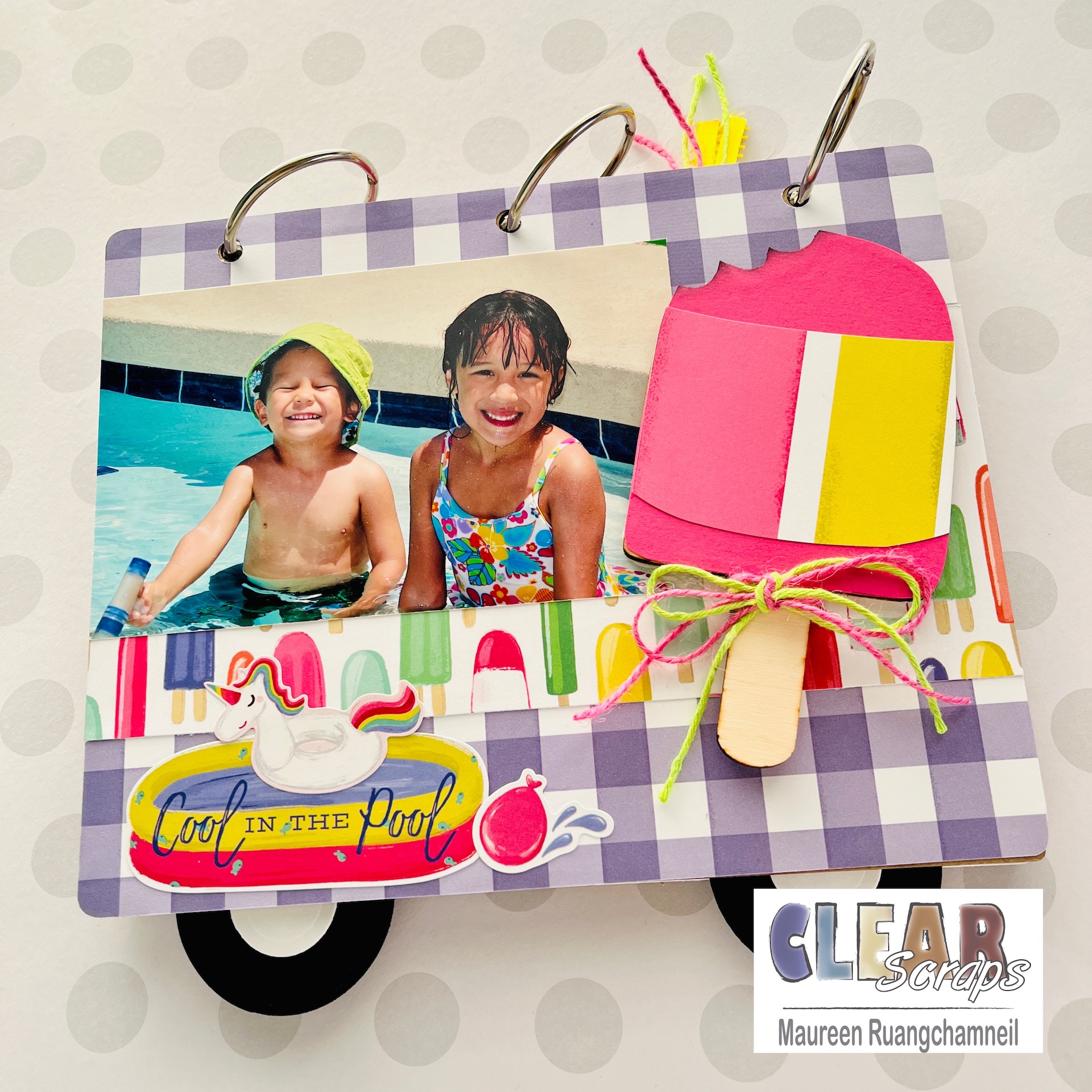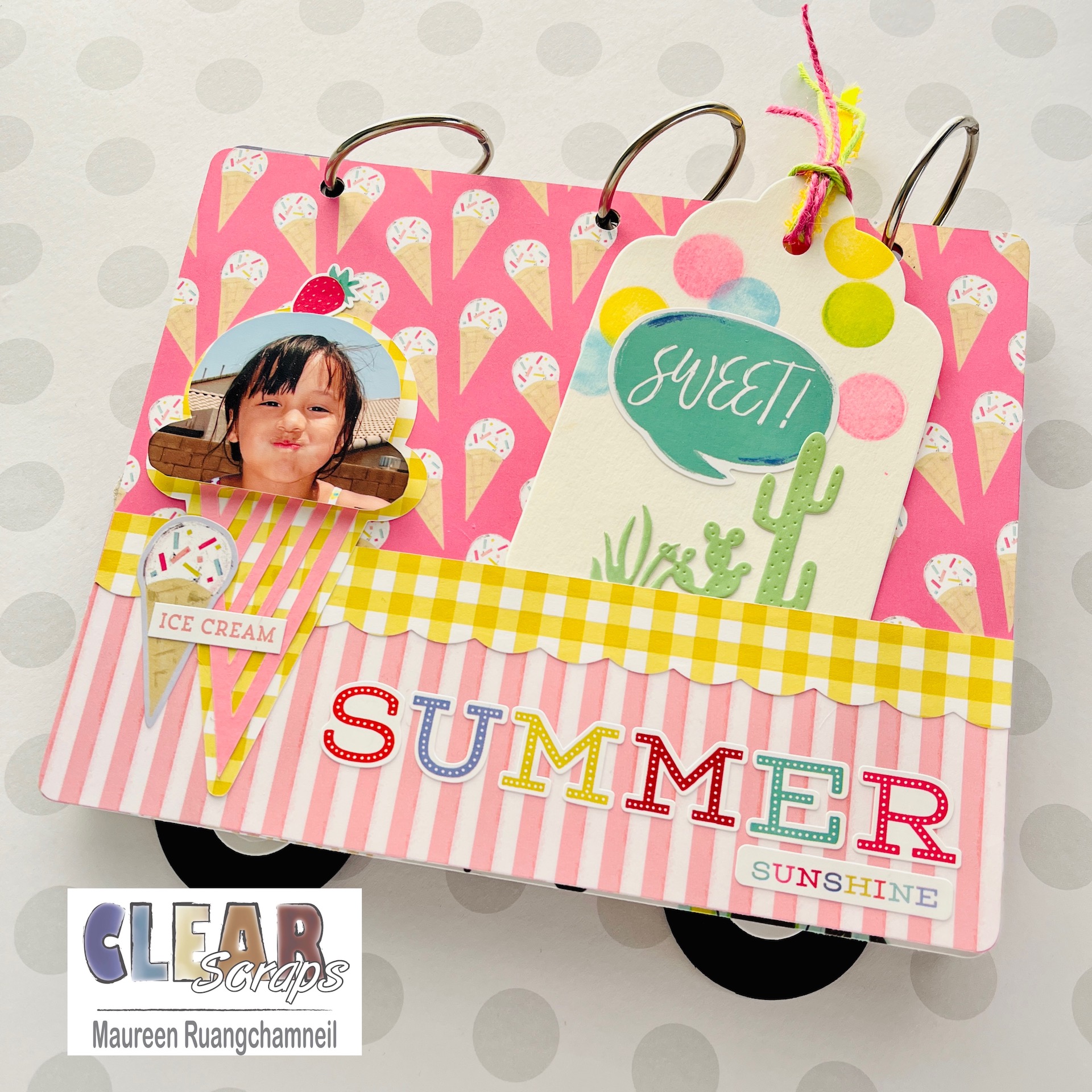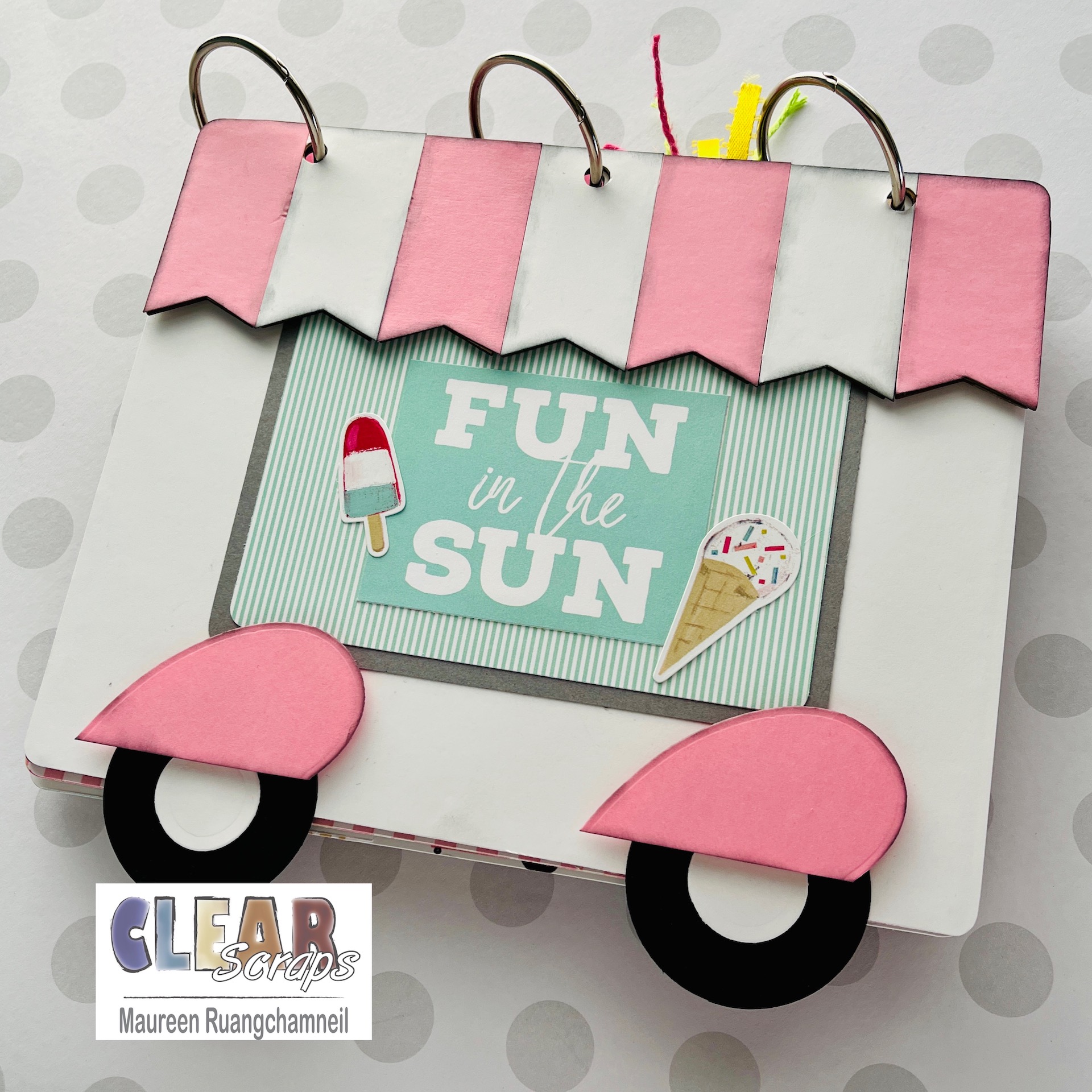 This adorable ice cream truck comes to life with the amazing new chipboard albums by Clear Scraps. I saw the shape of the Banner Chipboard Album and couldn't wait to get started creating a pink and white canopy, just like on an ice cream truck. With this, and the cute papers by Echo Park, your album will come together in no time!