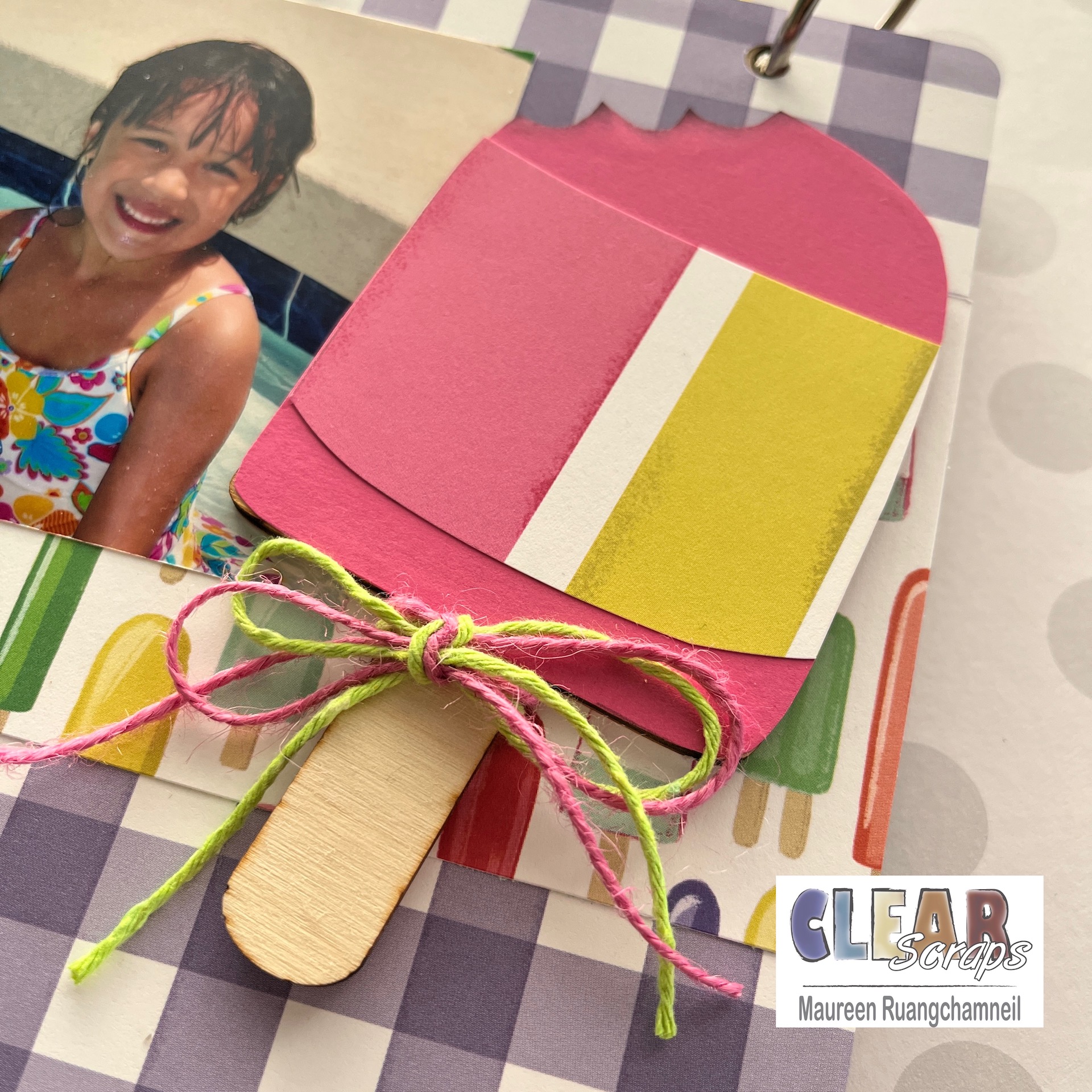 This page is another layout using more patterned papers and some fun stickers, but this time I chose the popsicle wood piece from the Wood Summer Collection. This is covered with a pink and patterned paper and then tied up so cute with a couple colorful twine pieces. I've also dusted the edges with some ink, where it looks like a bite was taken. What an adorable addition for an ice cream truck theme! Here is a close up of the popsicle wood shape.