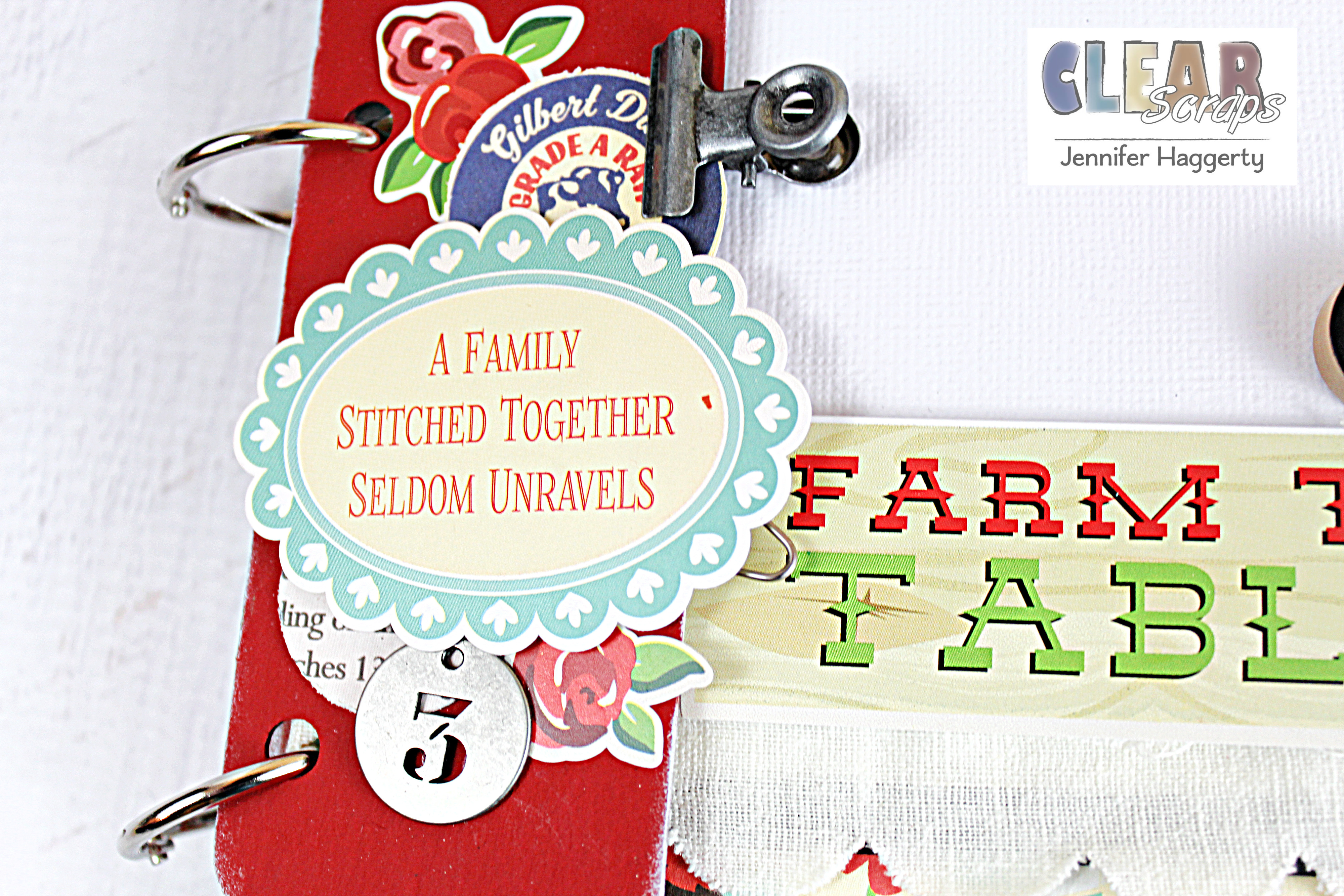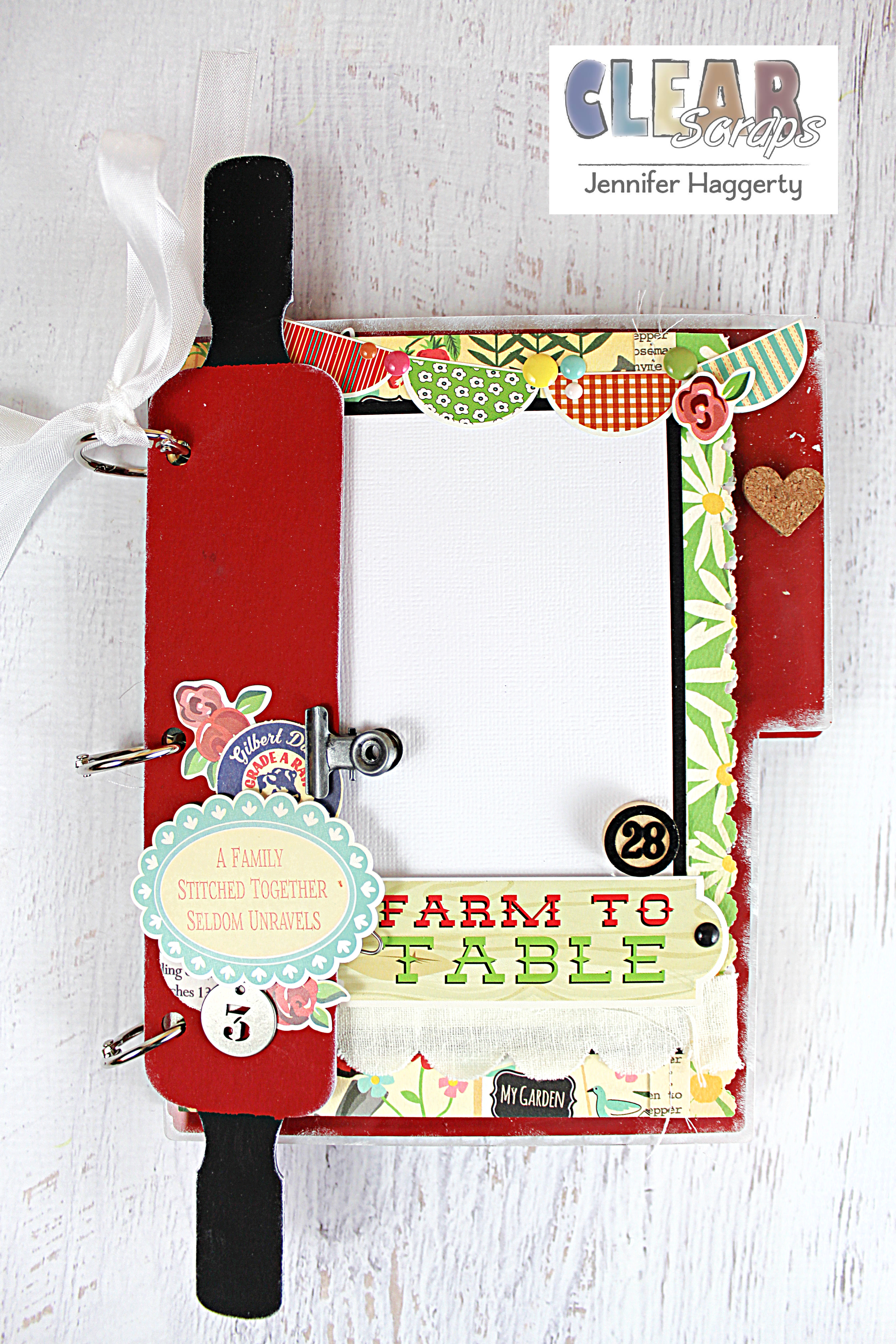 Additional products used: patterned paper, stickers: Carta Bella; cardstock: Bazzill; adhesive: Beacon, Tombow, Thermoweb; paint: FolkArt; metal embellishments: Ranger, Maya Road; ribbon: Pink Paislee, Snug Hug; bakers twine: Whisker Graphics; enamel dots: Simple Stories; pigment ink, wood numbers: Ranger; stamps: American Crafts; score tool: My ScorPal; punches: EK Success, Paper Shapers; sewing machine: Janome; misc: chrome book rings, cork heart stickers, thread.