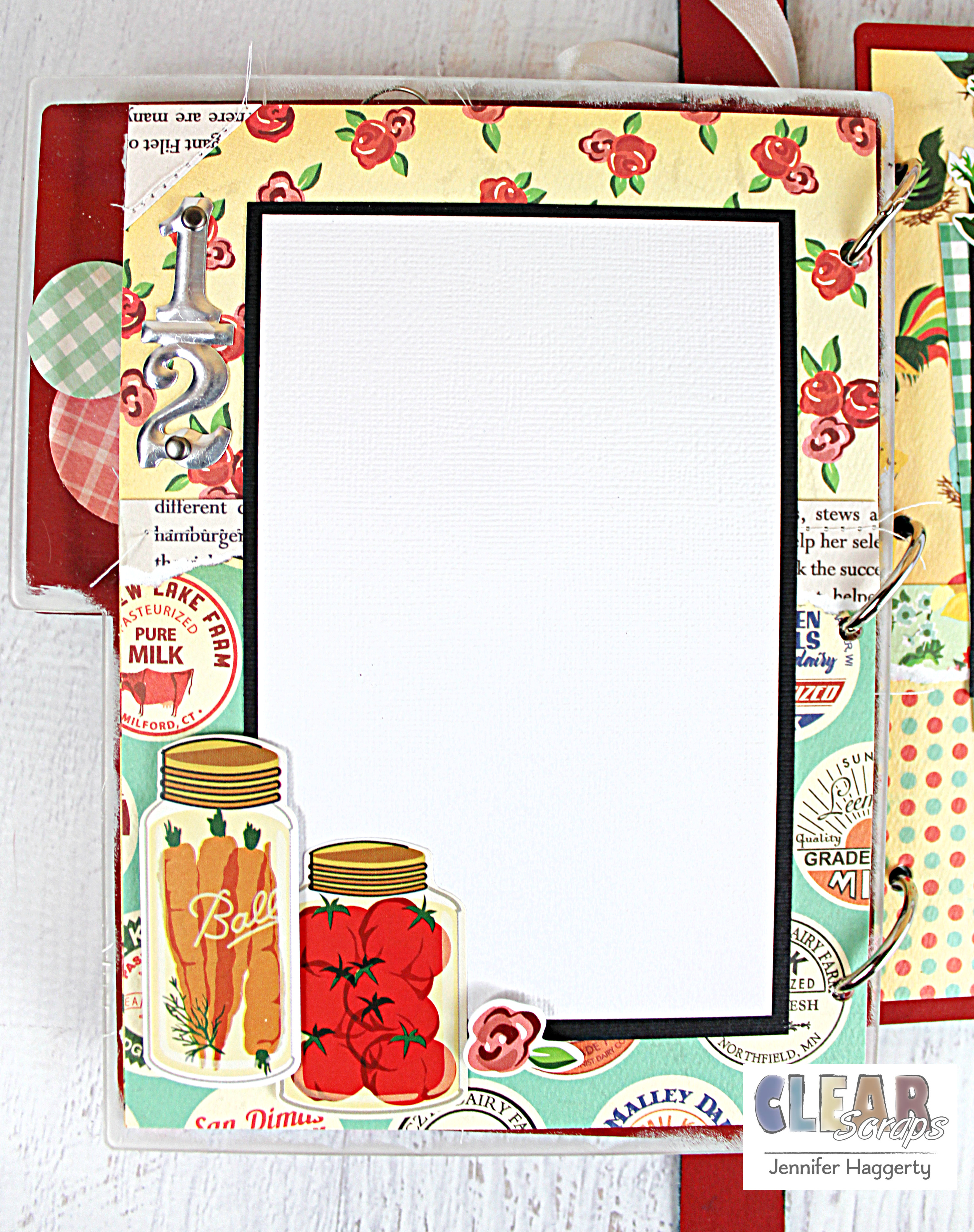 I left spaces for 4×6 photos or recipes on each page with white cardstock. I matted each onto black cardstock as well as added a piece of patterned paper behind.