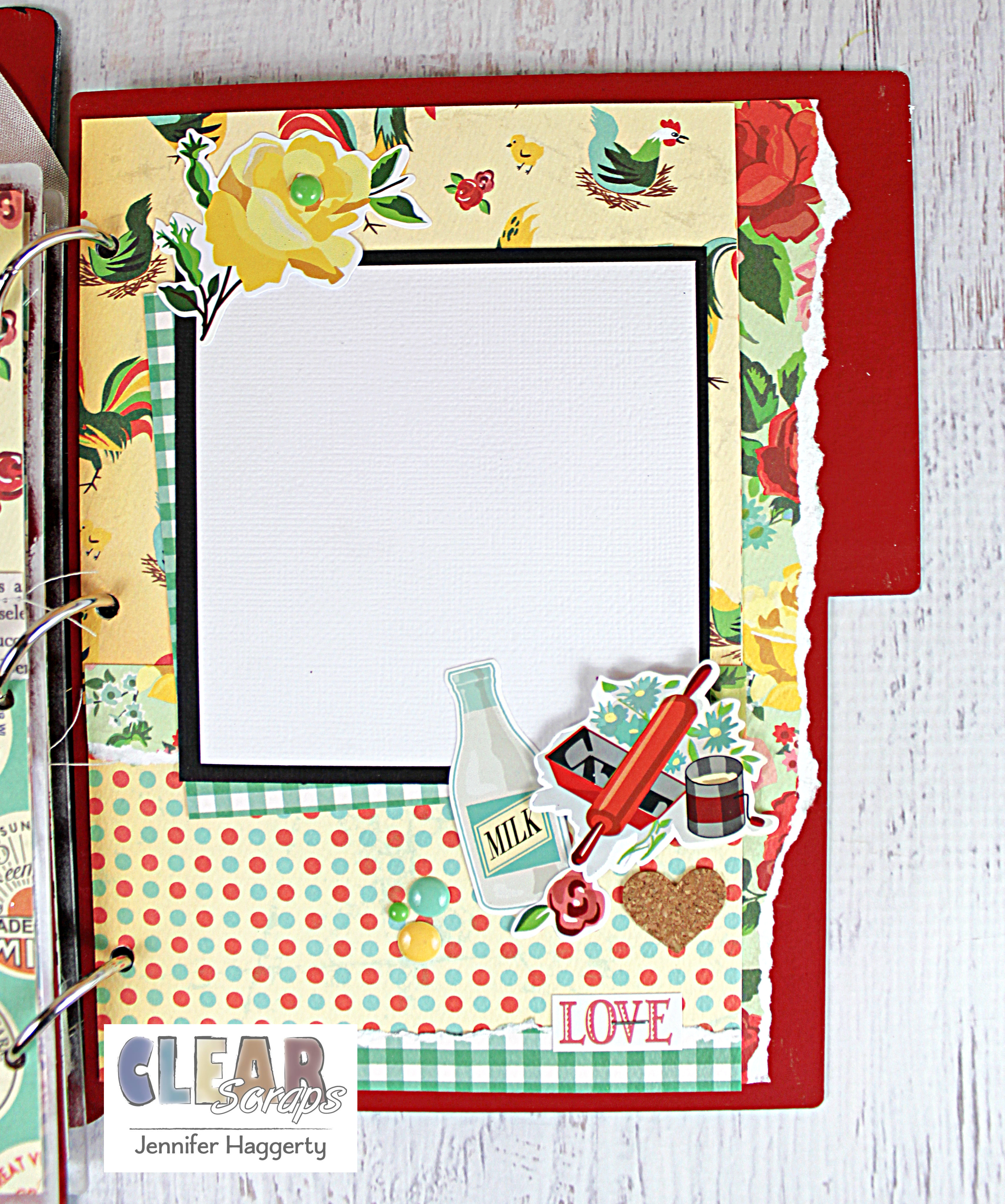 My next page is chipboard which I painted in the same red color as the rolling pin. I had my tabs facing the same way but you can definitely "flip" each one to alternate. There is no wrong way!