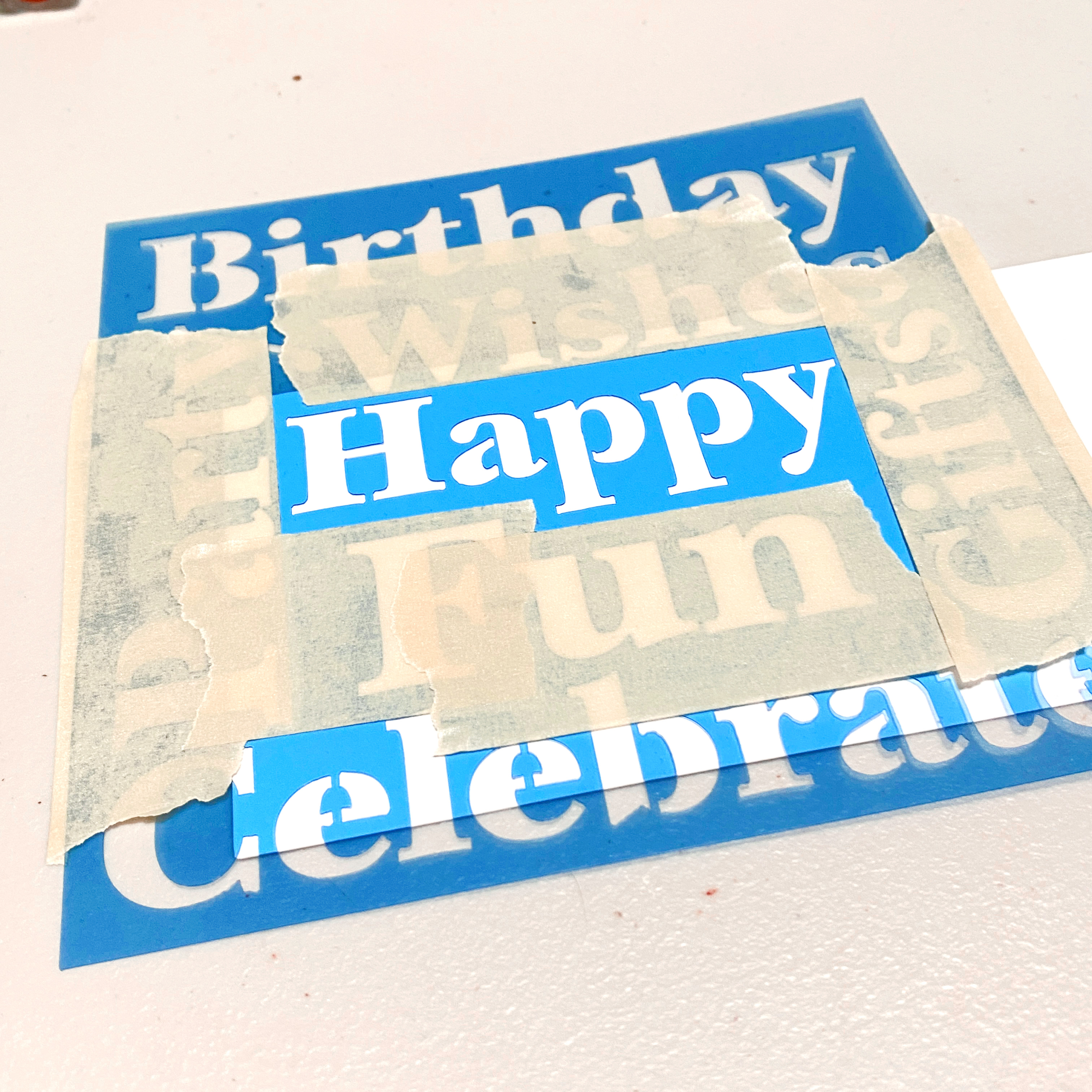 I started by taping around "HAPPY" on the stencil. Taping off portions of a stencil you don't want to use that are close to the portions you are using is a good way to make stenciling easier. You won't have to worry about accidentally getting paint or ink where you don't want it…