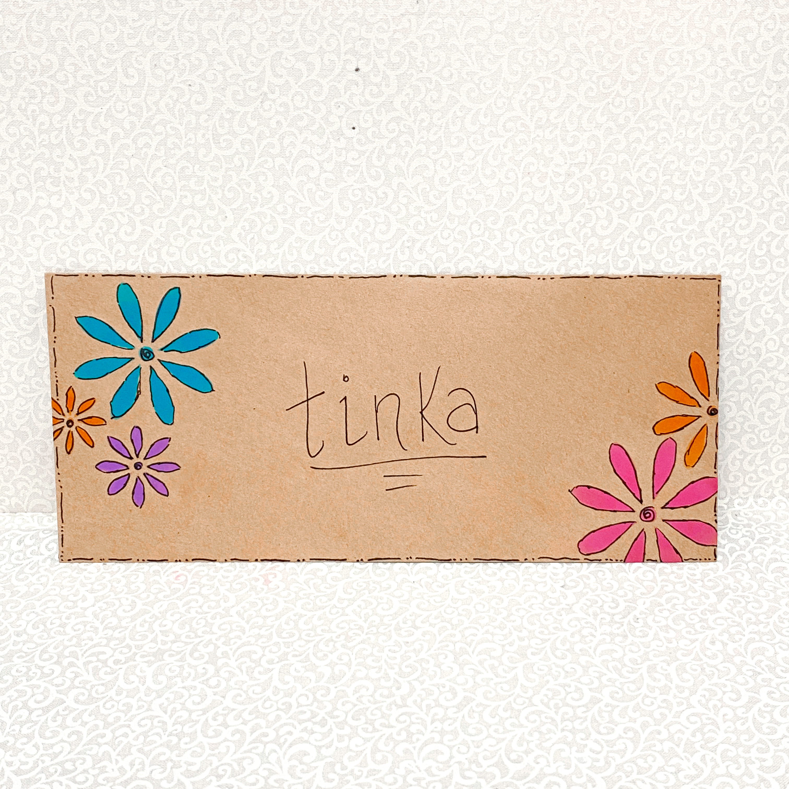 I adhered the inked cardstock to a card I made from kraft cardstock. I added some black line doodles around the edges of the card and envelope and added black rhinestones to the flower centers.