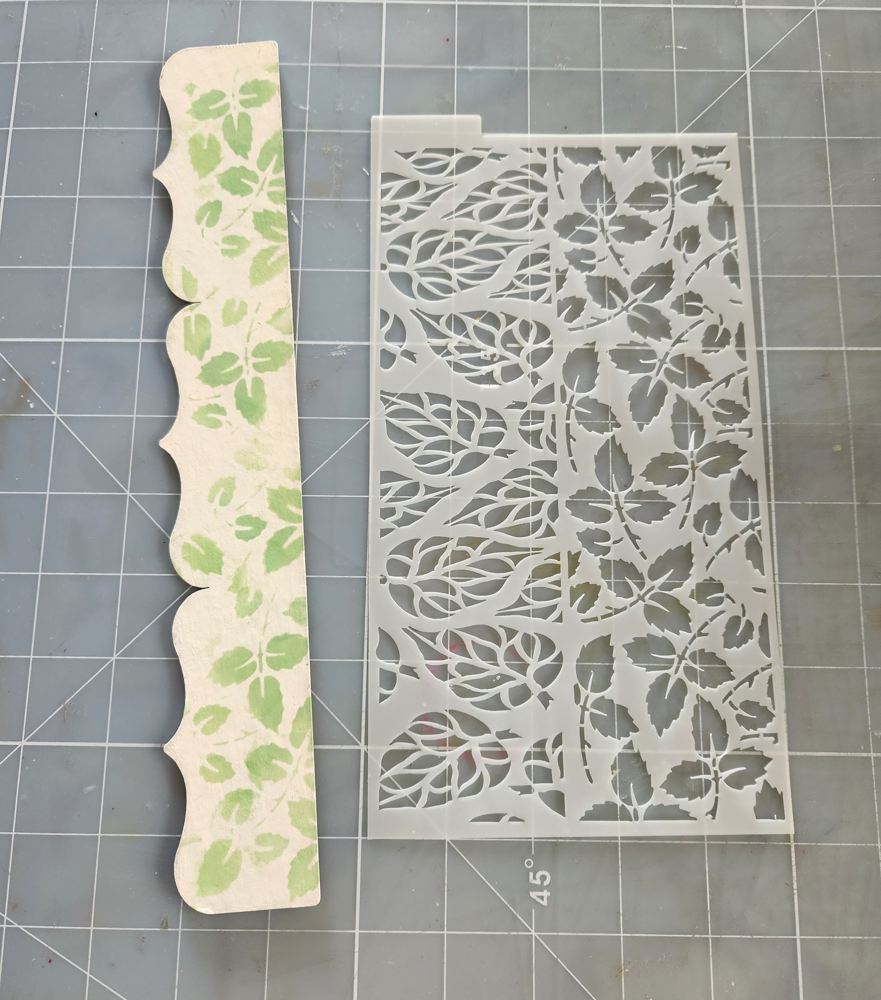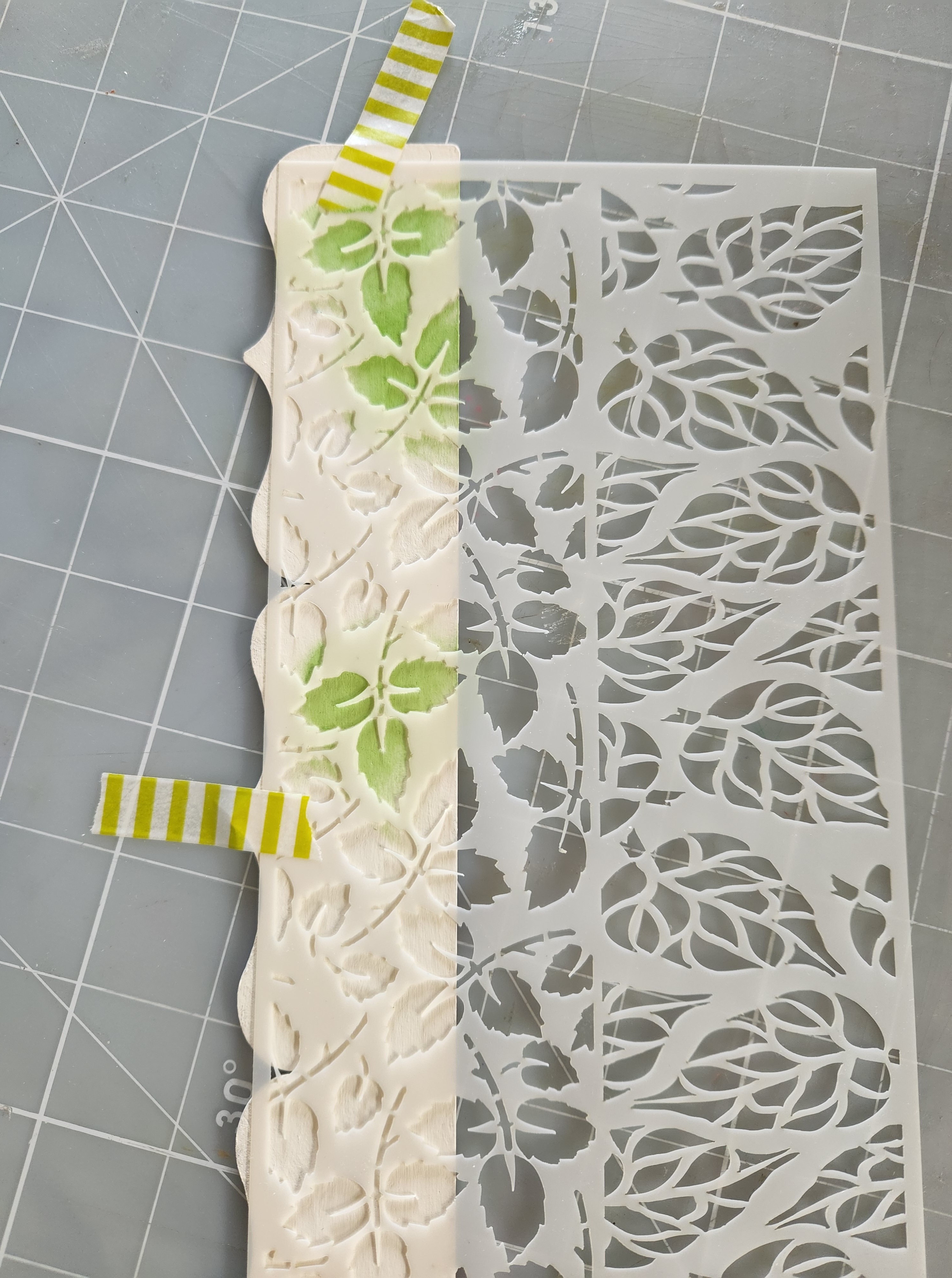 After my border is fully dry, I took my mixer leaves stencil and securely taped my stencil in place using some washi tape.