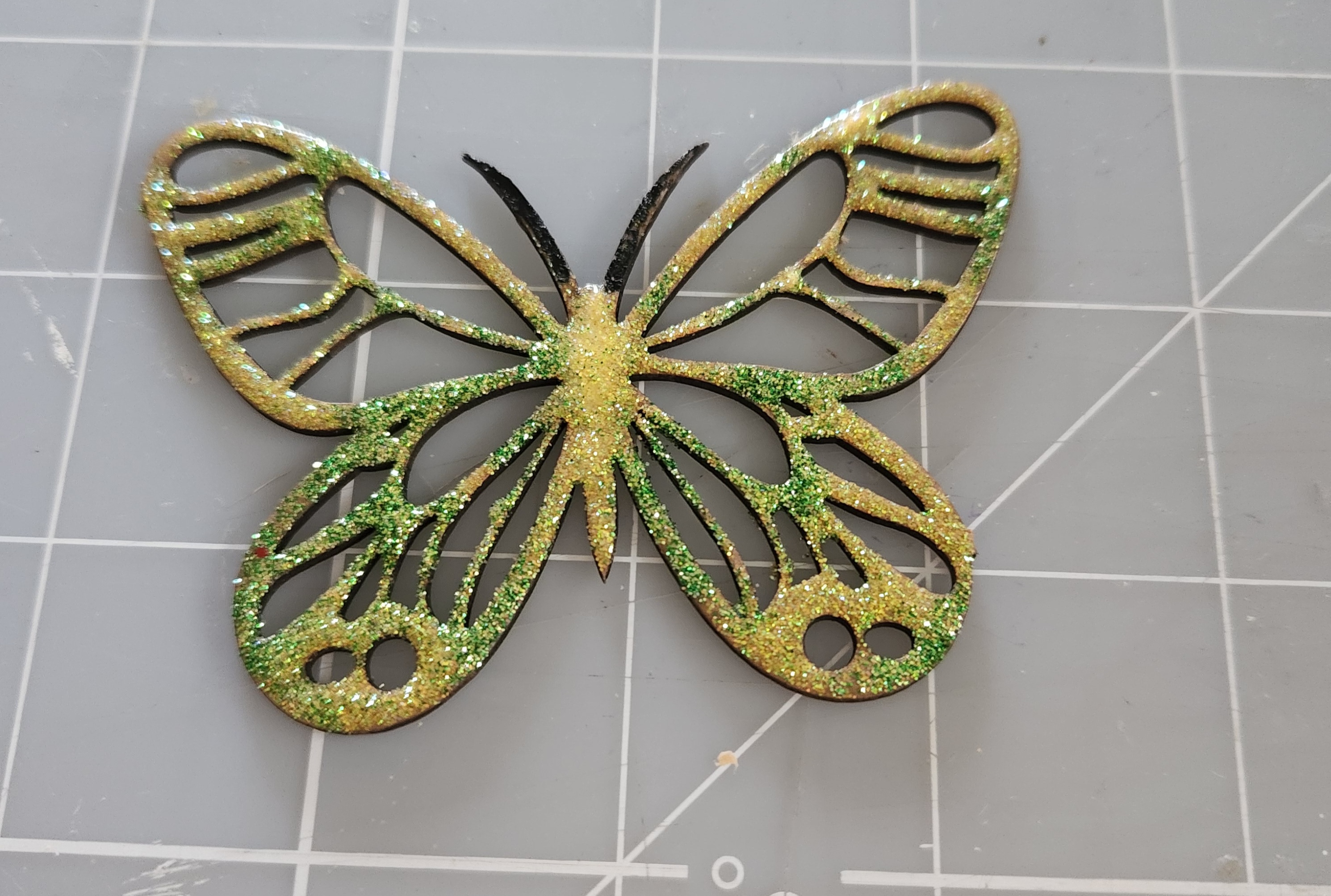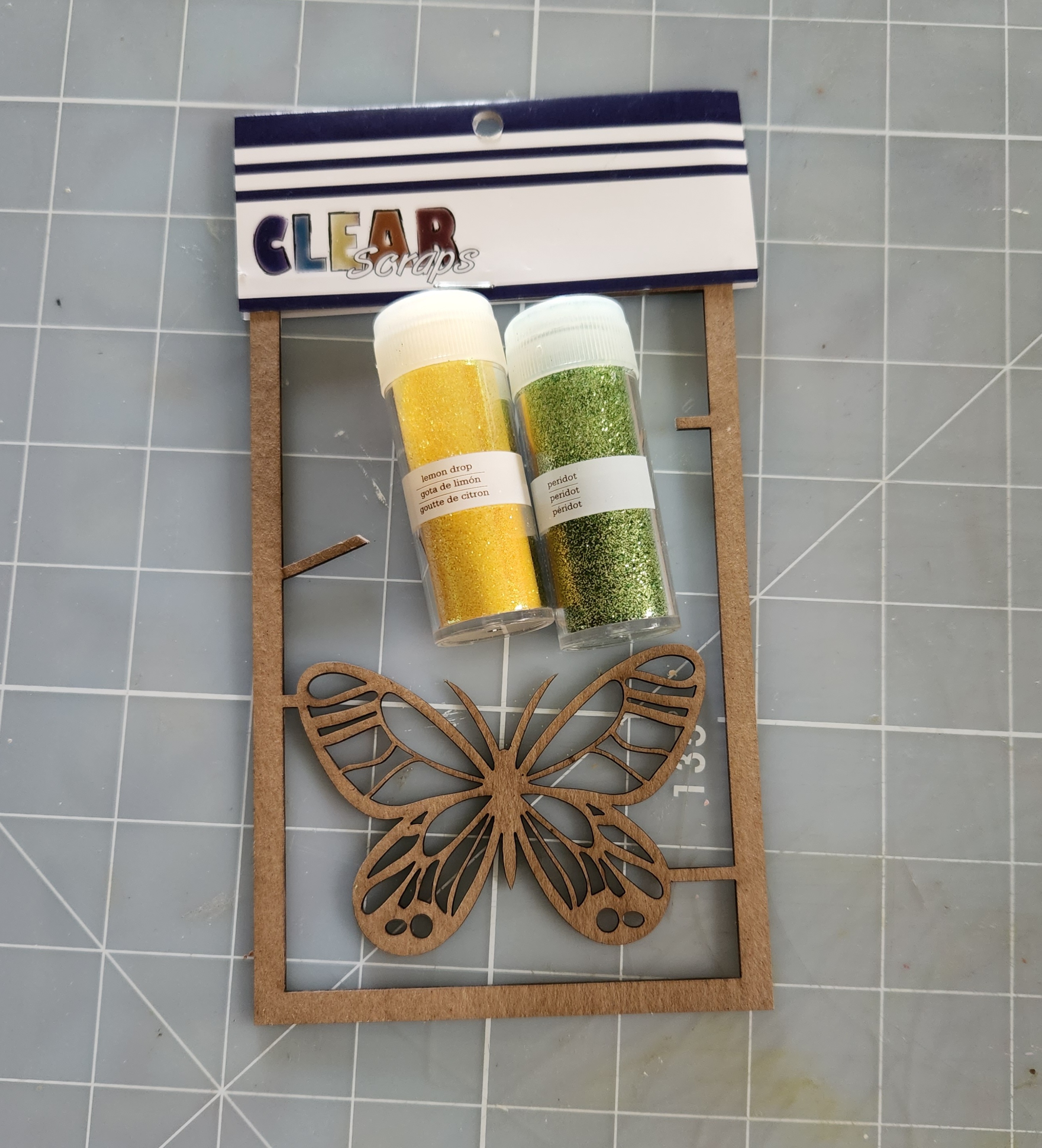 Now I cut apart one of my Clear Scraps Fancy Butterflies chipboard embellishments, I had leftover from a previous project. But you could use both butterfly chipboard embellishments if you like. I added some yellow and green glitter to my chipboard butterfly wings. Then set aside to dry.