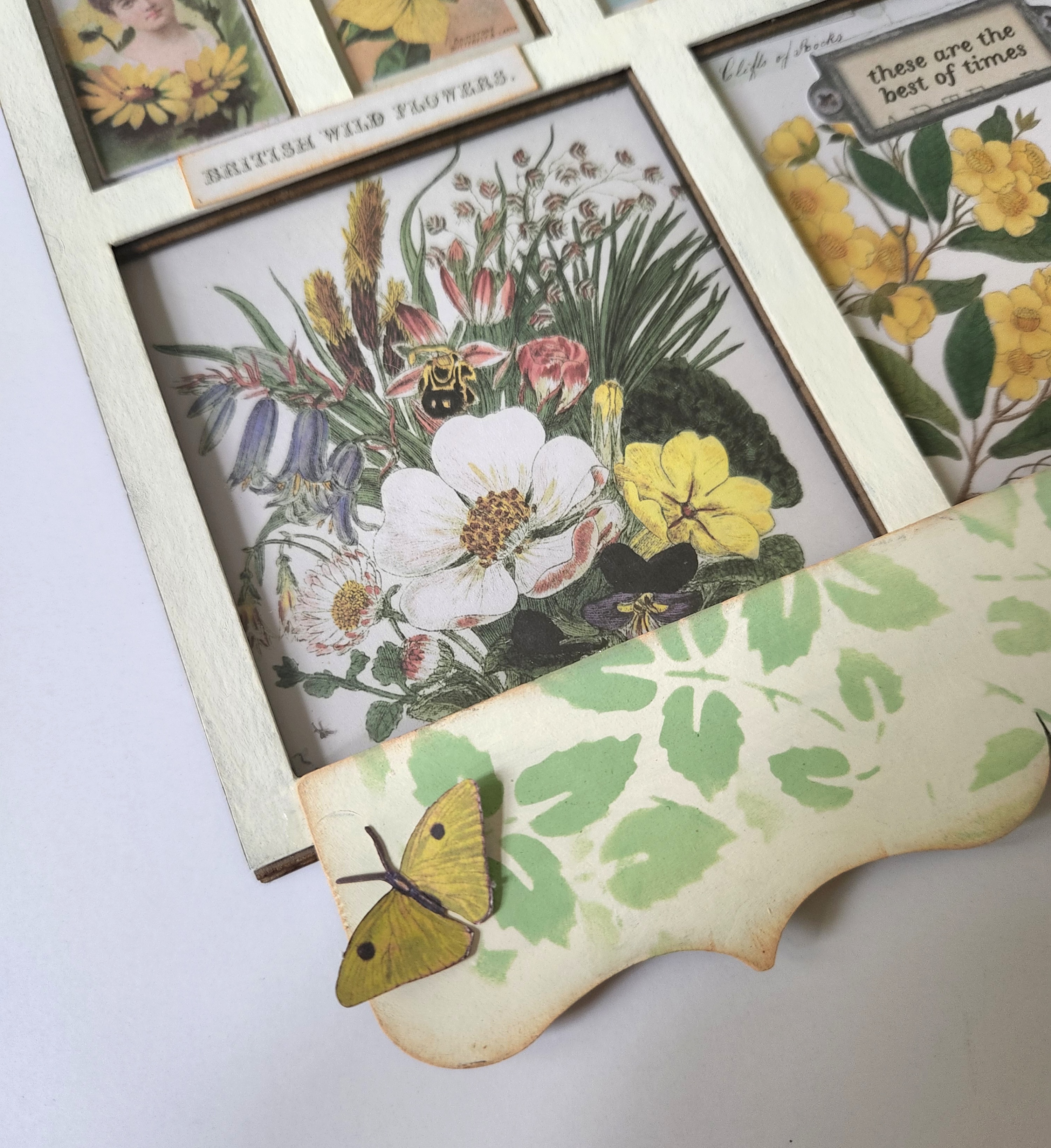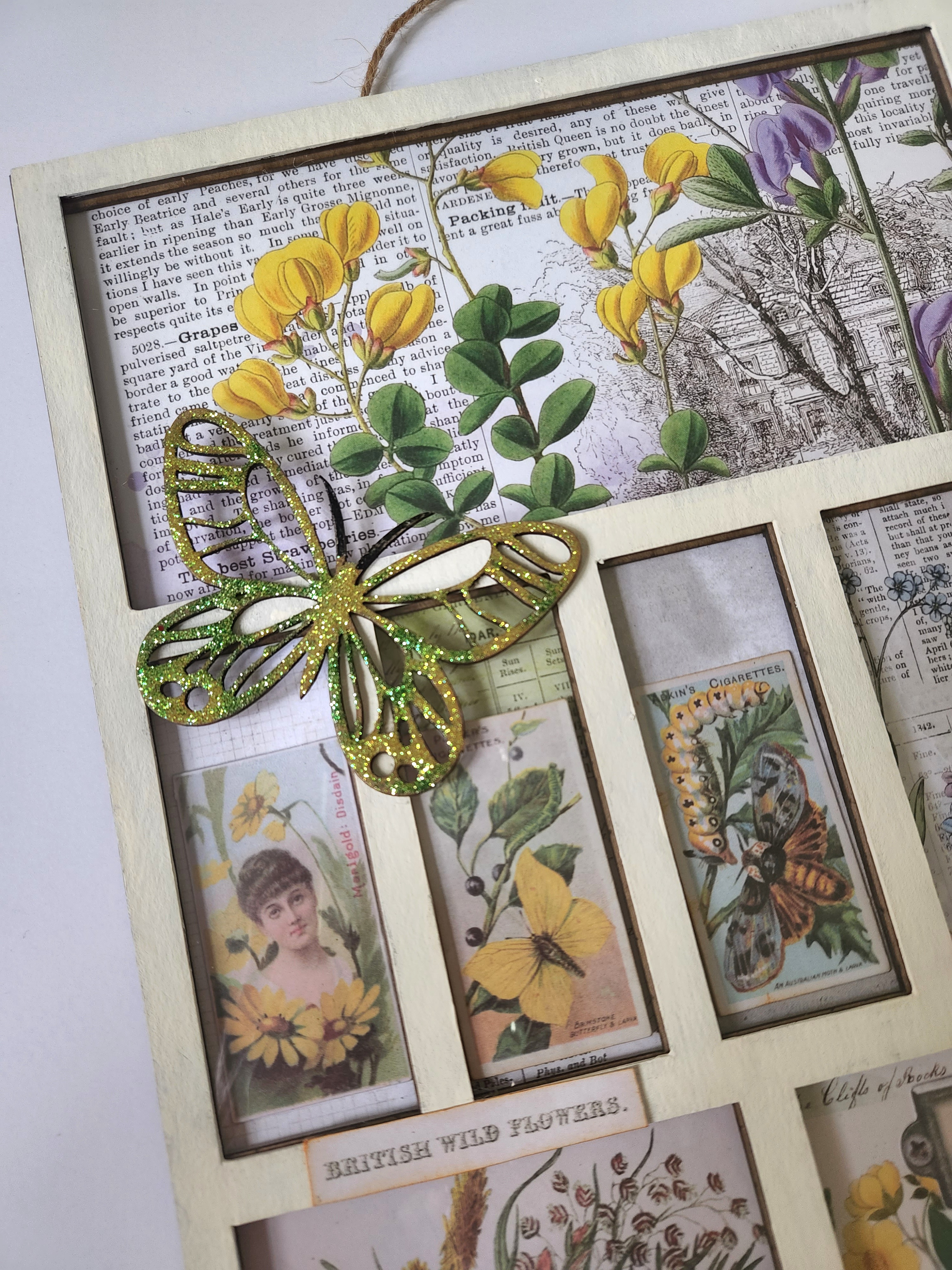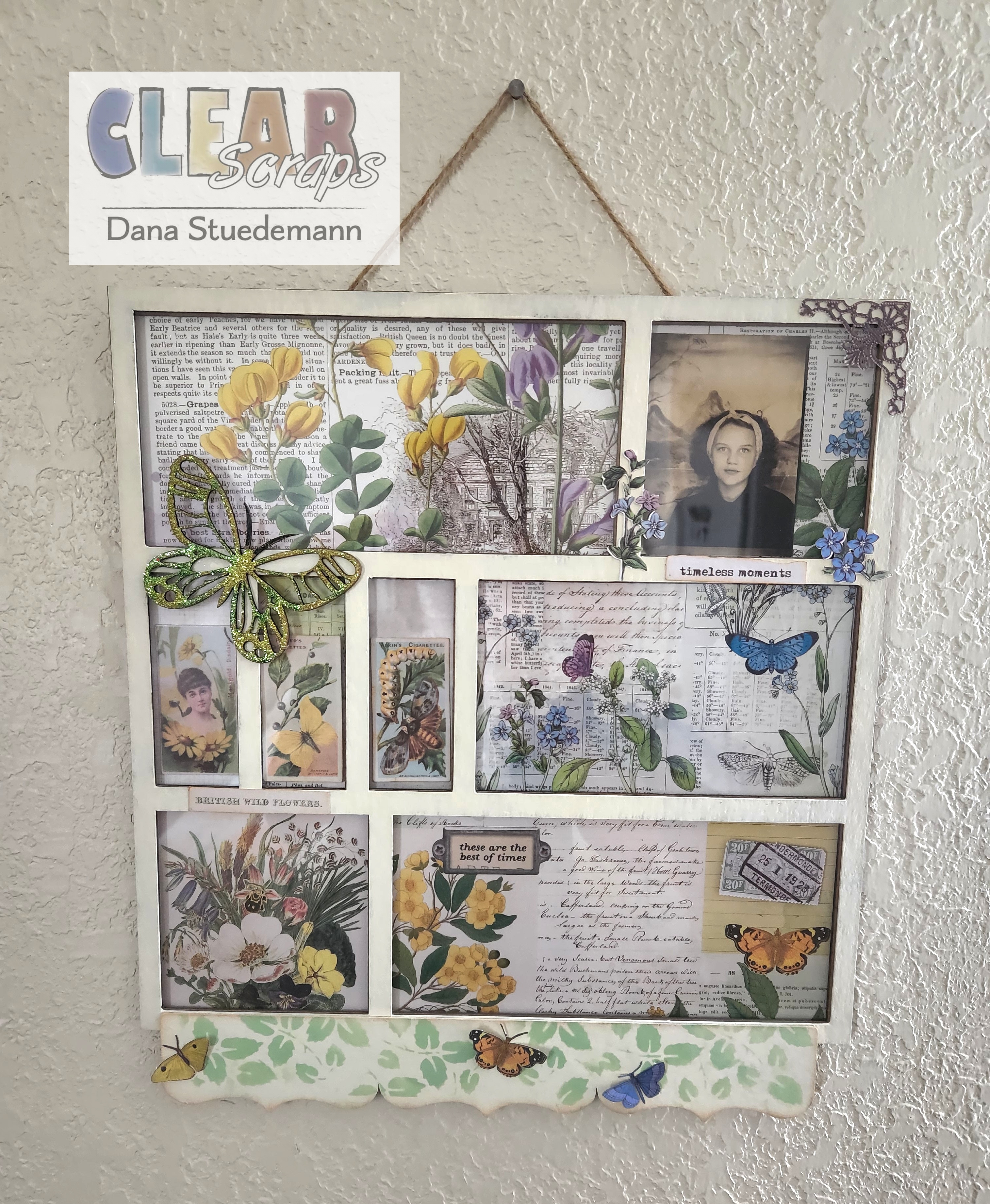 Now the fun begins and we can add our embellishments. I like to use some fuzzy cut elements and ephemera pieces using foam dots to adhere to the different sections of my printer tray. I added a stamp, and even glued some Butterflies to my chipboard Deco border piece. I chose to add a photo of my mother inside one of the windows too for a personal touch!