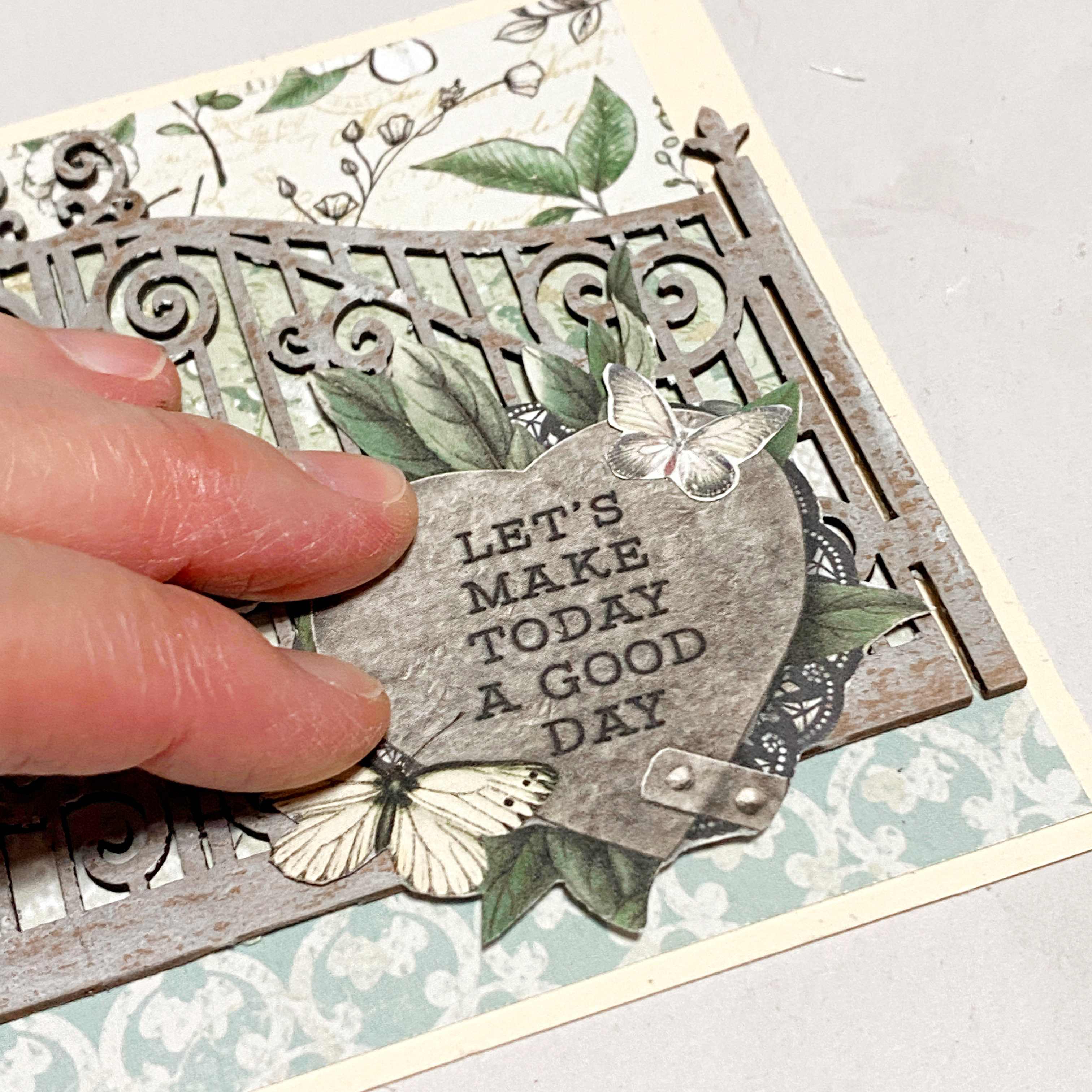 I made a card from cream cardstock and adhered printed papers to the top and bottom of the card, then adhered the gate to the card front…