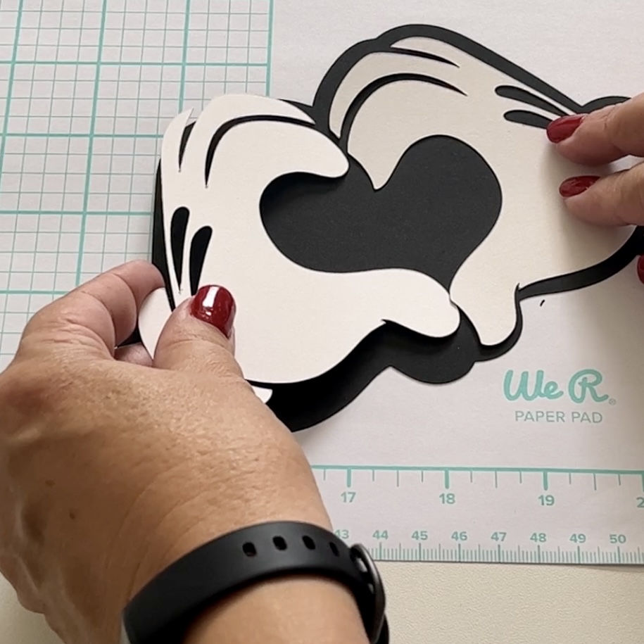 As I looked at the frame, I thought it would be fun to mimic Mickey Mouse hands in the shape of a heart, and I just happened to find a cut file in my Cricut design library that did just that! I cut it out at 4.25" in width in both a white and black card stock. These were glued together, and then I added the number 50 in silver and and glued the frame overlay at the bottom.