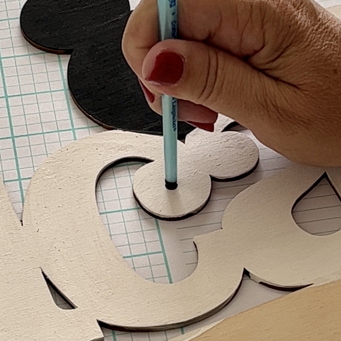 Next, I took the tip of my paintbrush handle and dipped it in some black acrylic paint. This is then applied to the white letters as one dot with 2 smaller dots to make it look like mouse ears. I repeated this across all the white letters. It's not necessary to feel like they have to be perfectly round.