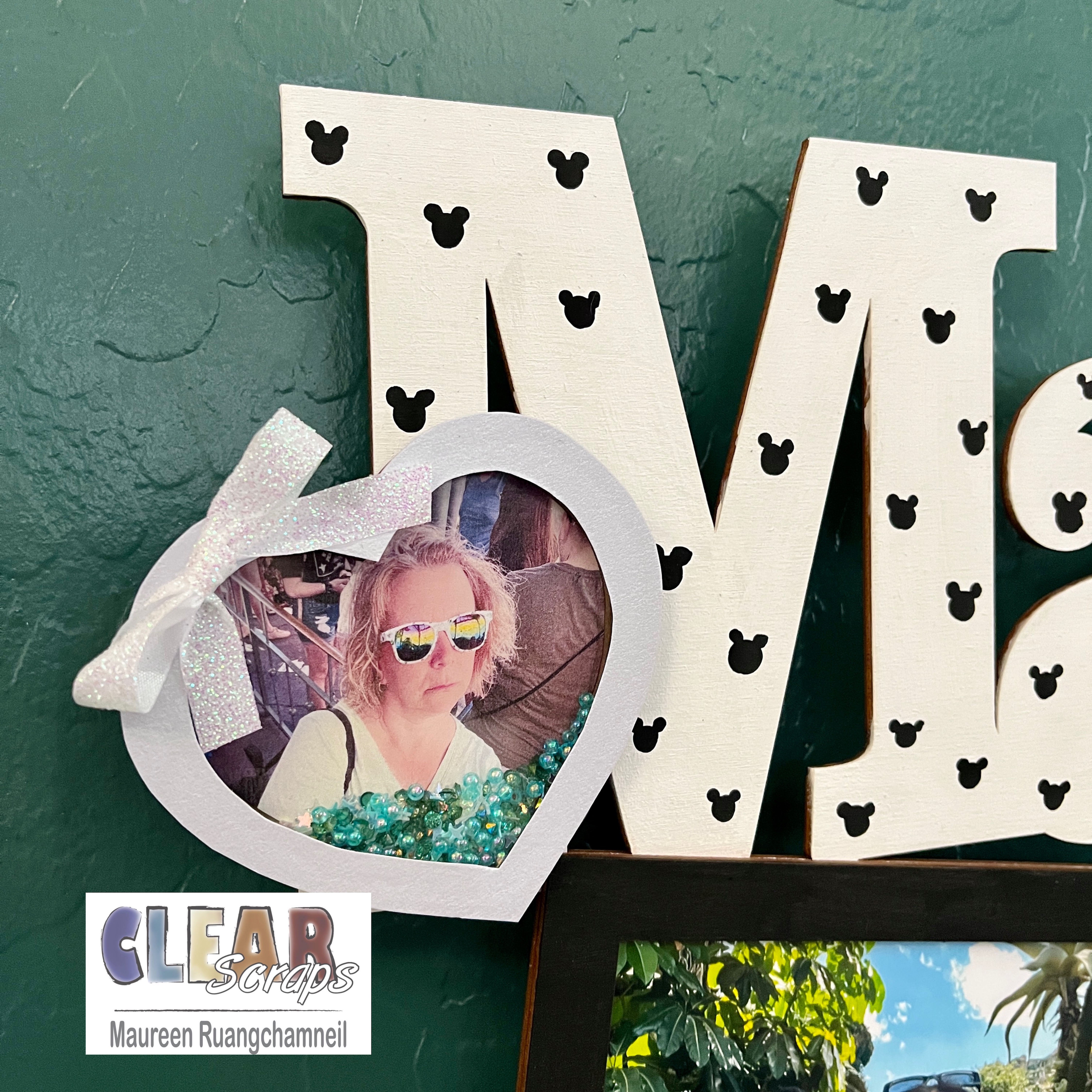 Next, I filled the shaker, applied the other 3 layers and the acrylic top (don't forget to take off that film on both sides!) and glued down with glue. I also took a small bow and glued it to the edge of my shaker. This is then glued to the corner edge of the letter M, and the frame is attached to the main piece, along with my photos.