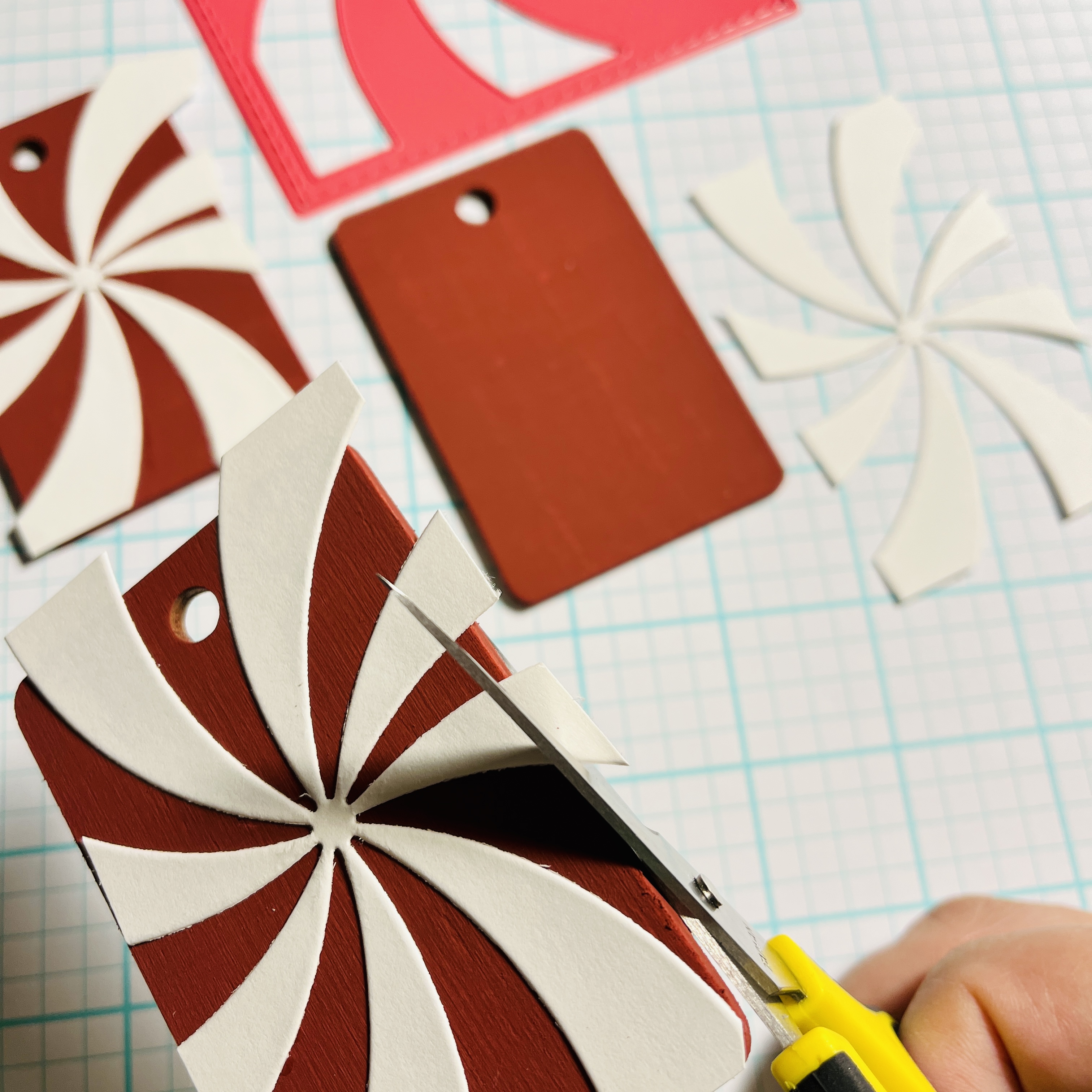 I had a peppermint swirl die cut so I cut several sheets of white card stock with this panel, then laid them on top of the panels, gluing them into place. Then I took a detail scissors and trimmed off the ends.
