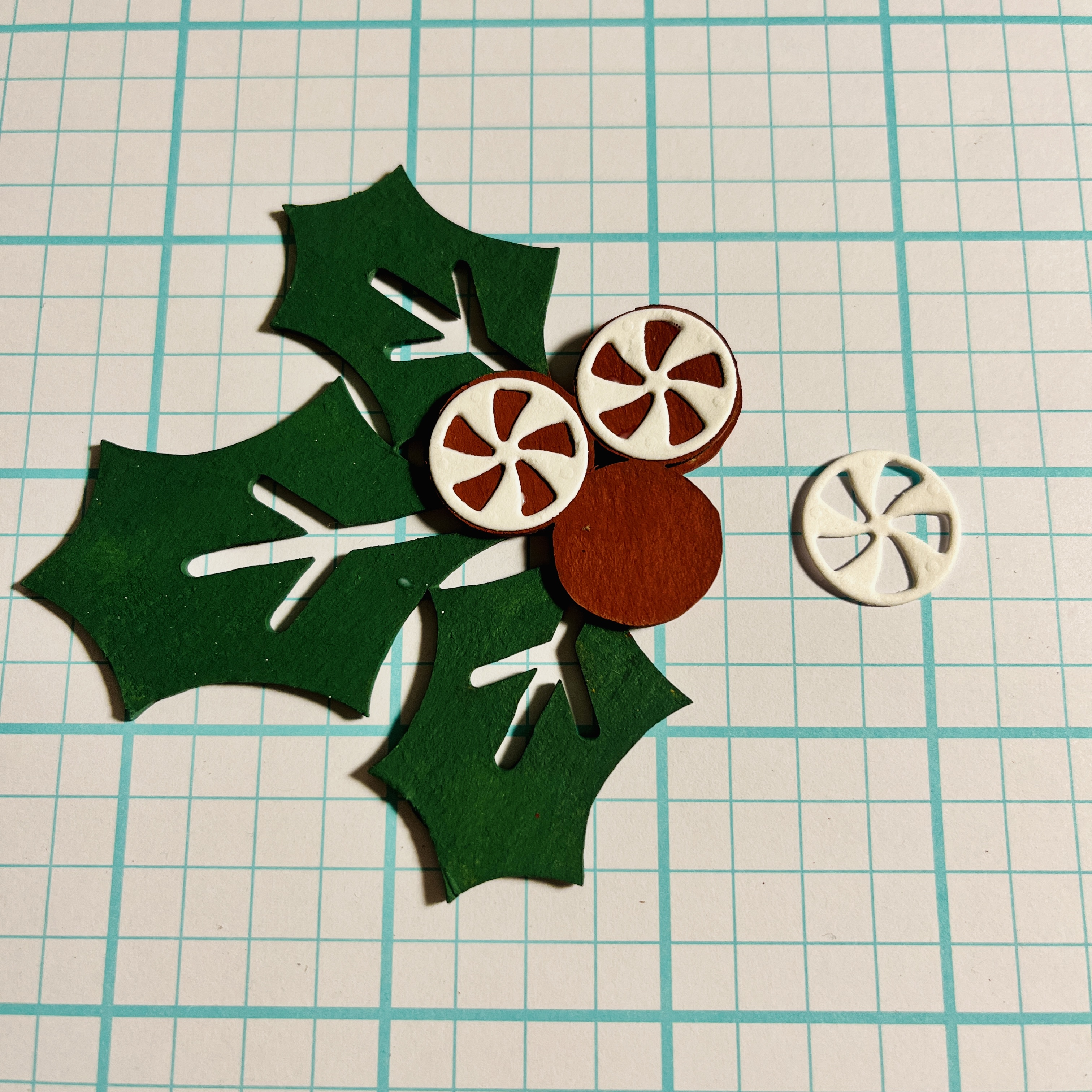The chipboard numbers that come with the kit are painted in a pine tree green and the script font is painted in white. Set these aside to dry, then later glue them on the center of each peppermint panel and on to the main board.