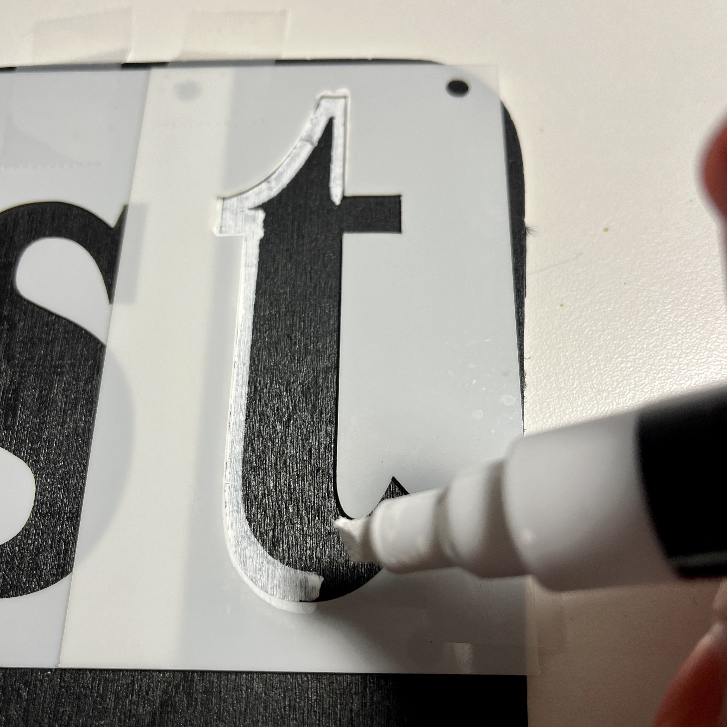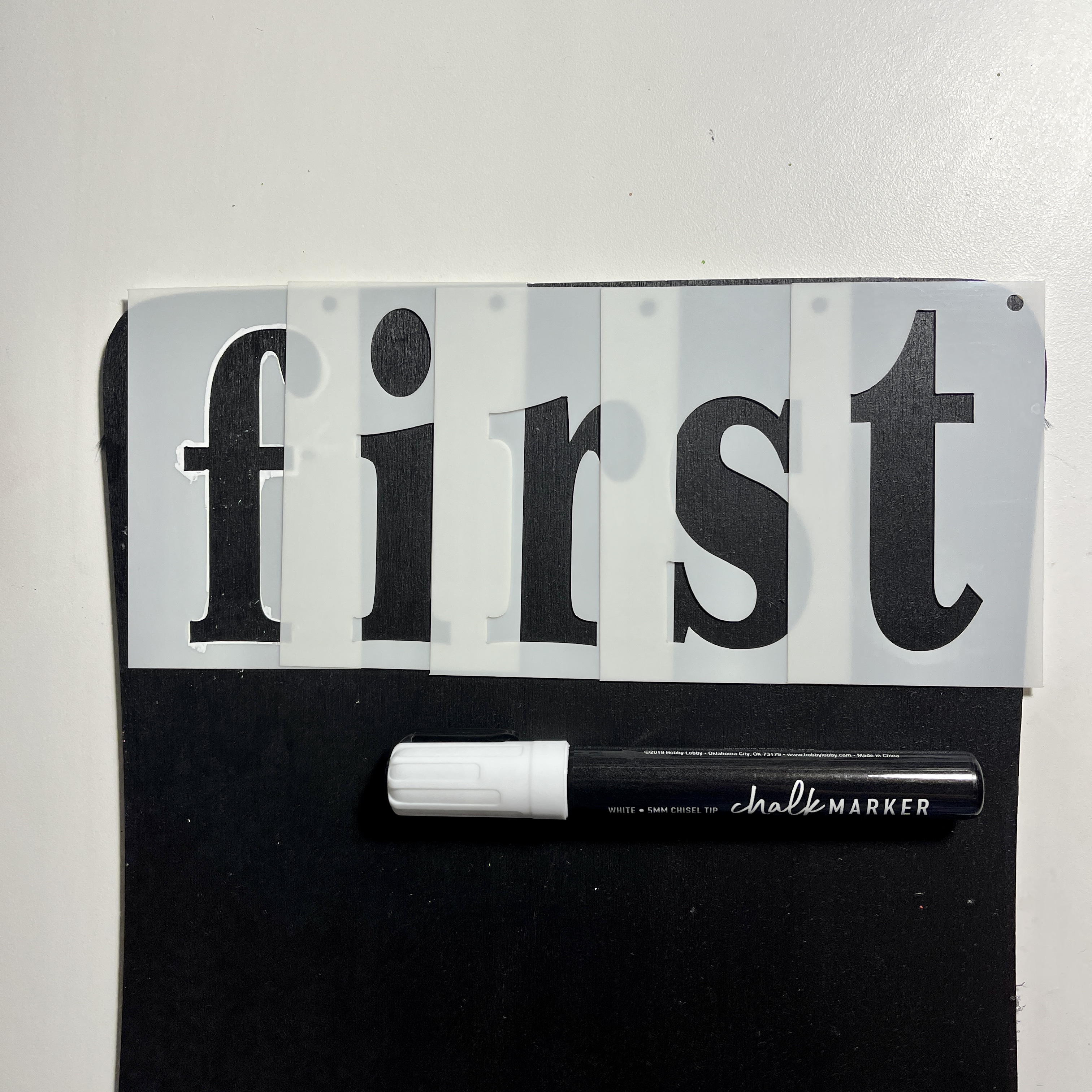 Taking my chalk pen, I gently trace the outside edge of the stencil letter. Then, I remove the stencil and color in the middle. Chalk pens are great for this project because they do not generally run underneath a stencil; however, if that happens, you can fix any edges with a wet paper towel.