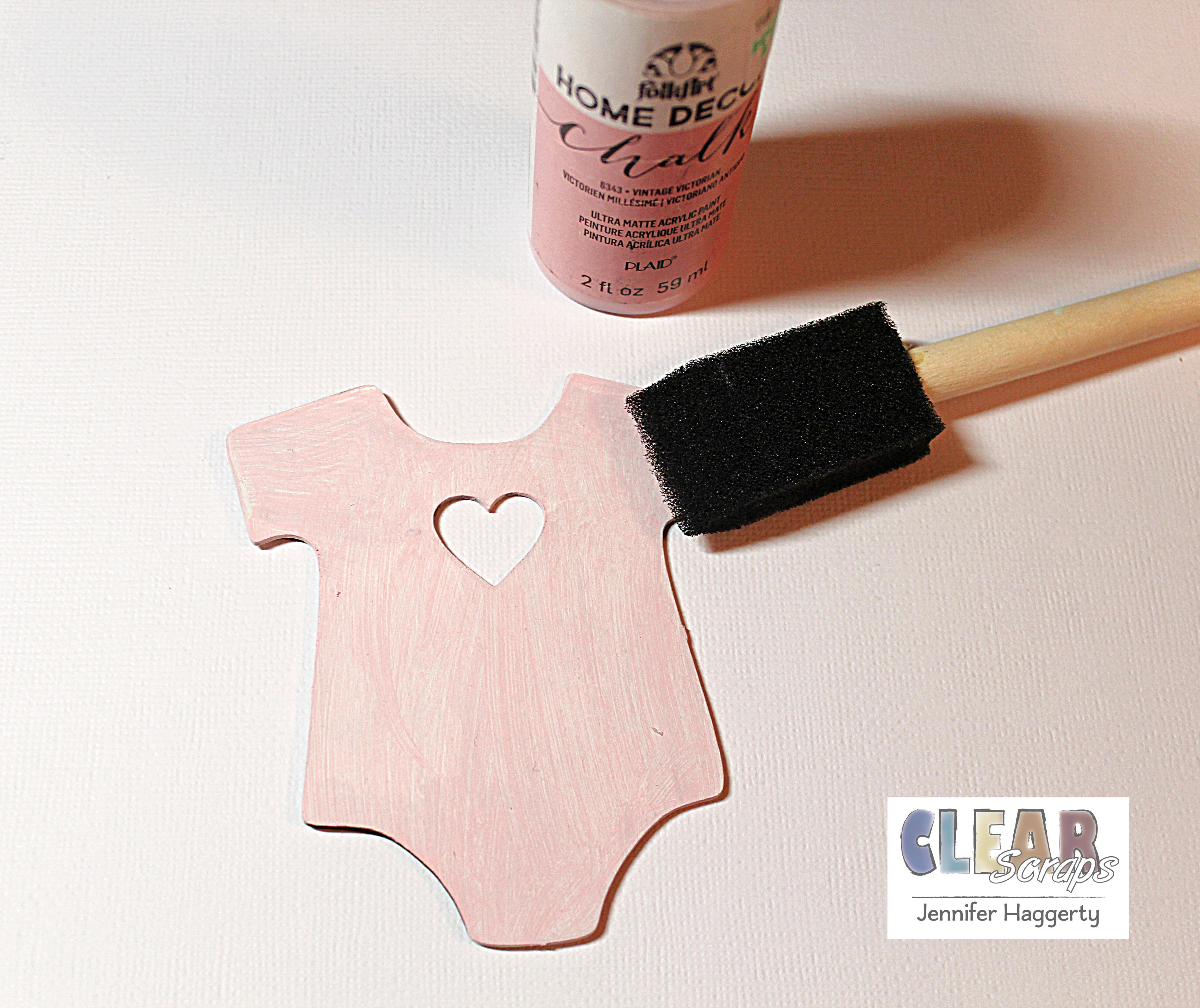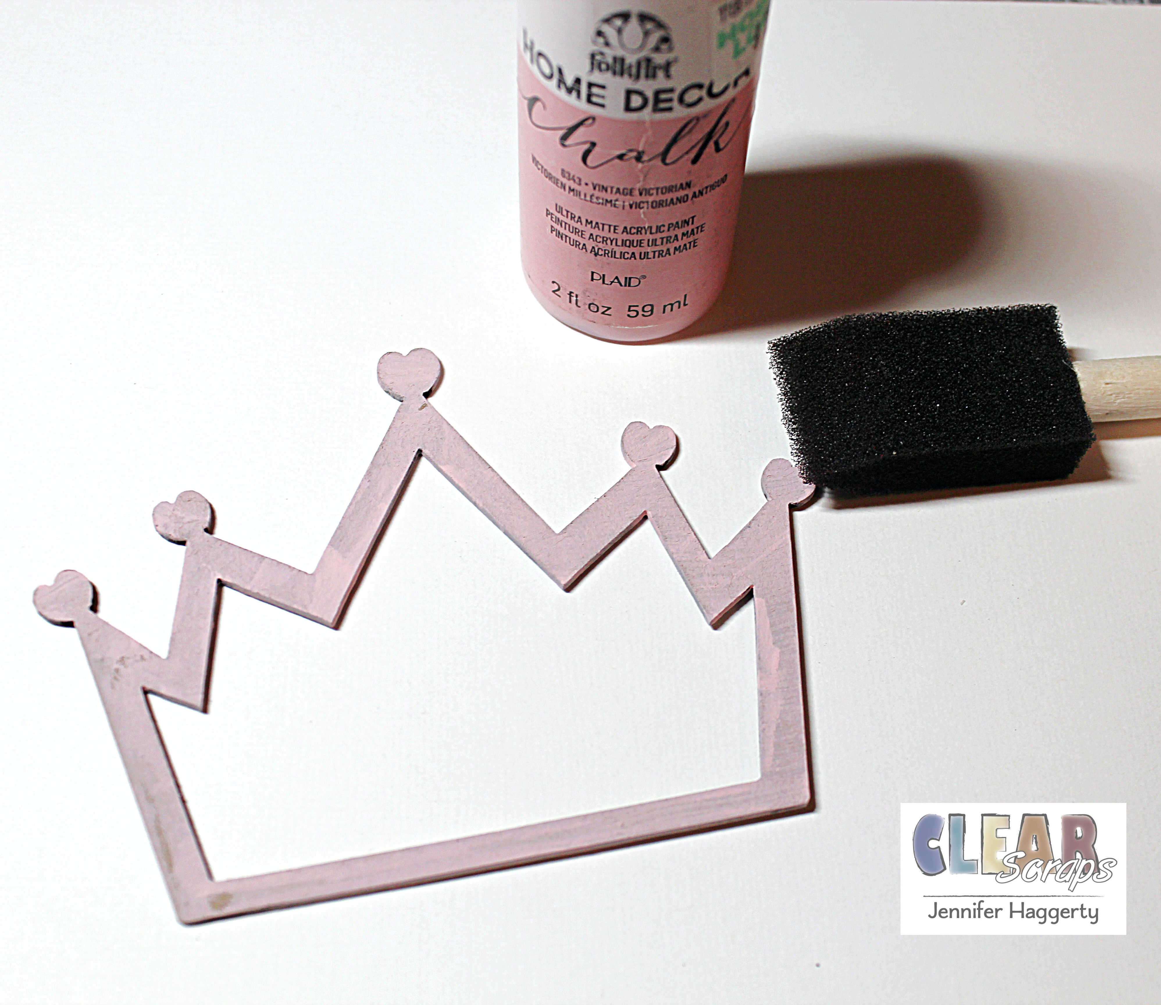 For the Embroidery Hoop, I followed the same technique as the Onesie and the top frame of the Crown. I painted the chipboard with chalk paint in light pink.
