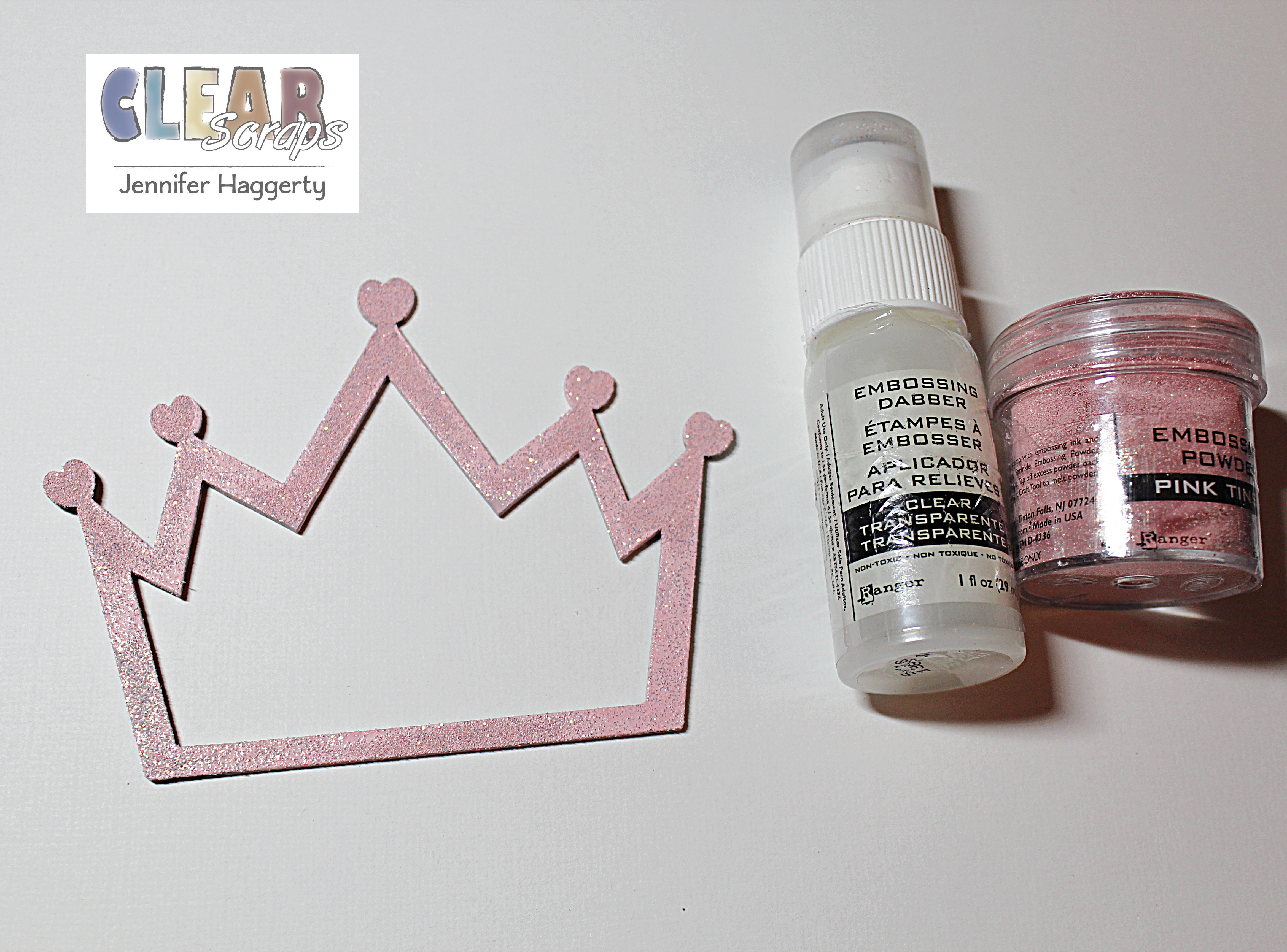 Once my paint was dry, I daubed the chipboard with embossing ink followed by ample amounts of pink embossing powder. Lastly heat tool to set