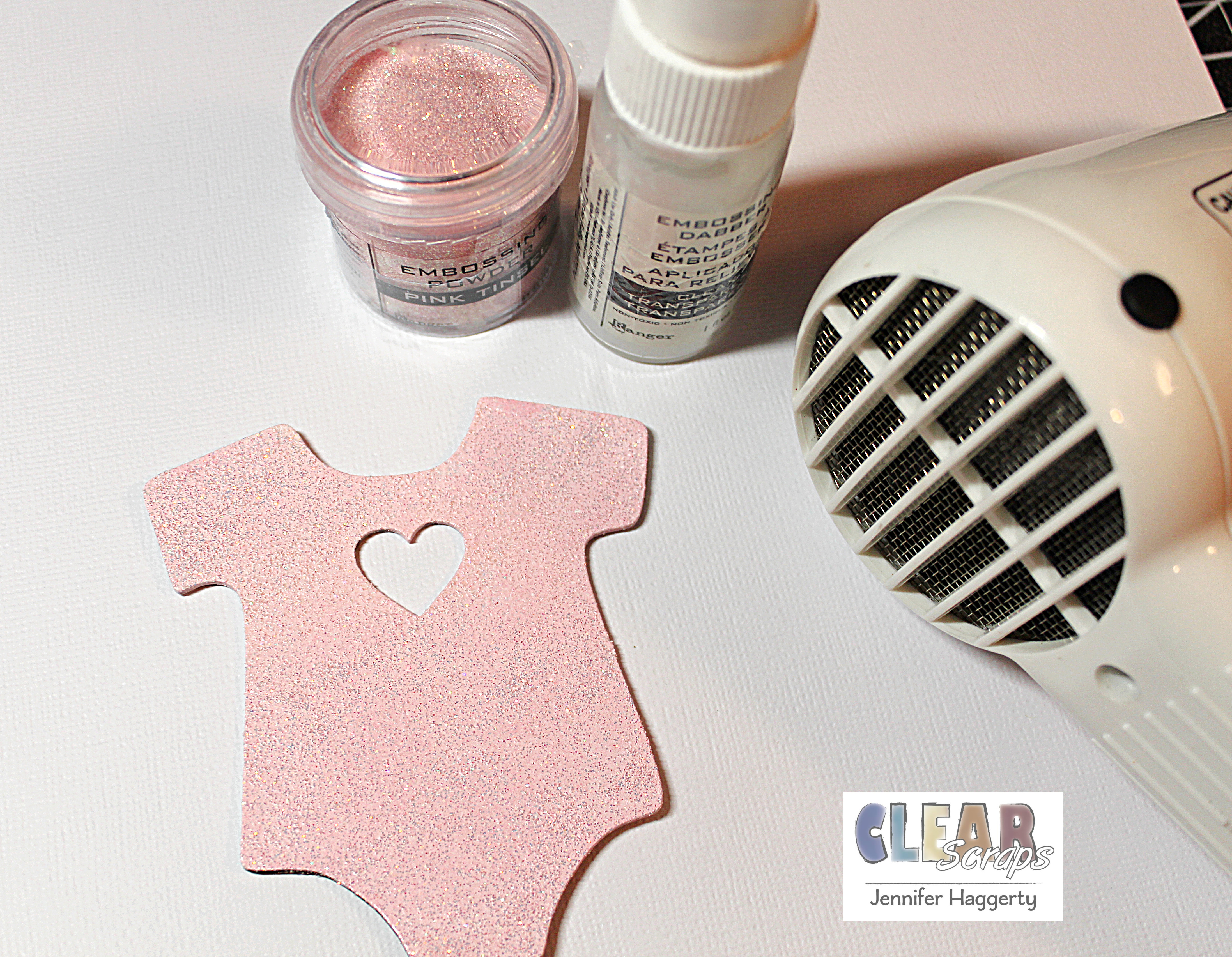 Once dry, I daubed with embossing ink followed by dumping an ample amount of embossing powder Once I removed the excess powder, I set with my heat tool. I adhered the Onesie Chipboard using my 3-in-1 Beacon Adhesive.