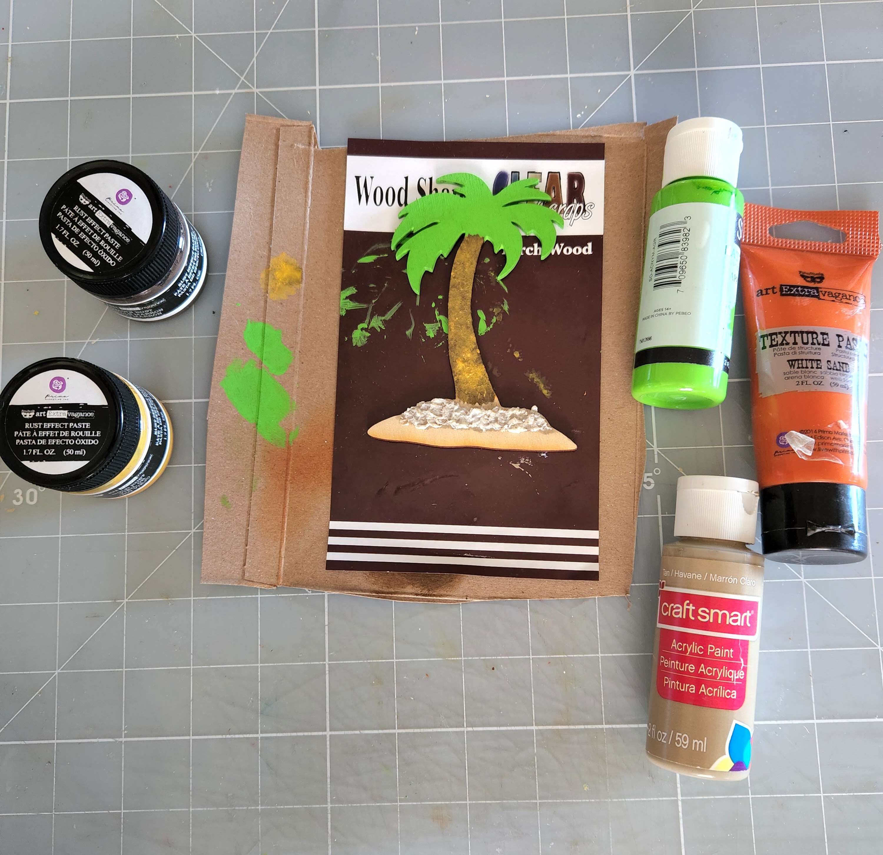 To begin, I took out my palm tree shape and vacation word piece from my package. Using a paintbrush i applied some bright green acrylic paint on the palm leaves. For the tree trunk base, I applied some rust paste brown and gold using a bouncing motion and layering one on top of another. I want to create a more rustic texture to the trunk. For the bottom of my palm tree, I applied a coat of tan acrylic paint. Let dry. Then applied some texture sand over the top. Let dry.