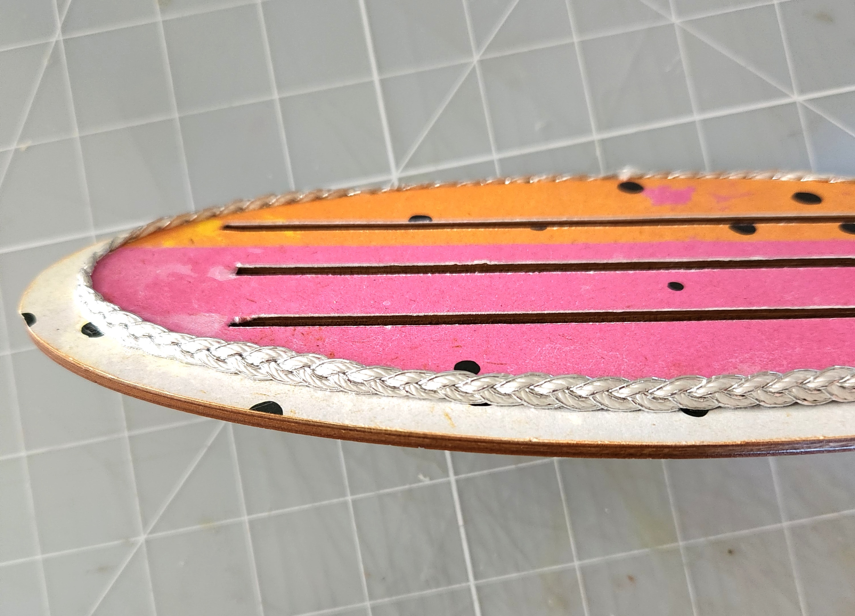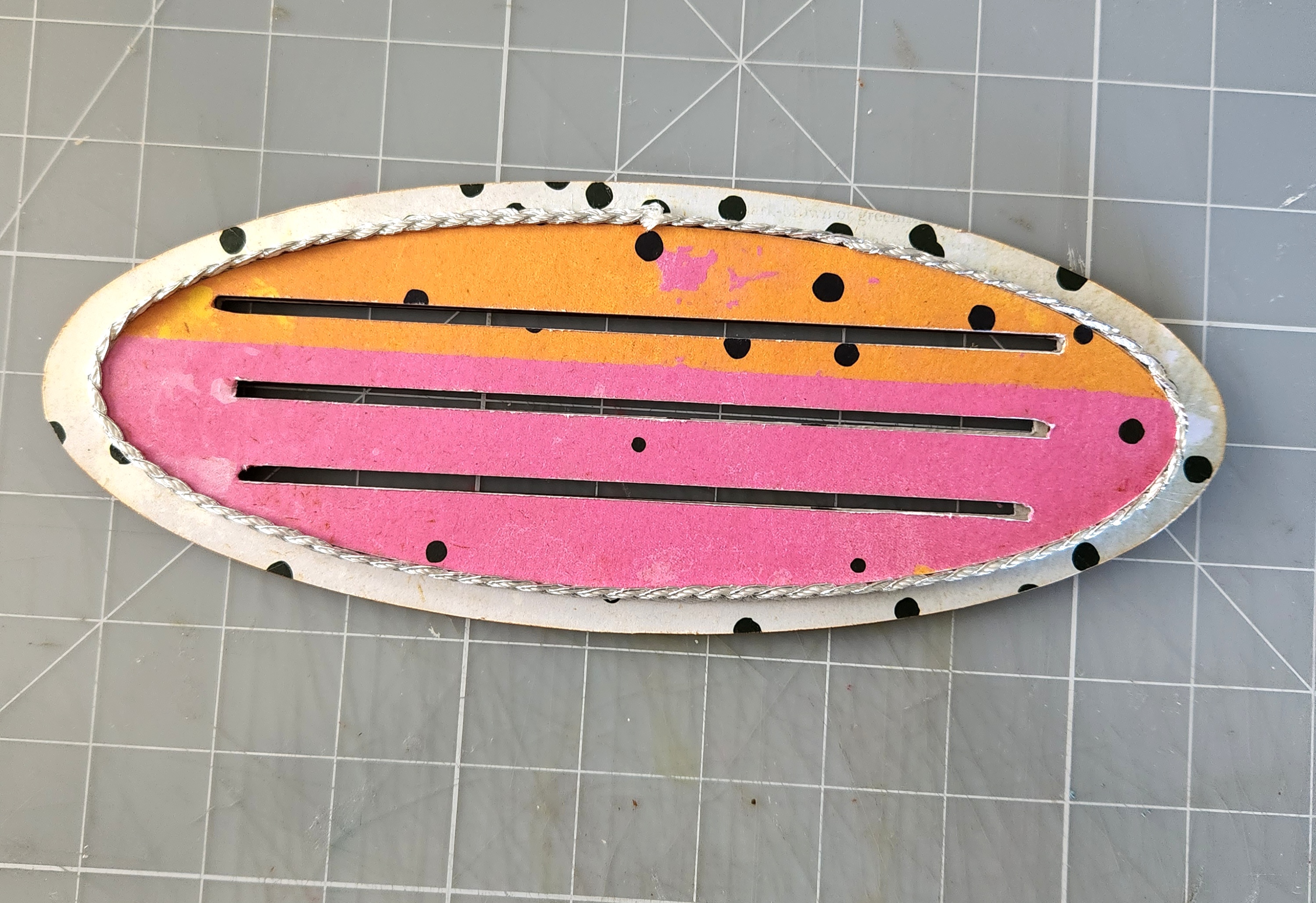 Remove both of your bottom wood bases from your package. I traced with a pencil around each shape. Cut out roughly and using Beacon glue, I applied my paper to both bases. Then using a x-acto knife, I trimmed away any excess paper. Then using a Distress tool or sanding tool, smooth out any rough edges. Make sure your slots are lined up correctly and evenly, before adhering both pieces together. I added some silver rope trim along the bottom edge of my base.