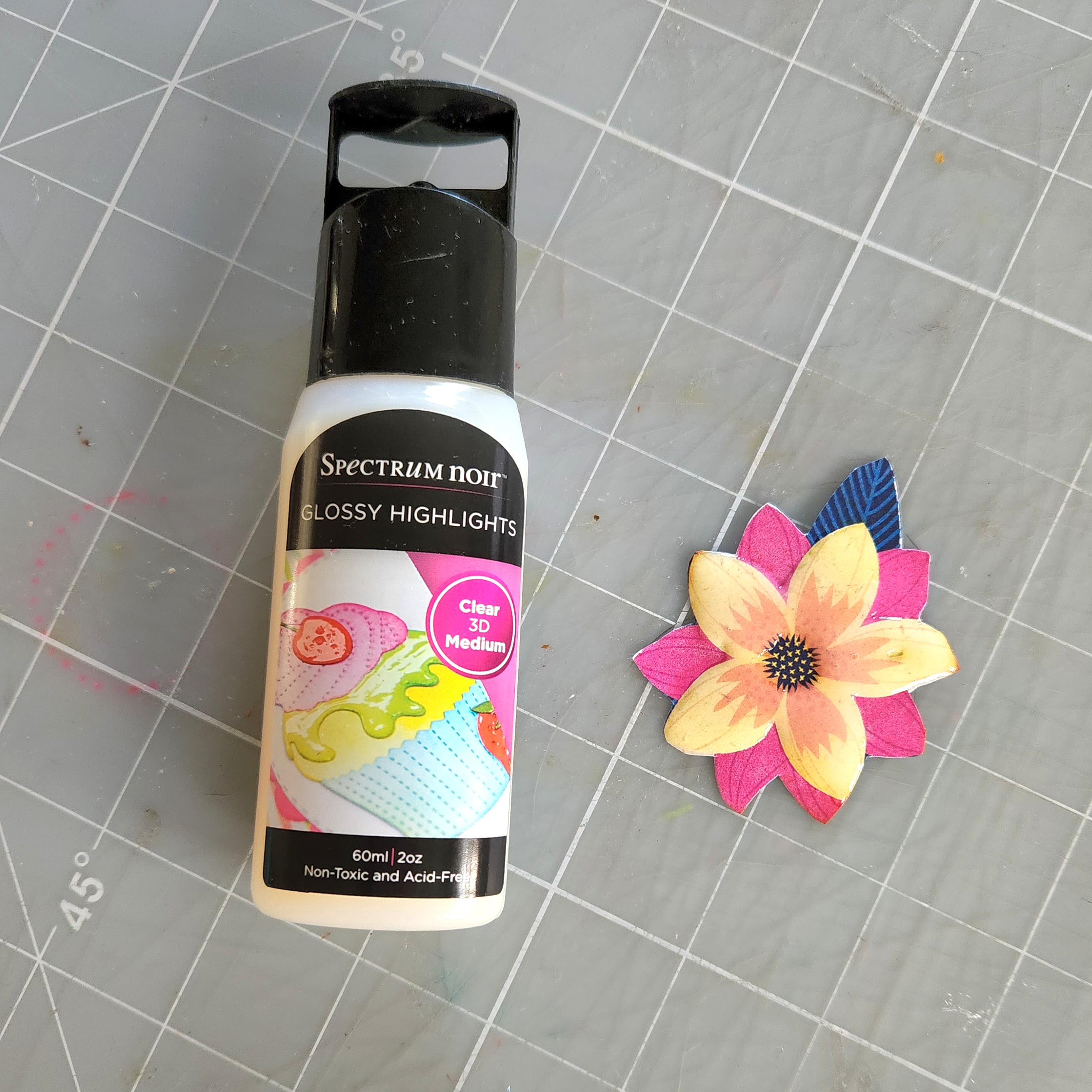 Next I fussy cut out one of the pretty flowers from my leftover papers. Inked along the edges using Distress Ink-Rusty Hinge. I applied some Spectrum Noir Glossy Highlights medium to add dimension and 3 D look. Let dry overnight.