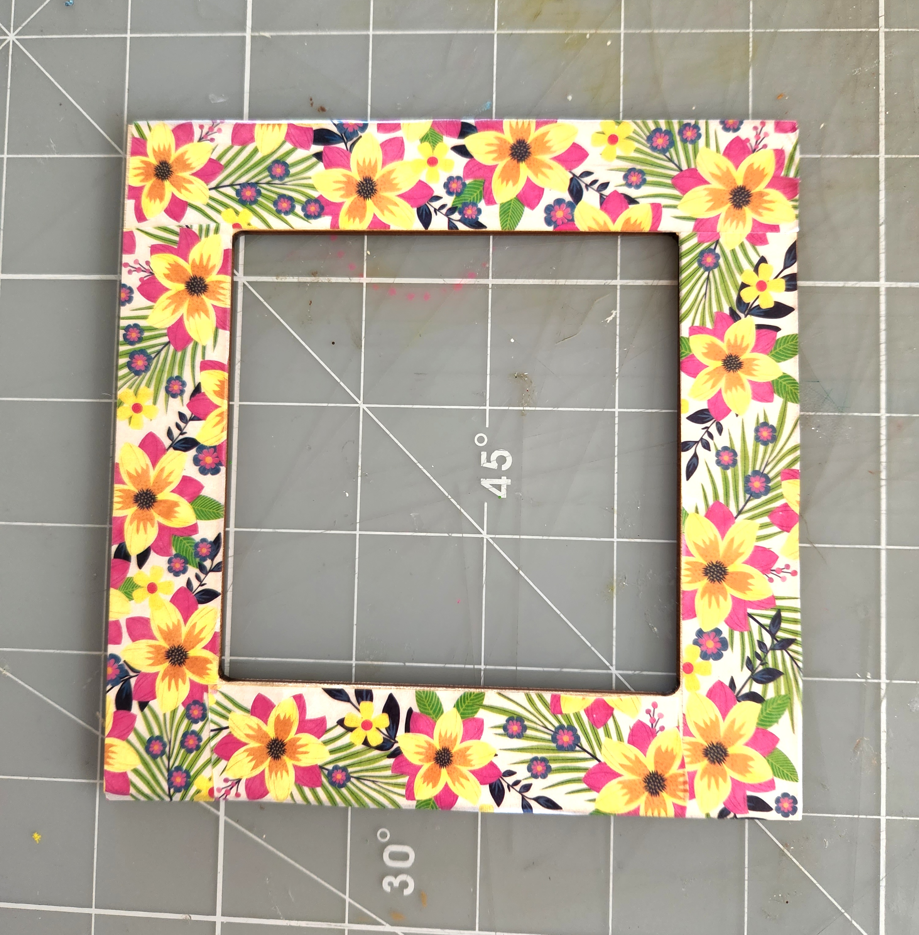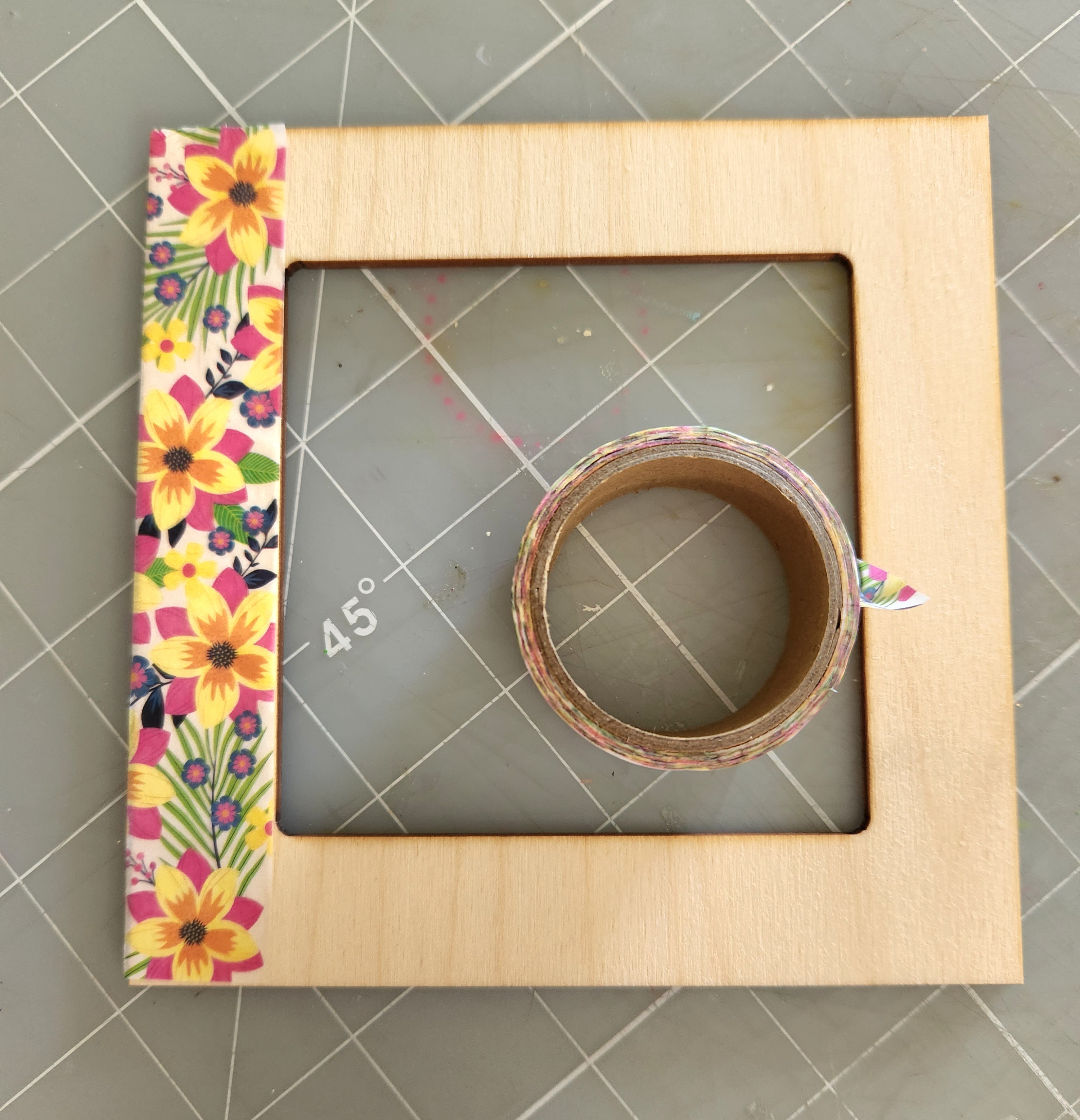 Taking my two frame pieces, I adhered some matching floral washi tape along the edge of the front part of my frame.