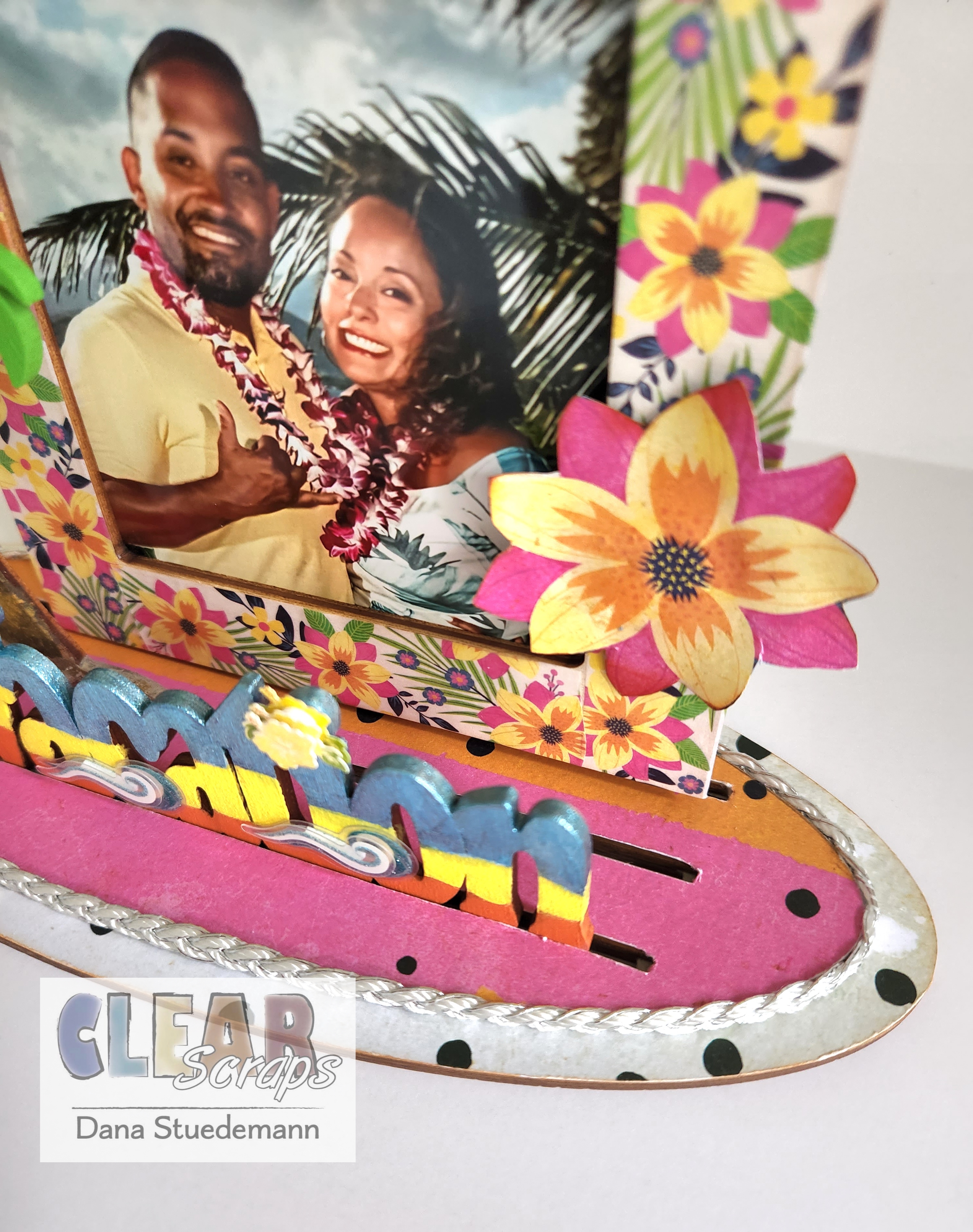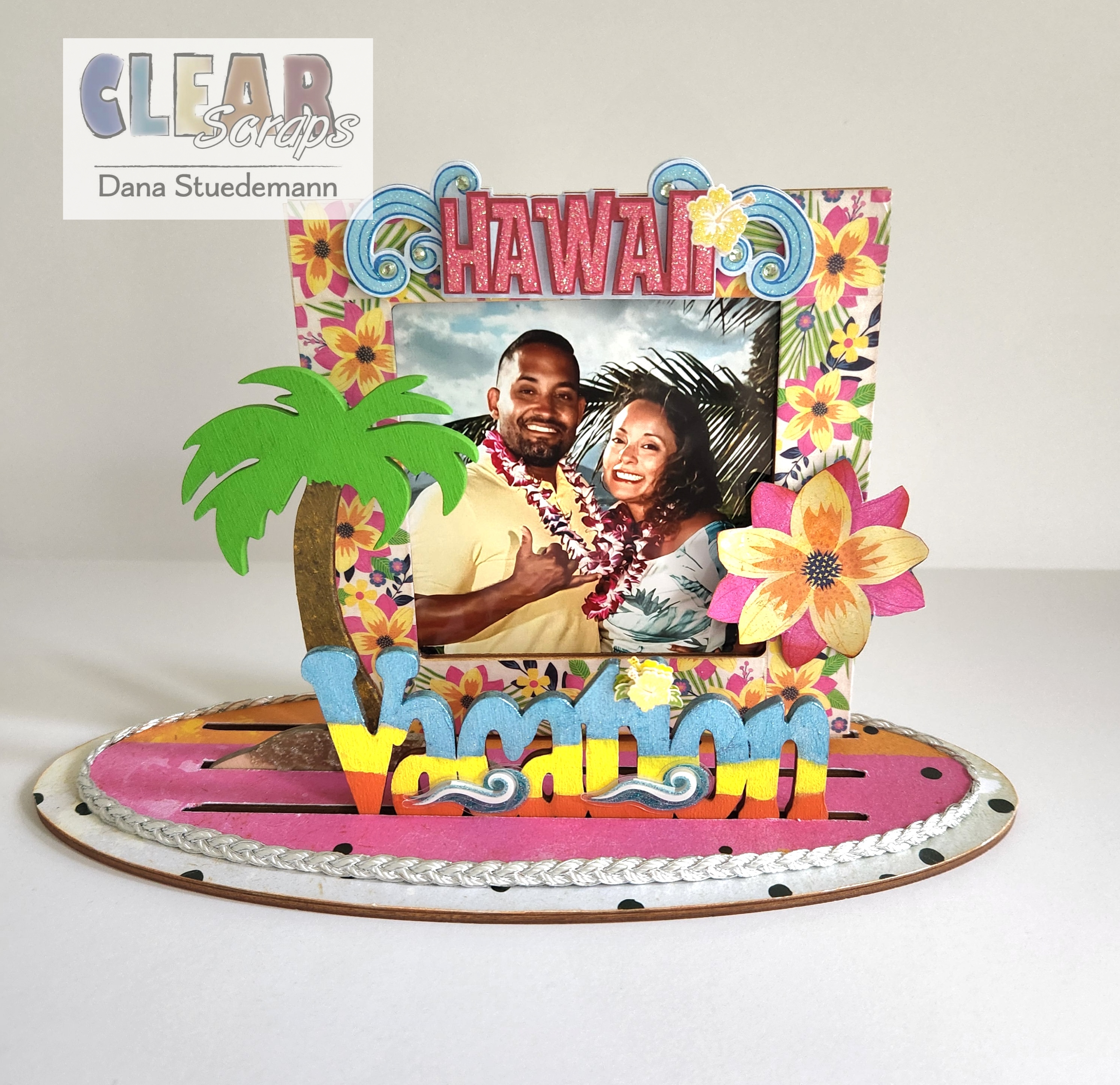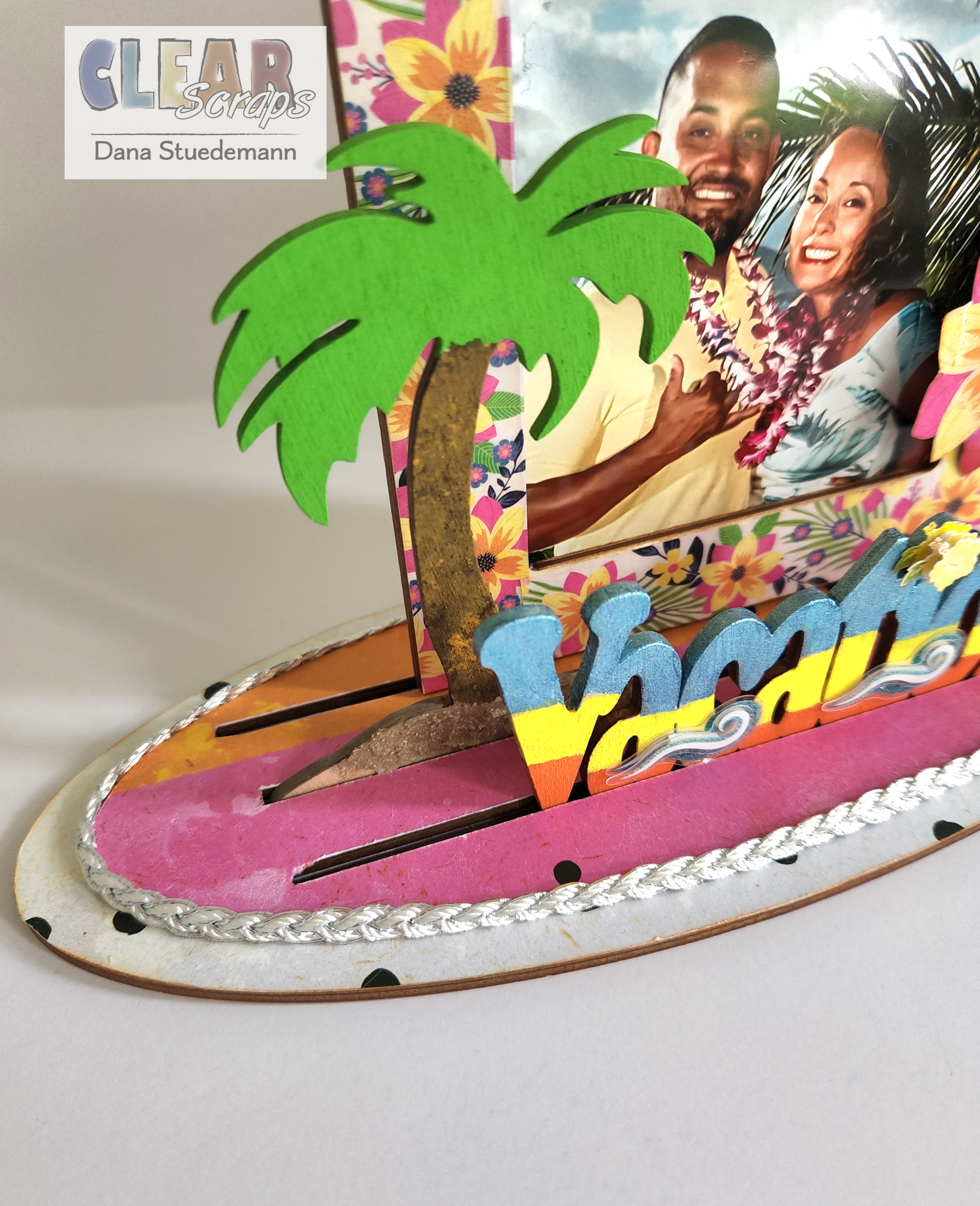 I'm Dana and it's time to share another Home Decor project featuring Clear Scraps 3D Frameables! These are so easy to create and fun to decorate and embellish! For this project today we will be using Clear Scraps Square base and frame Click here and Word and Shape vacation/palm tree Click here This is a perfect way to display a favorite summer vacation photo!