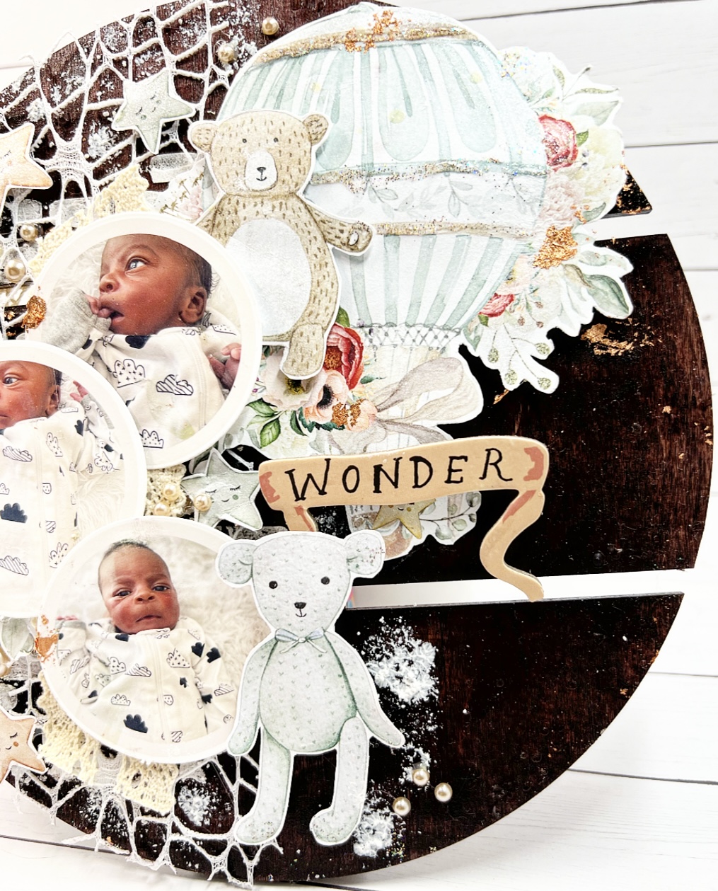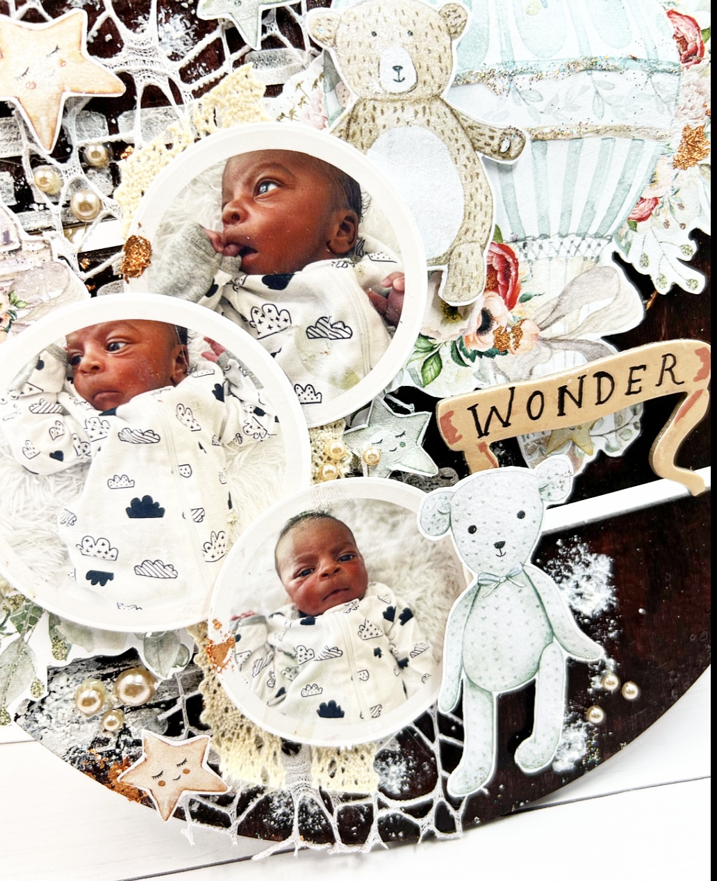 I love the contrast between the dark wood and the lighter papers. I printed out and used a stitched circle die to cut them out.