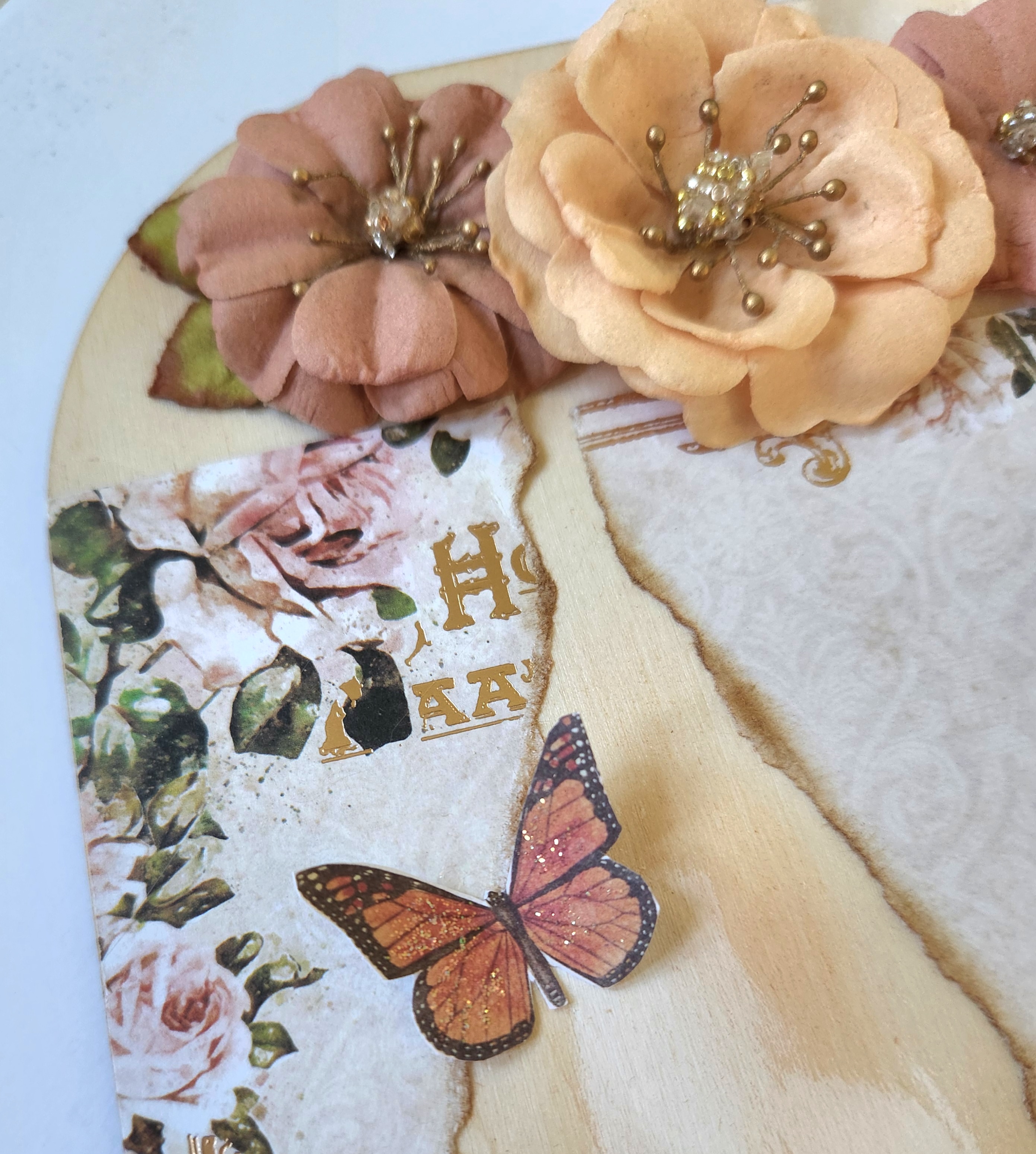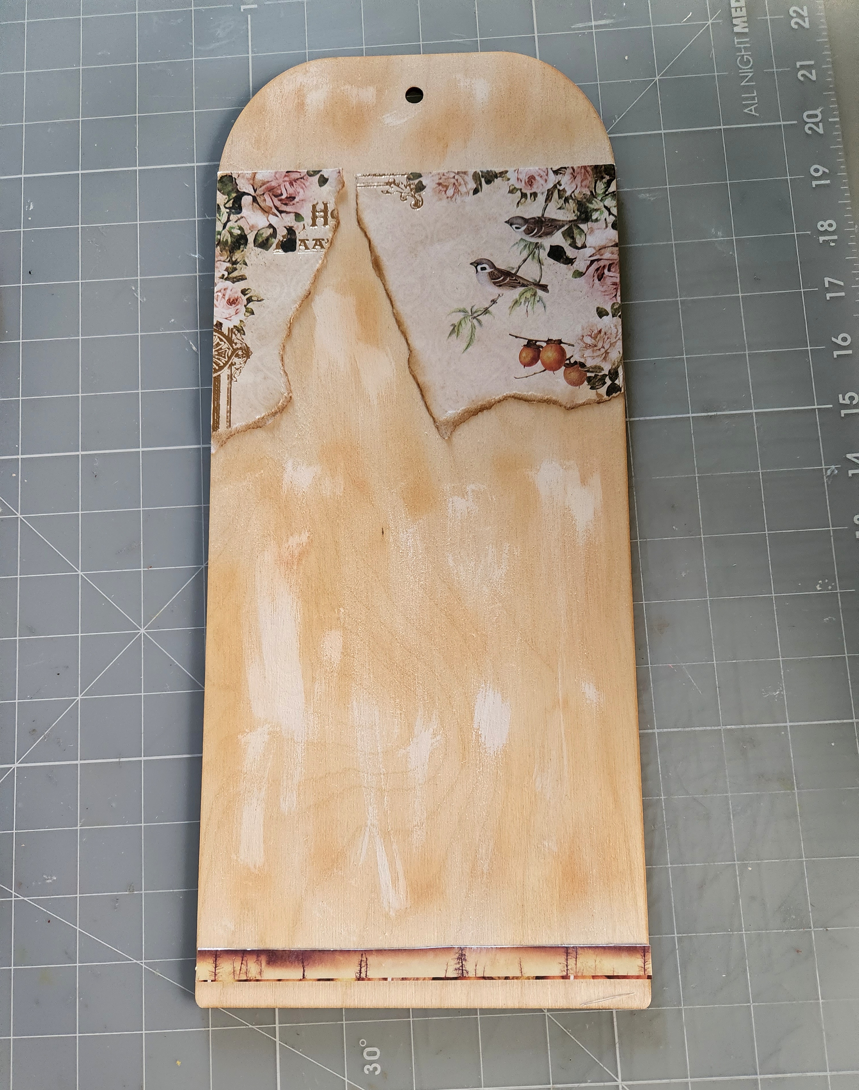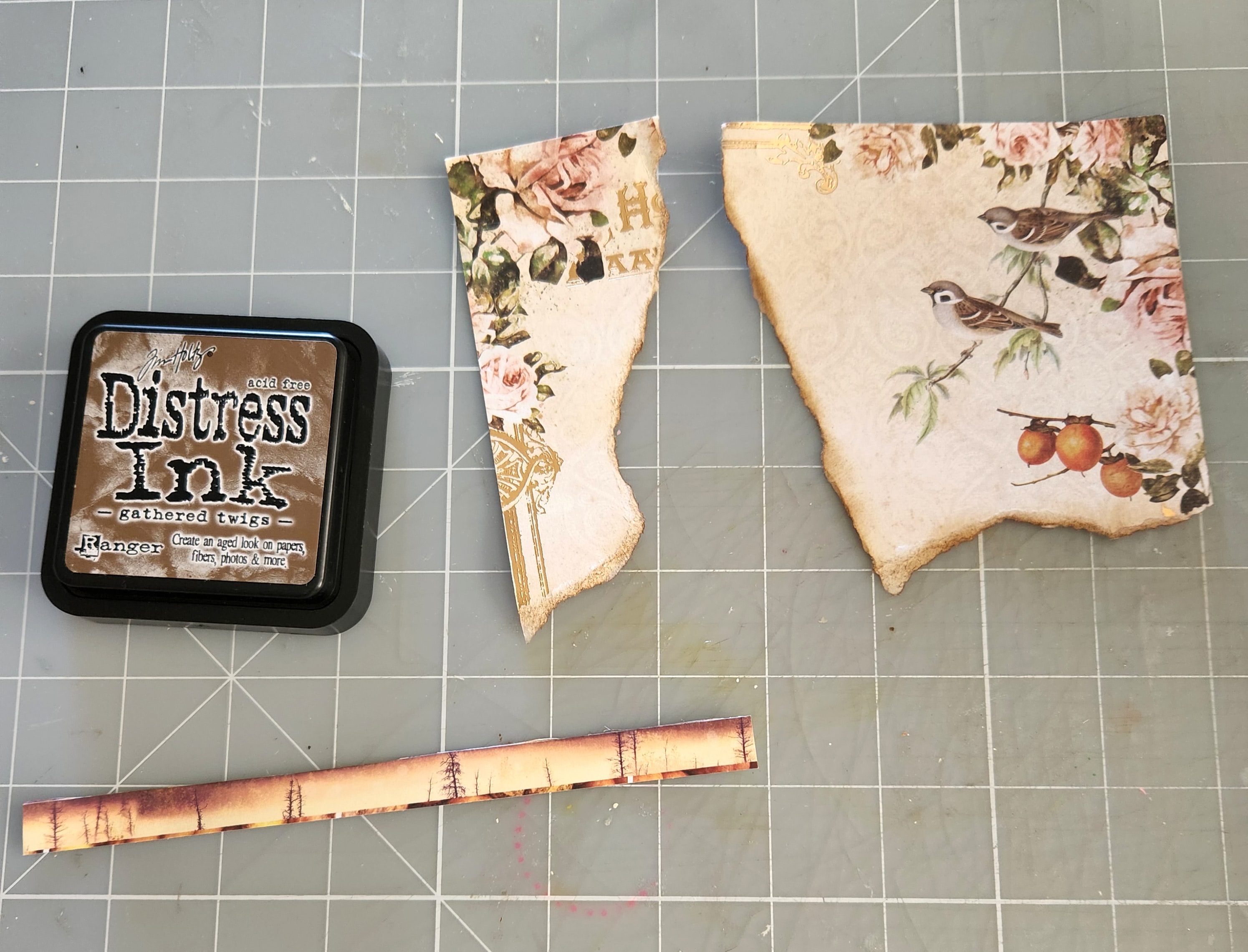 To begin our project, I took and whitewashed some Folk Art Wicker white acrylic paint over the top surface of my wood tag. Then using some Distress Ink Rusty Hinge and a Ink dabber, I lightly brushed the ink over my painted surface. I tore some pieces of paper from Frank Garcia's Autumn Sunset collection and inked along the edges with Distress Ink Gathered Twigs. I cut a strip of paper to fit along the bottom edge of my wood tag.