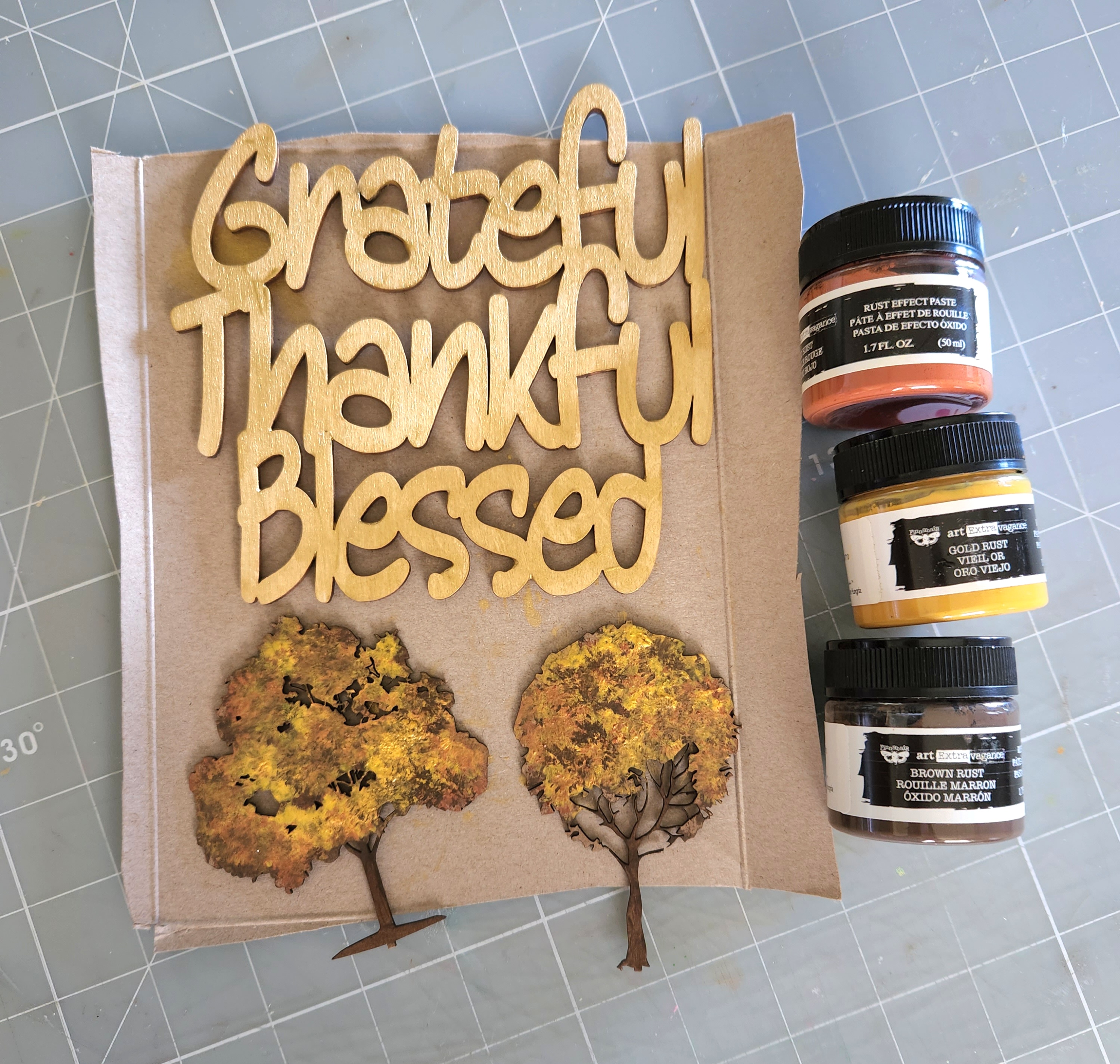 Next take your wood quotes and add some gold acrylic paint over the top. Let dry. Cut apart your chipboard oak trees (save the outside frame for a future project) Then using a pouncing motion and a stiff old paintbrush, I applied Finnibair Rust pastes in brown, red and gold over each oak tree shape. I apply the paste in layers, until I achieve the look I want. I painted the tree trucks and branches with brown acrylic paint. Let dry.