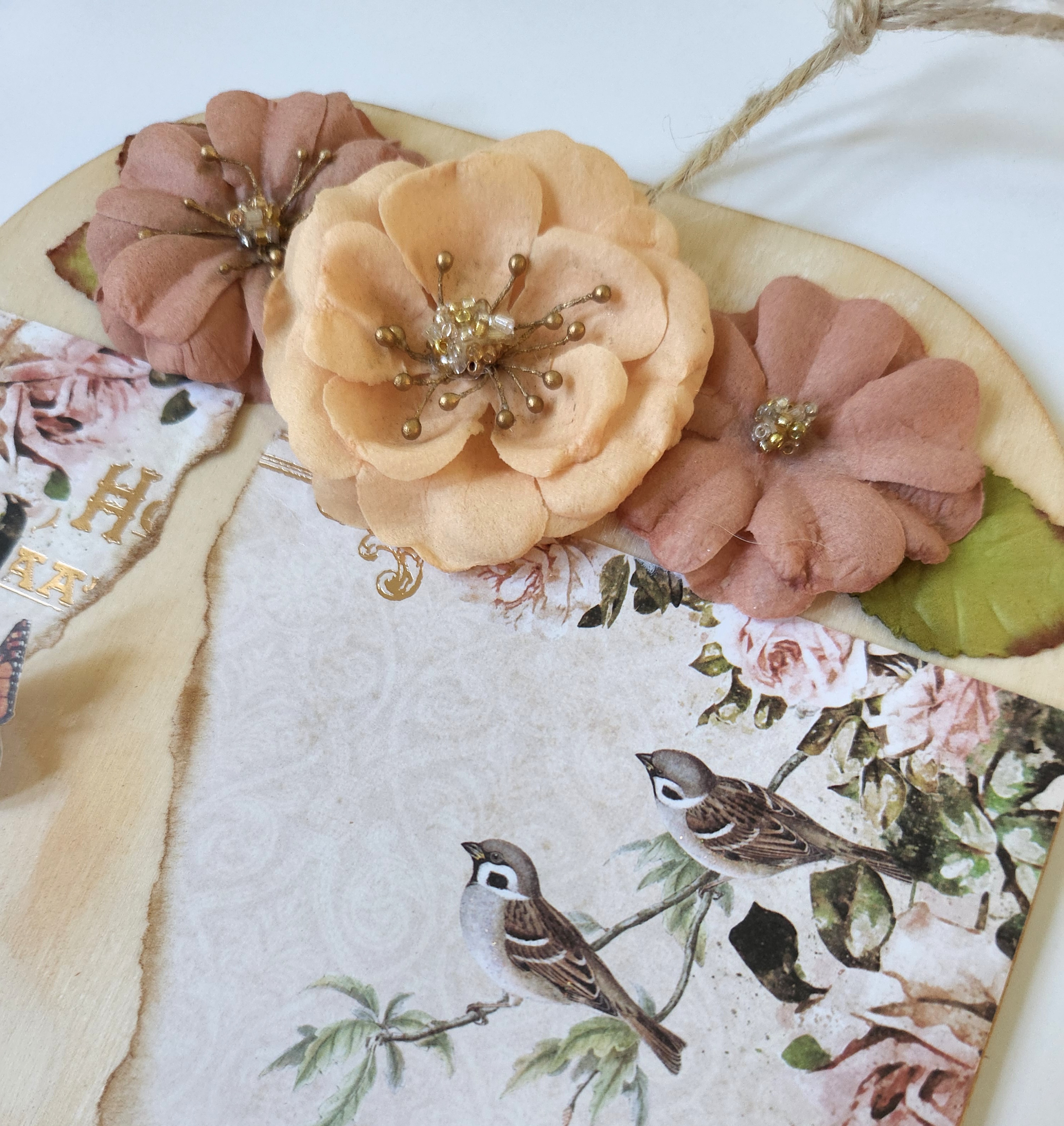 To finish decorating my tag, I added some Prima flowers along the top. Tied a piece of jute cord through the hole at the top. I chose to use a thinner jute cord. But you can certainly use the thicker jute cord included in your bag. I glued a few Prima crystals in scattered places on my tag and some Stickles glitter Diamond on my butterfly wings, birds breaststroke and on the pumpkins!
