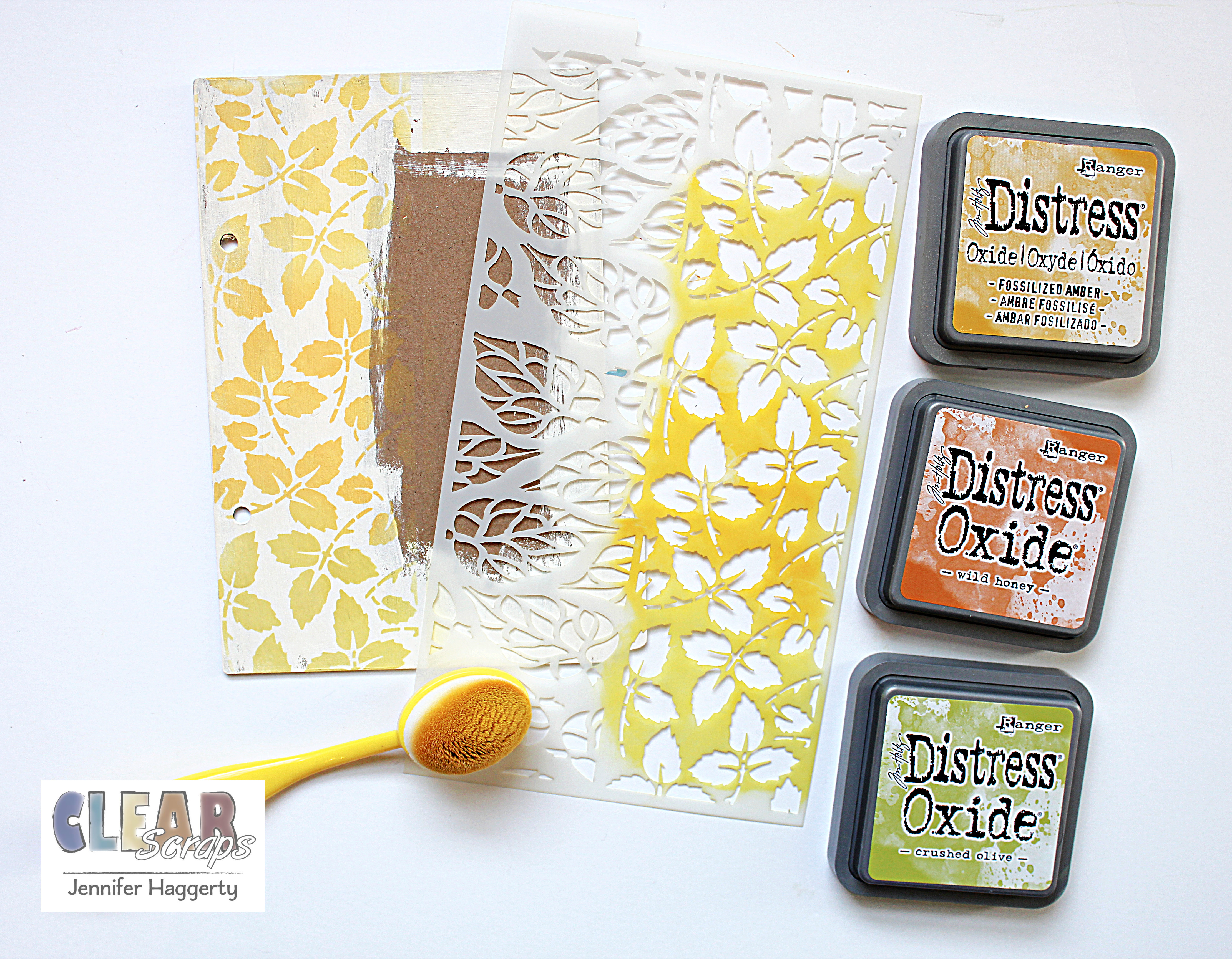 On the front cover, I painted an additional width on the left side so that I could create my own background. Using the 5×9 Leaves Mixer Stencil and Distress Oxide Inks, I blended my colors from light to dark as shown.