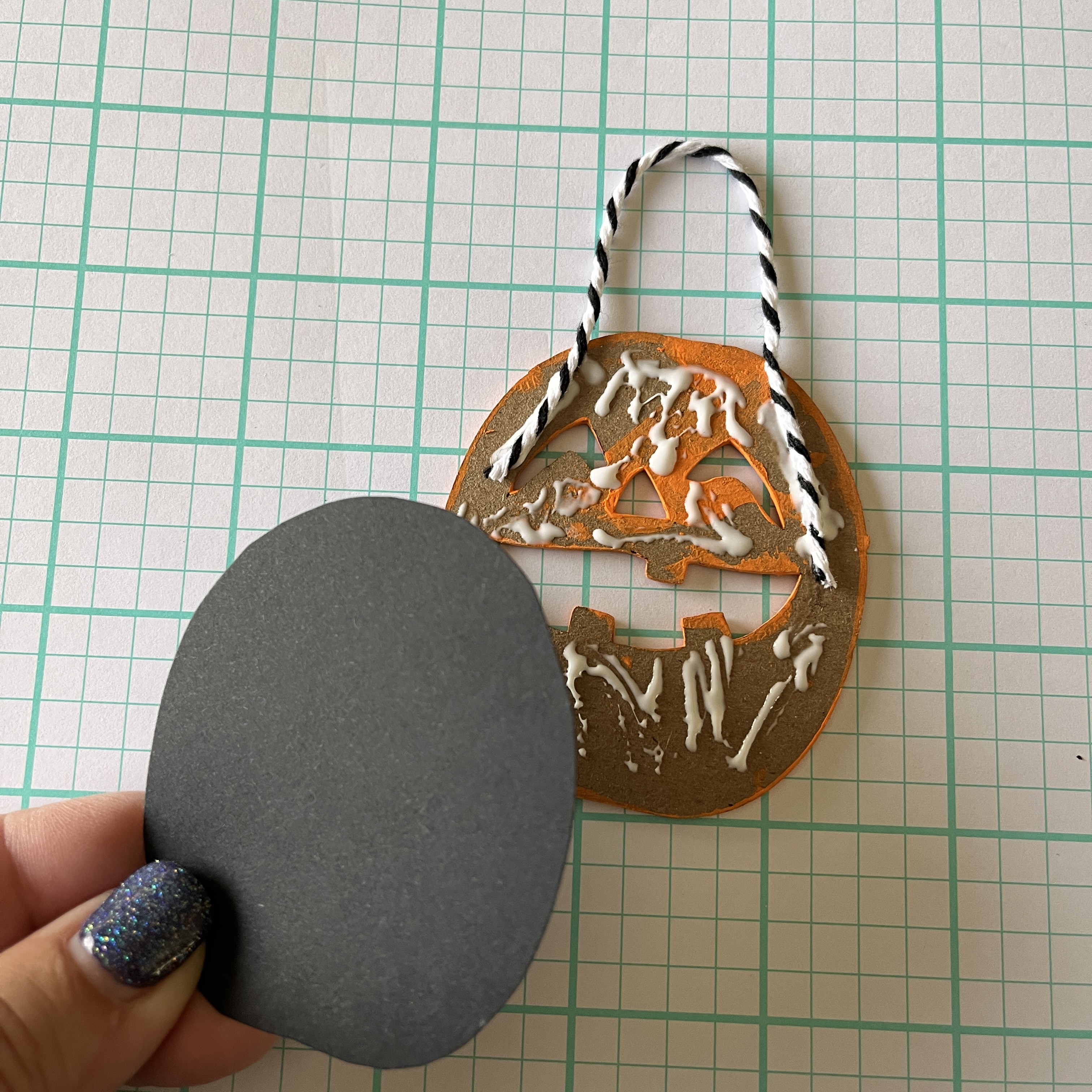 I then took some black card stock and traced it into an oval. I also had some black and white twine, so I trimmed a small piece of this and glued it to the back of the jack o'lantern. Then I glued the card stock over it. Set this piece aside to dry.