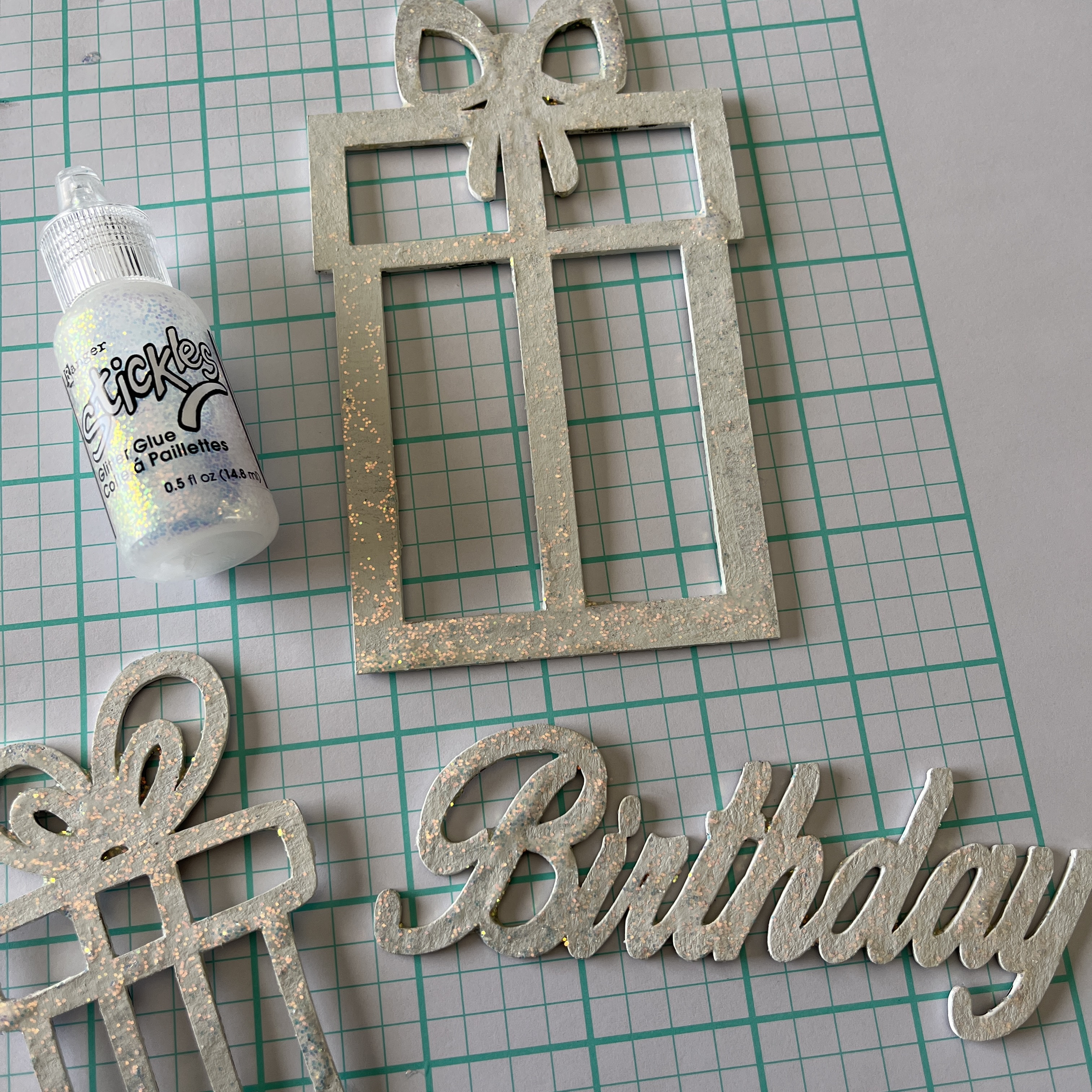For this project, I'm using the Mini Shaker Present Shape along with the Birthday Chipboard Word Title and one of the Two Presents Chipboard Embellishments. I started by painting these with a white acrylic paint. When that dried, I did a coat of sparkle glitter glue on top.