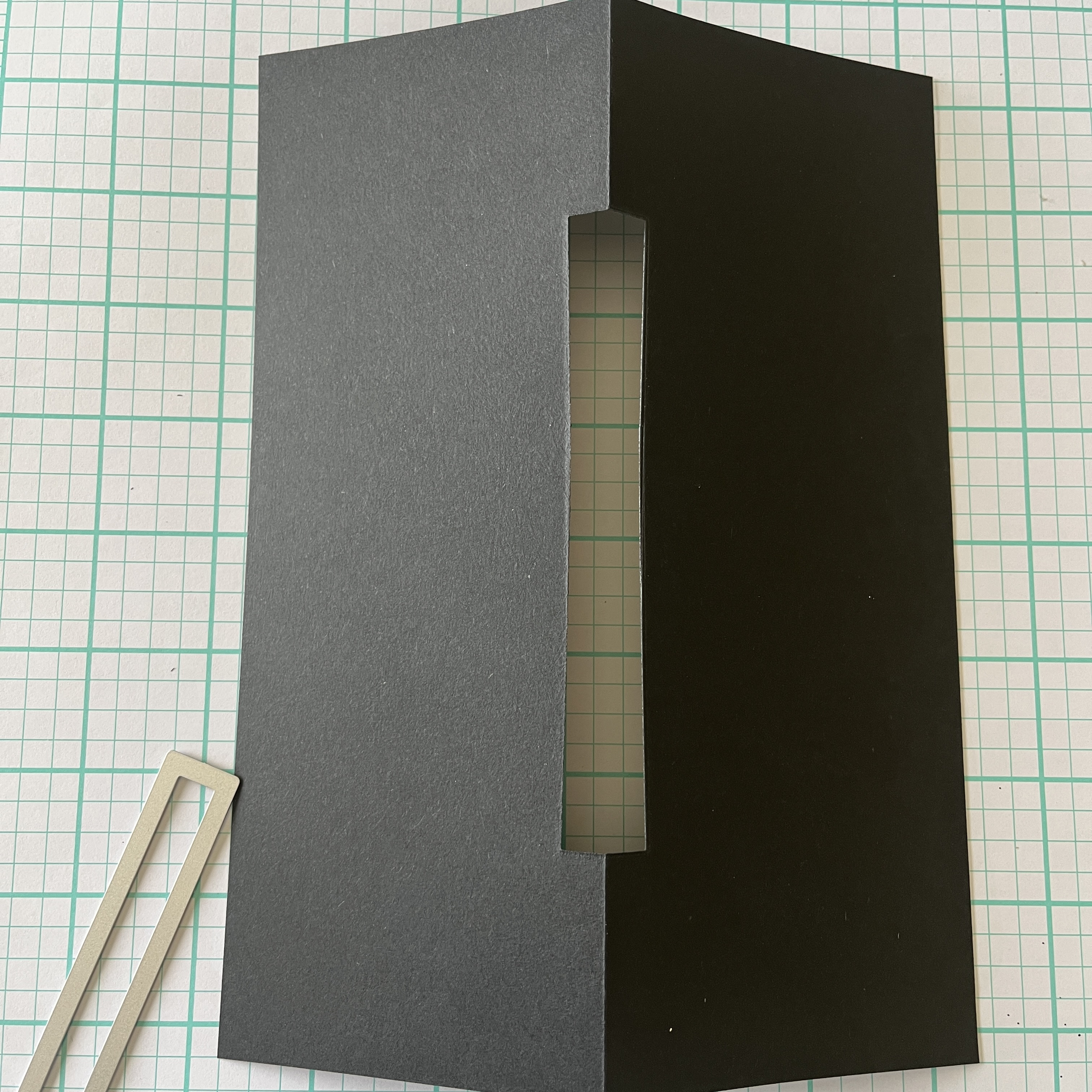 Next, I've taken a piece of black card stock, cut at 6.5" by 8.5" and folded it in half the long way. Then, I proceeded to die cut a rectangular opening in the middle. This worked best for me by using a die cut on the fold and put it through my die cut machine; however, you can simply hand cut a rectangular opening instead. It just needs to be long enough to fit your handles through.
