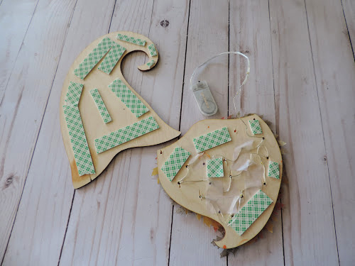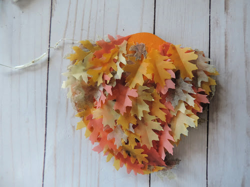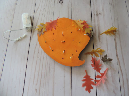 A string of battery-operated lights were placed through the holes. Some (lots) leaves were cut out from vellum.