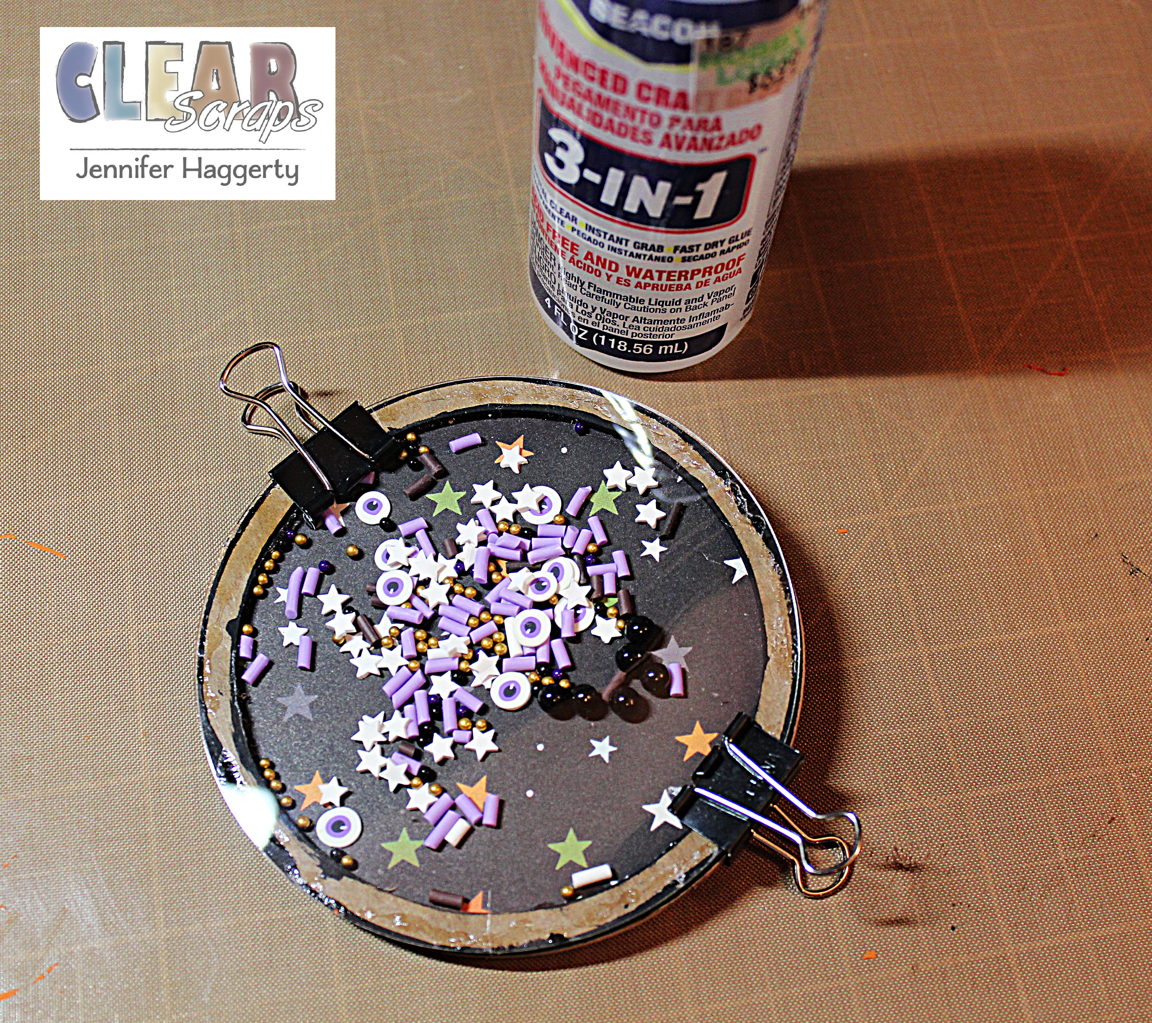 To adhere my acrylic piece, I placed my adhesive on the outside rim of the chipboard. I find it best to use clips to hold my pieces together as the glue dries.