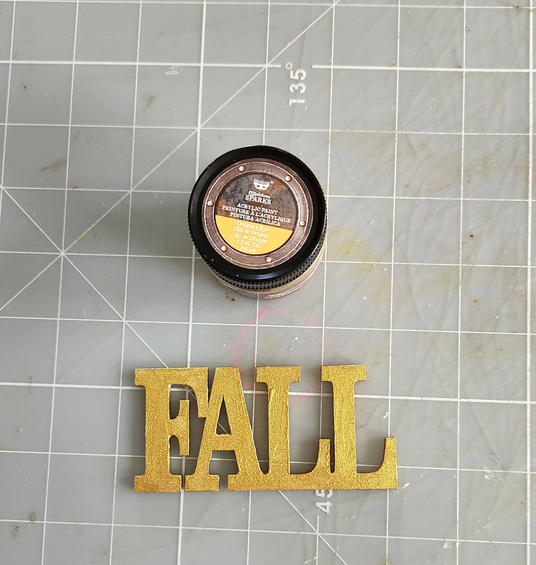 Remove both Word n Shape pieces from your package. I painted my Fall words using Finnibair Sparks "Dragon's Eye" acrylic paint. This paint adds a nice shimmer. Set aside to dry.