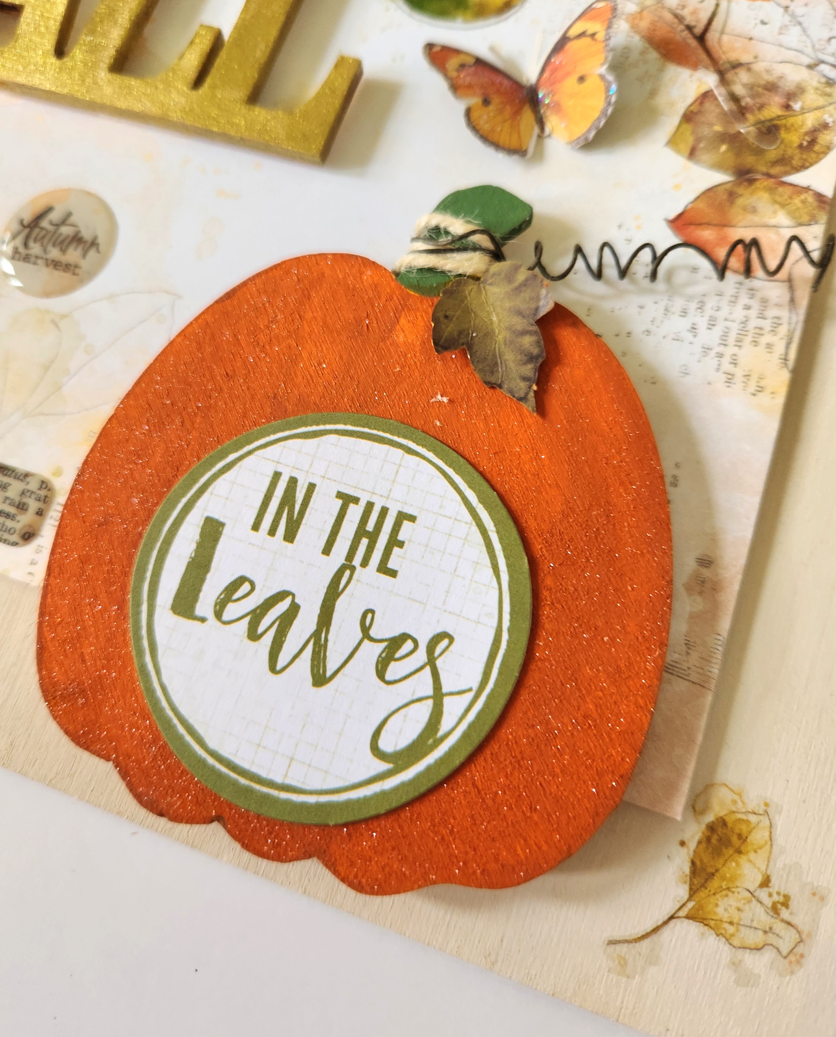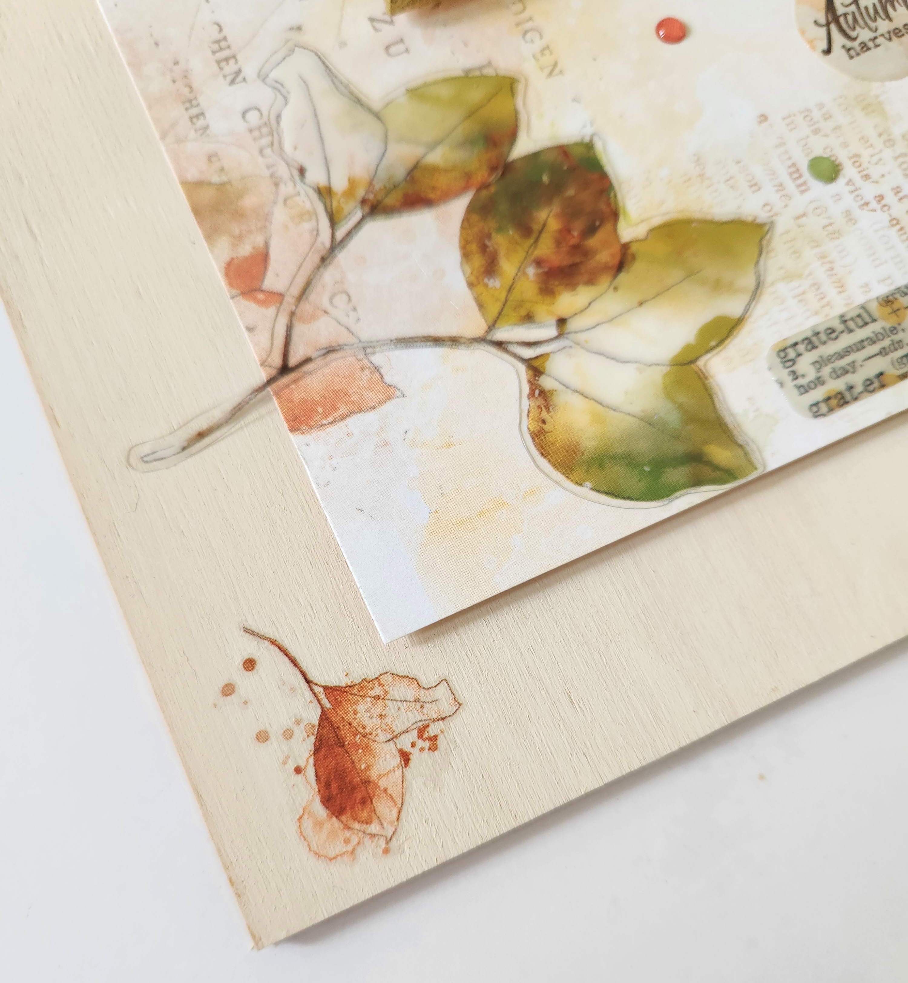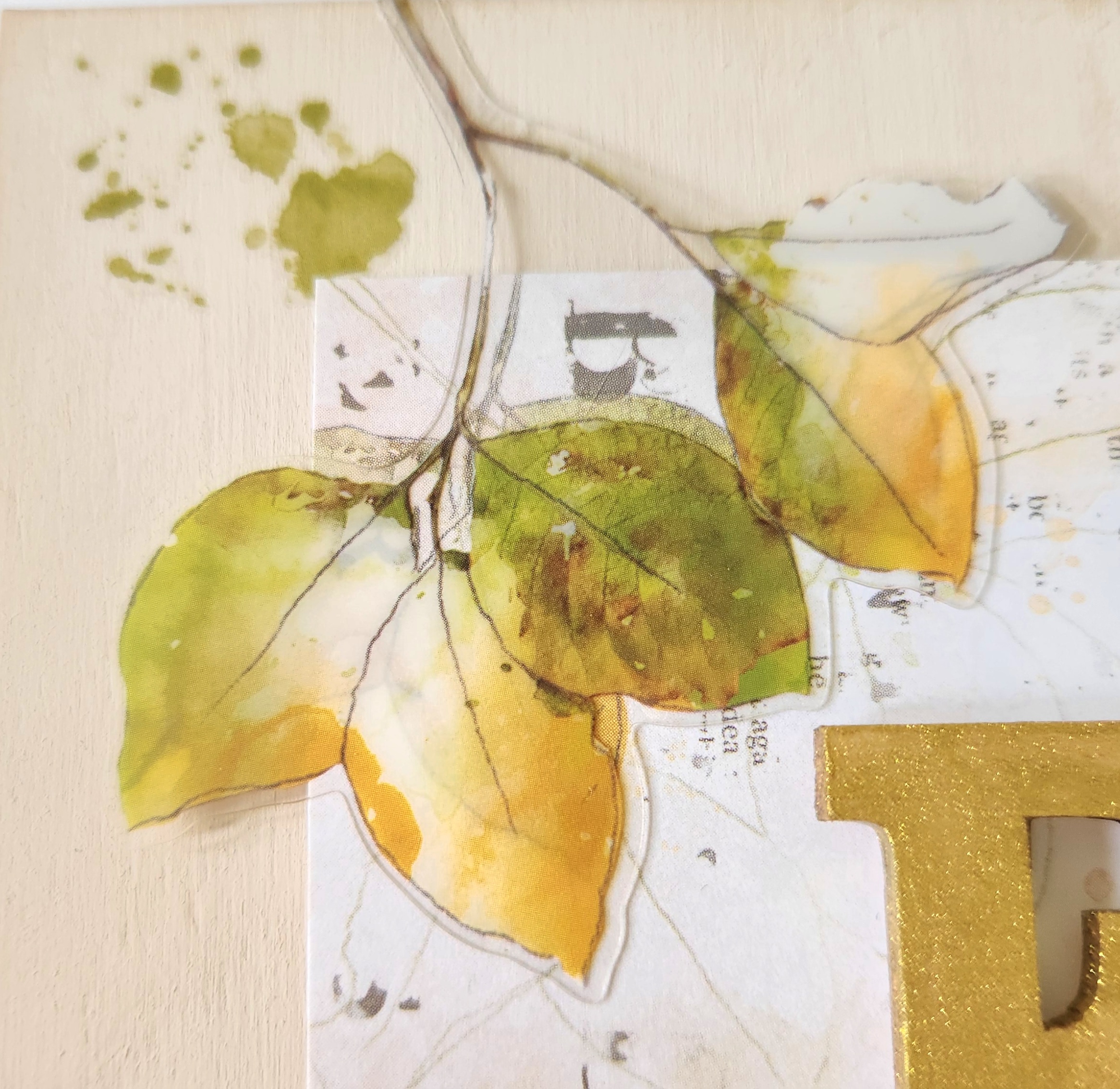 Next I chose one of the 6×8 papers to use as my background base. I adhered in the center of my wood shape using foam tape. Then I applied some of the rub-ons in scattered areas. I used some ink blotches and leaves rub -on designs to decorate the corners. From the acetate diecut package, I chose some of the leaves pieces and adhered them over the matching images on my paper.