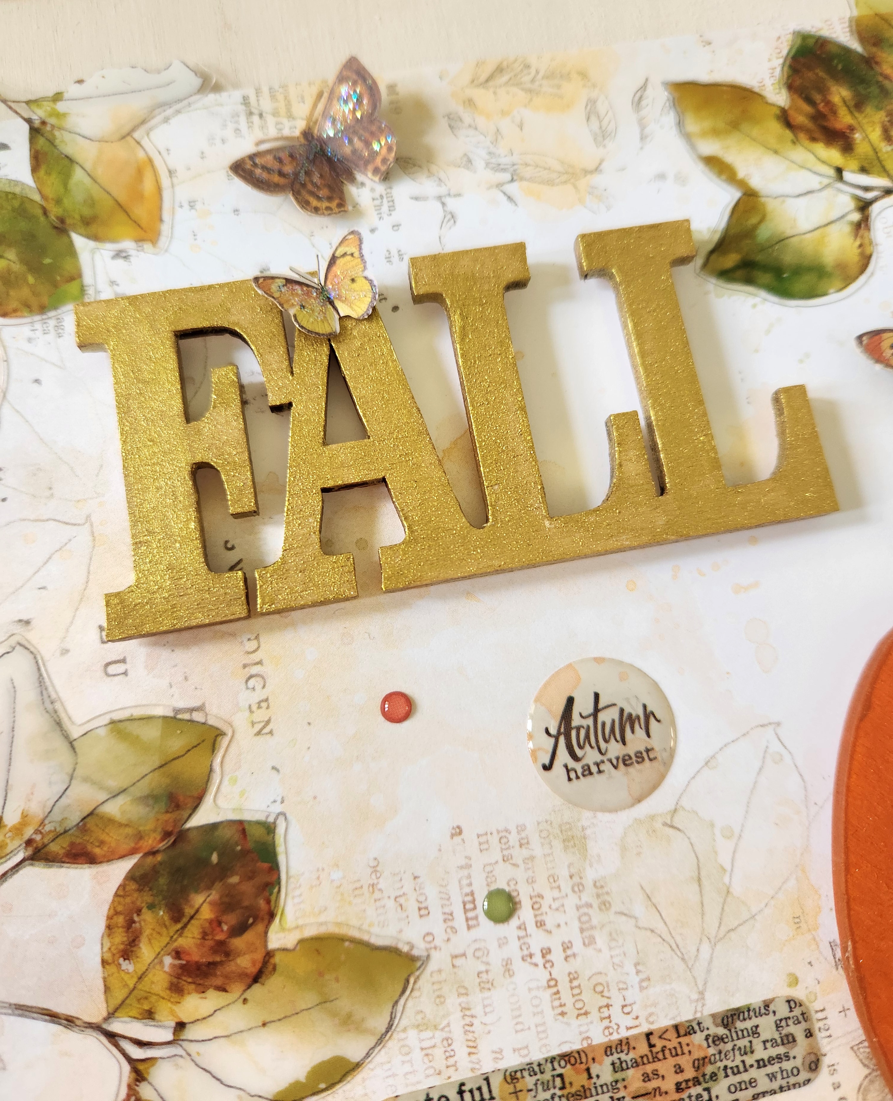 Using foam dots, I adhered my Fall words in the center of my design wood base. I added a small butterfly diecut on the top of the letter A, and bent the wings slightly upward. Here's a closeup for you!