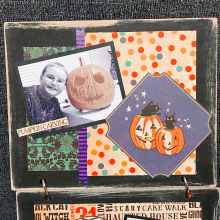 I used one of the pumpkins from the Jack O Lantern Chipboard Embellishments to add to the cover design. I painted it with several shades of orange paint that were barely blended together. I loosely outlined the openings for the eyes, nose and mouth with cream paint and painted the stem brown. I then backed the jack-o-lantern with black cardstock.