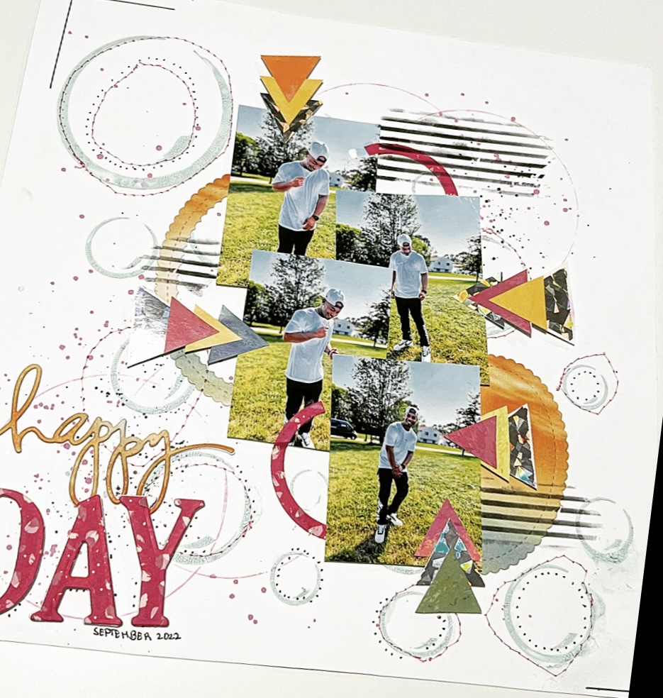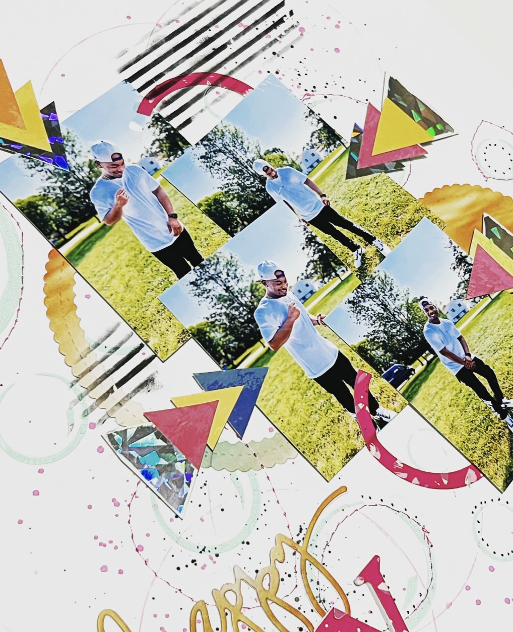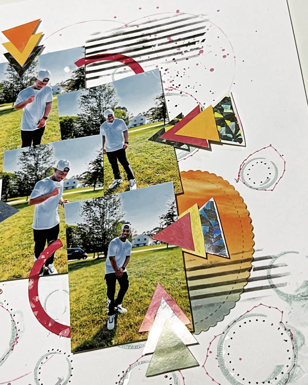 When I decided to do this layout of my son, and saw how vibrant the photos were.. I knew I had to use the bag! I cut out a ton of the triangles from the bag and added them around the layout. I used some scraps, that I also could not throw away and die cut different types of circles for the background of my layout.